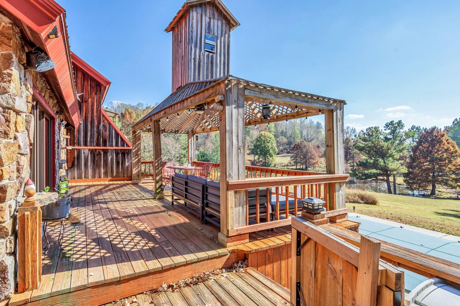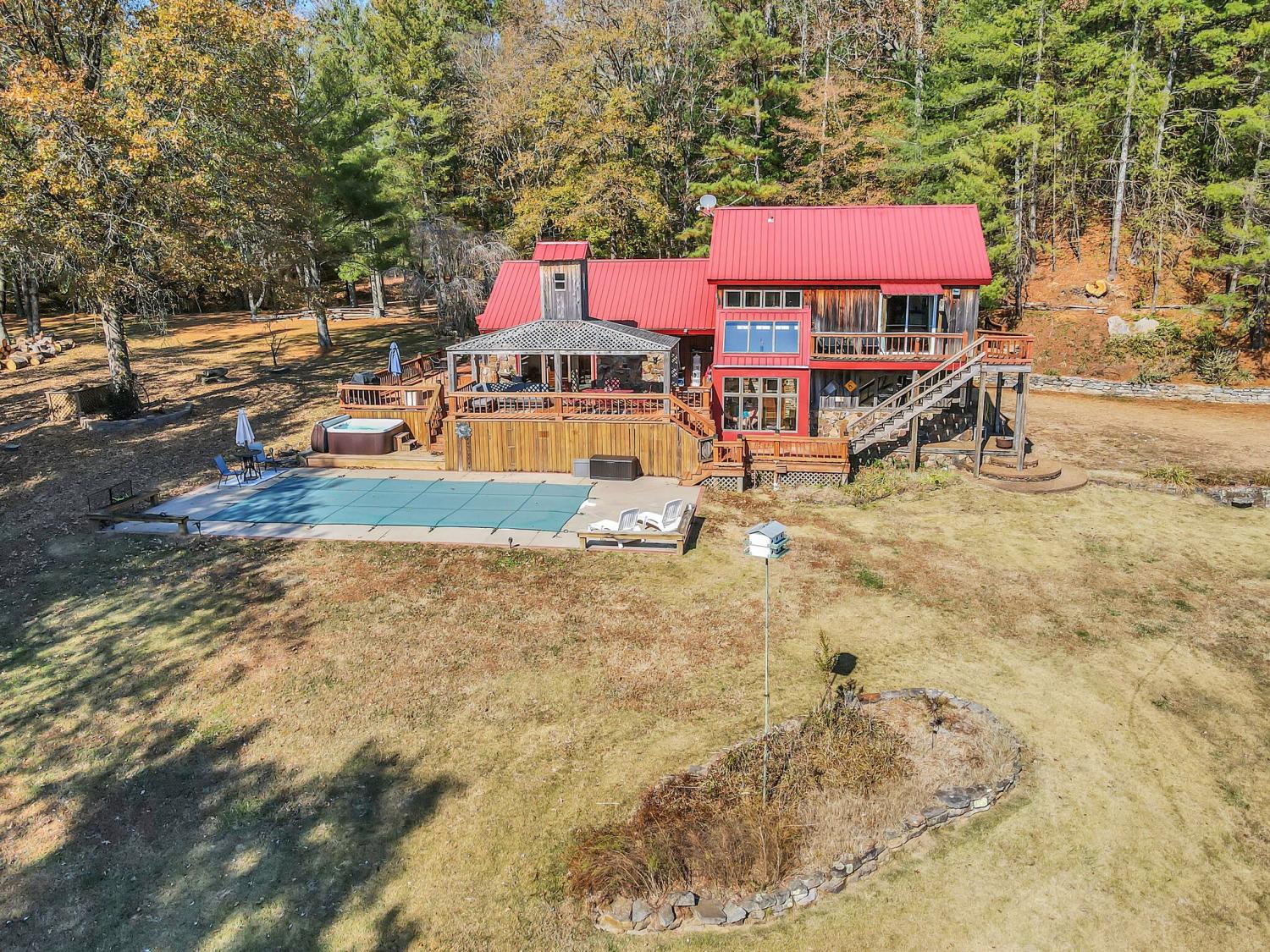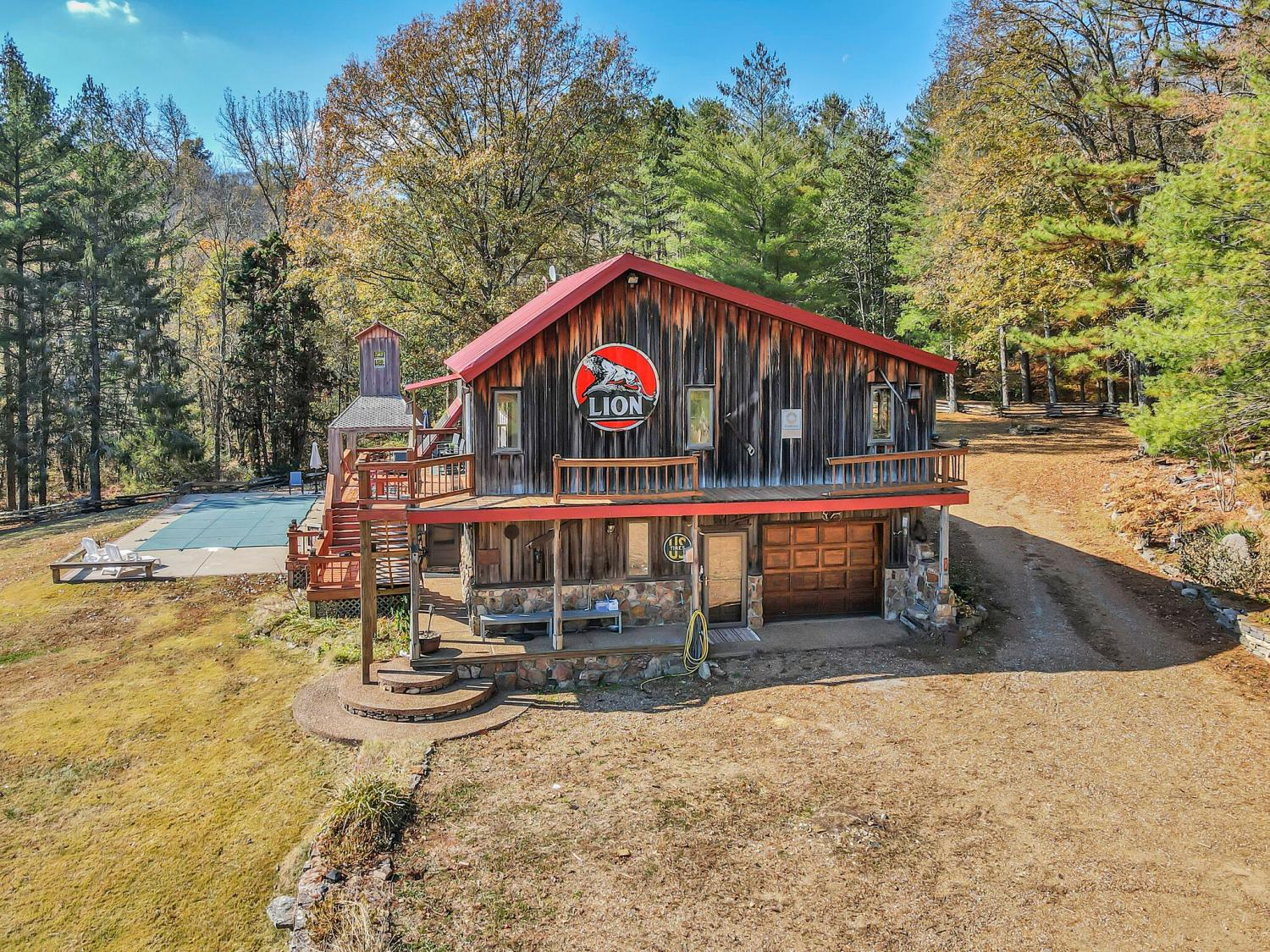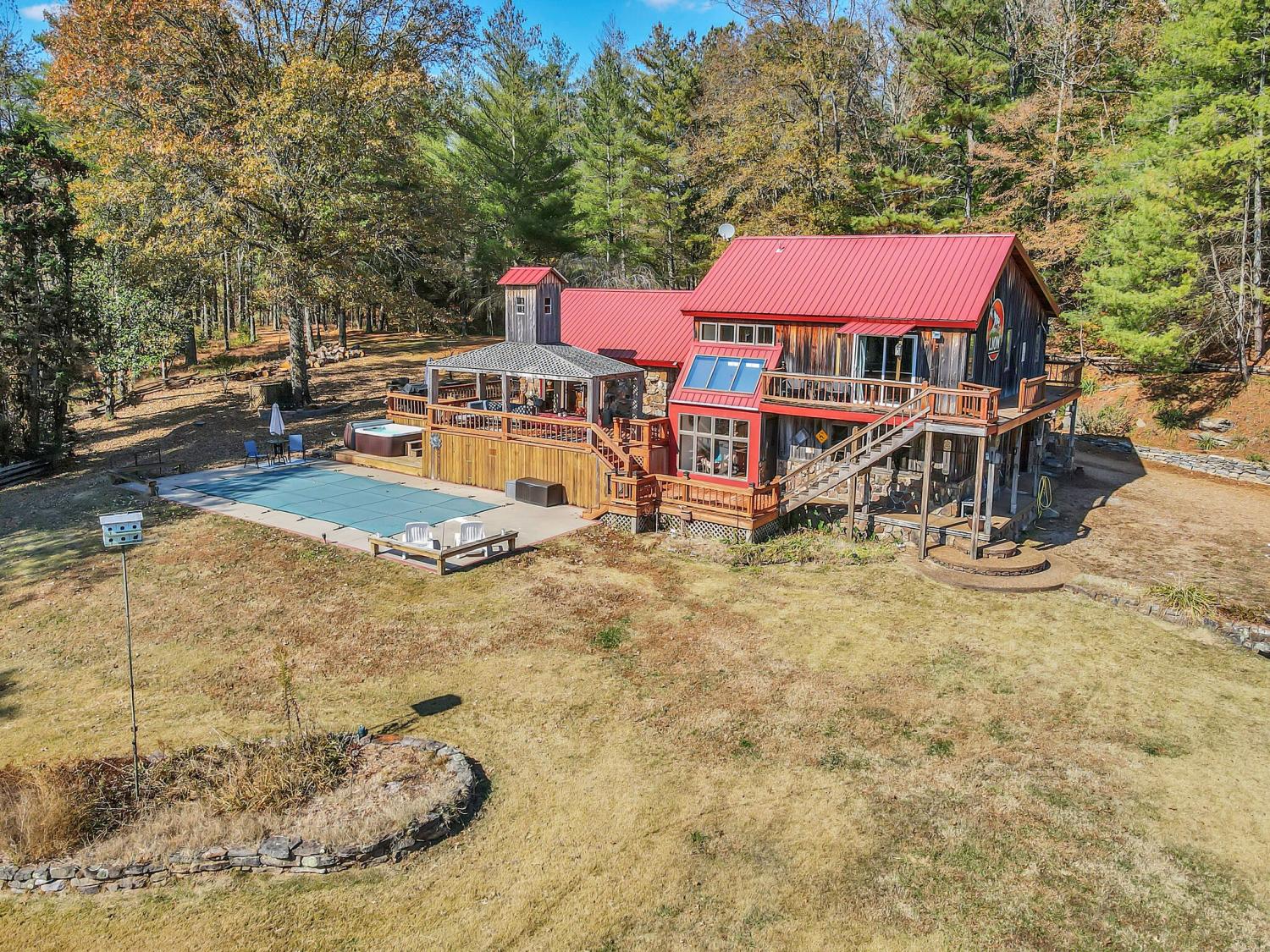 42 acres of spectacular views and peace and quiet! Home comes equipped with hi-speed Internet, game room, wet bar, security system, built-in gun safe into wall, whole house vac system, passive solar/sunroom, inground pool and hot tub. Grounds include 100' well, spring fed lake with bass, hunting posts, 3 hole golf course, multiple patio and decks, Koi pond, fire pit, detached shop/shed with Polaris and tractor (can convey), California fur wood and Arkansas Rock exterior. 10 minutes to historic downtown Pulaski. Currently serving as a very popular AirBNB, all items in house/on grounds can convey.