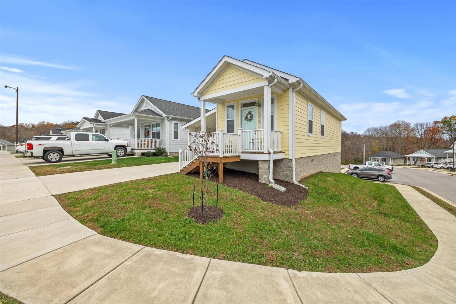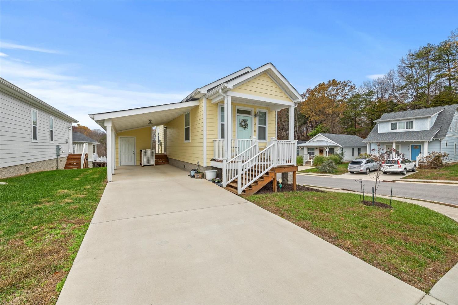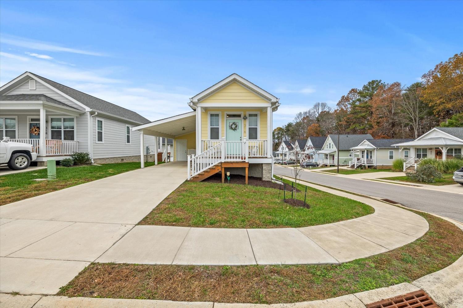 Like new cottage style home located close to town and near all of the necessities! You have a corner lot providing a driveway that leads into a carport + outdoor storage, as well as a covered front porch. Walking in is your open concept living area and kitchen with island space. Down the hall is your first bedroom + full bath with a shower/tub combo. The back of the home also offers another bedroom + bathroom with a walk- in shower as well as your stackable washer dryer area. All the closets have great shelving systems for storage. The neighborhood provides sidewalks and a easy, modern living style! 13 month home warranty for peace of mind.