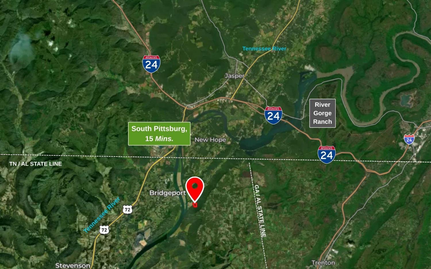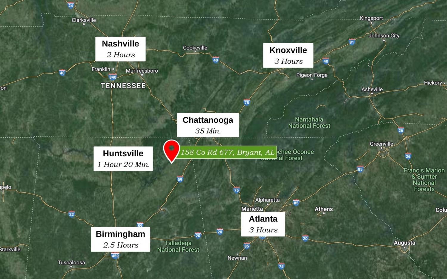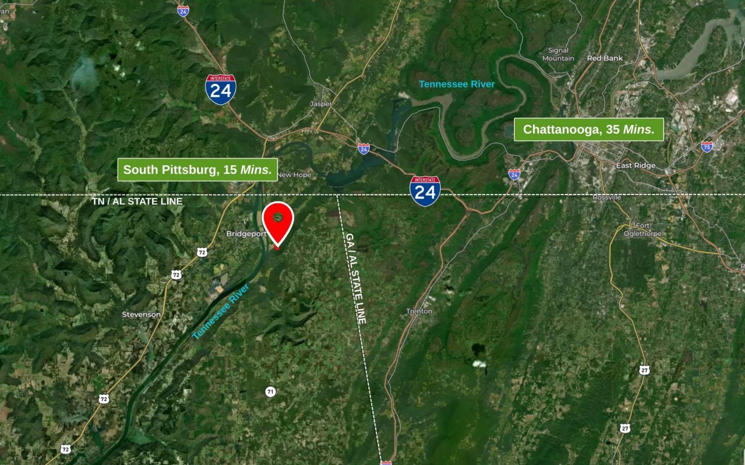 From Downtown Chattanooga: Take I-24 W for 16 miles to Exit 161 Haletown/New Hope Exit. Turn left on Hwy 156 South. In 6 miles, turn left on Lakeshore Drive, which becomes AL County Rd 91. In 5 miles, turn left onto County Rd 677. Property is on the right.