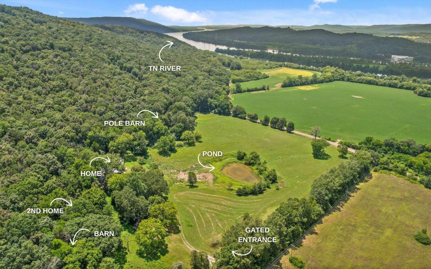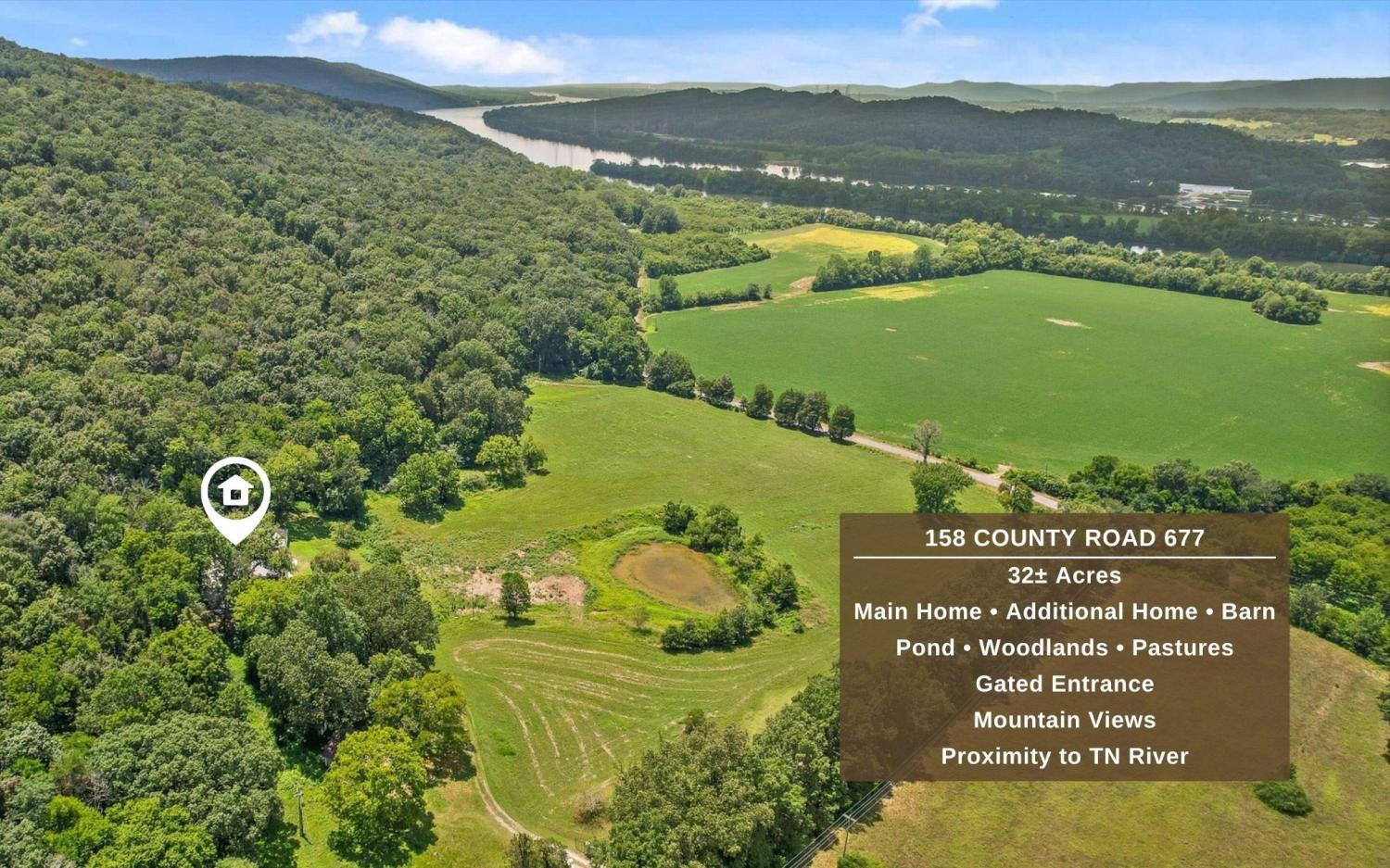 WATCH VIDEO: https://youtu.be/l_OAZzQ0tJI - UNRESTRICTED & UPDATED just 35 MIN. to CHATTANOOGA. Embrace a refined rural lifestyle with this rare 32± ACRE retreat. Whether your dream includes a chicken coop, horses, or simply peaceful living near the water, this property delivers. Enjoy quick access to the TN River with public boat launches just minutes away, and reach dining, shopping, medical, and industry in Bryant, Bridgeport, Jasper, and South Pittsburg within 25 minutes. This property offers the perfect balance of privacy and convenience. Updated 1-level home, SPRING-FED POND, private woodlands, barn, gated entrance. Appreciate the property's natural beauty, punctuated by wrought iron fencing and serene woodlands. The large front porch captures breathtaking VIEWS, while the private back patio creates an ideal outdoor retreat. Inside, discover the single floor plan, thoughtful design, and elegant finishes throughout. The heart of this home is its airy living room and dreamy kitchen, featuring stainless appliances, spacious island, and modern fixtures. The primary suite offers luxury with dual vanities, soaking tub, tiled shower, and massive walk-in closet. A well-designed mud room with built-in shelving provides the perfect drop zone, joining the laundry room. Additional structures include a customizable second building perfect for guests, rental, shop, or a hobby retreat, Charming BARN for outdoor equipment storage. 34 minutes to TVA Processing Center in Hollywood, AL and within 2.5 hours of Nashville, Knoxville, and Atlanta. 2 hours to BNA, Nashville's International Airport. This property offers the perfect balance of modern comfort, natural beauty, and rural freedom - a rare opportunity to claim your own private retreat with unmatched convenience. (Buyer to verify square footage. Some images may be virtually staged.