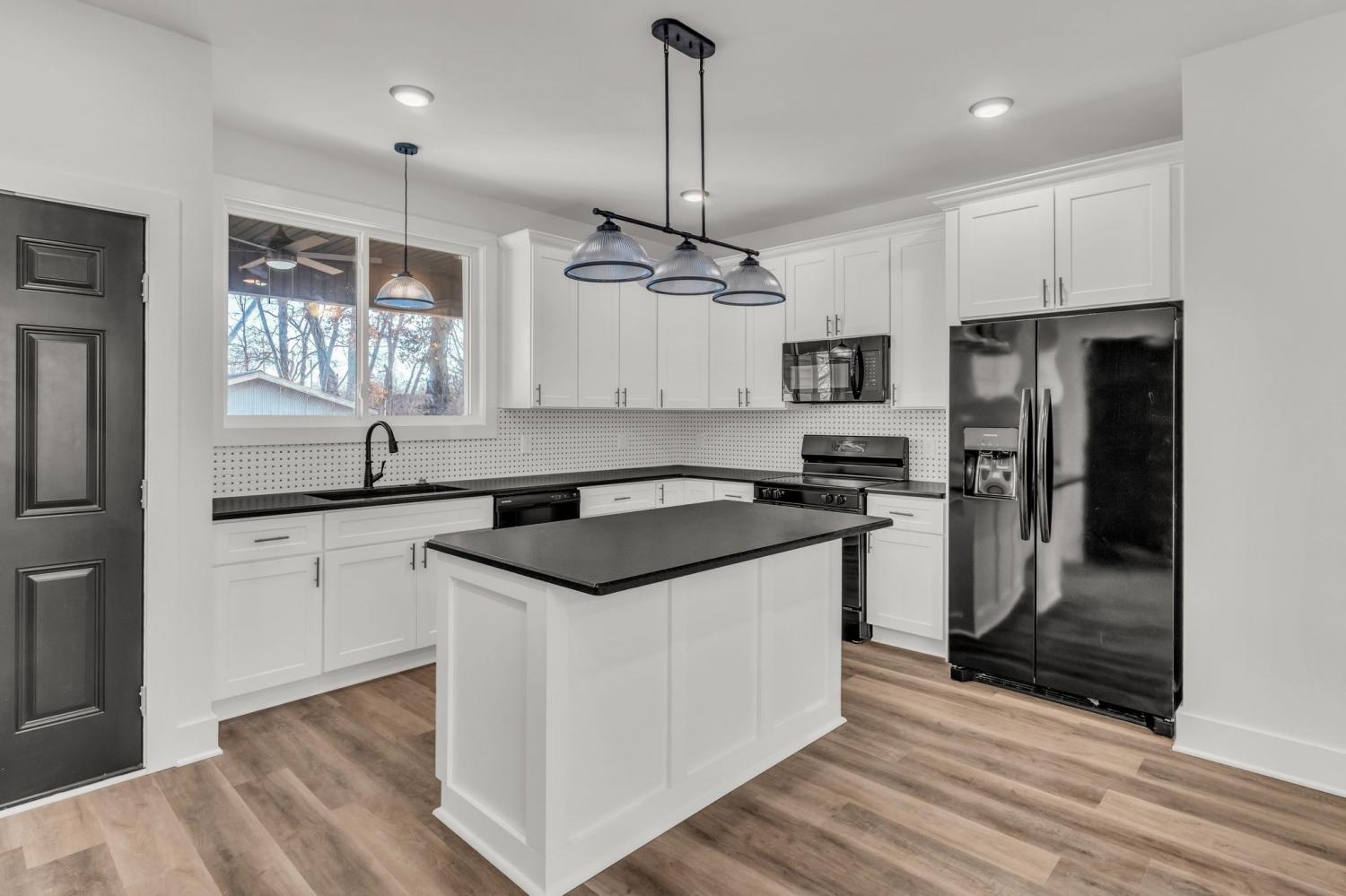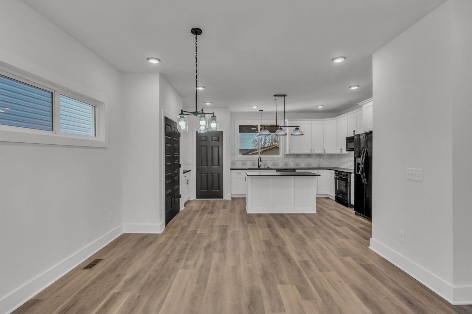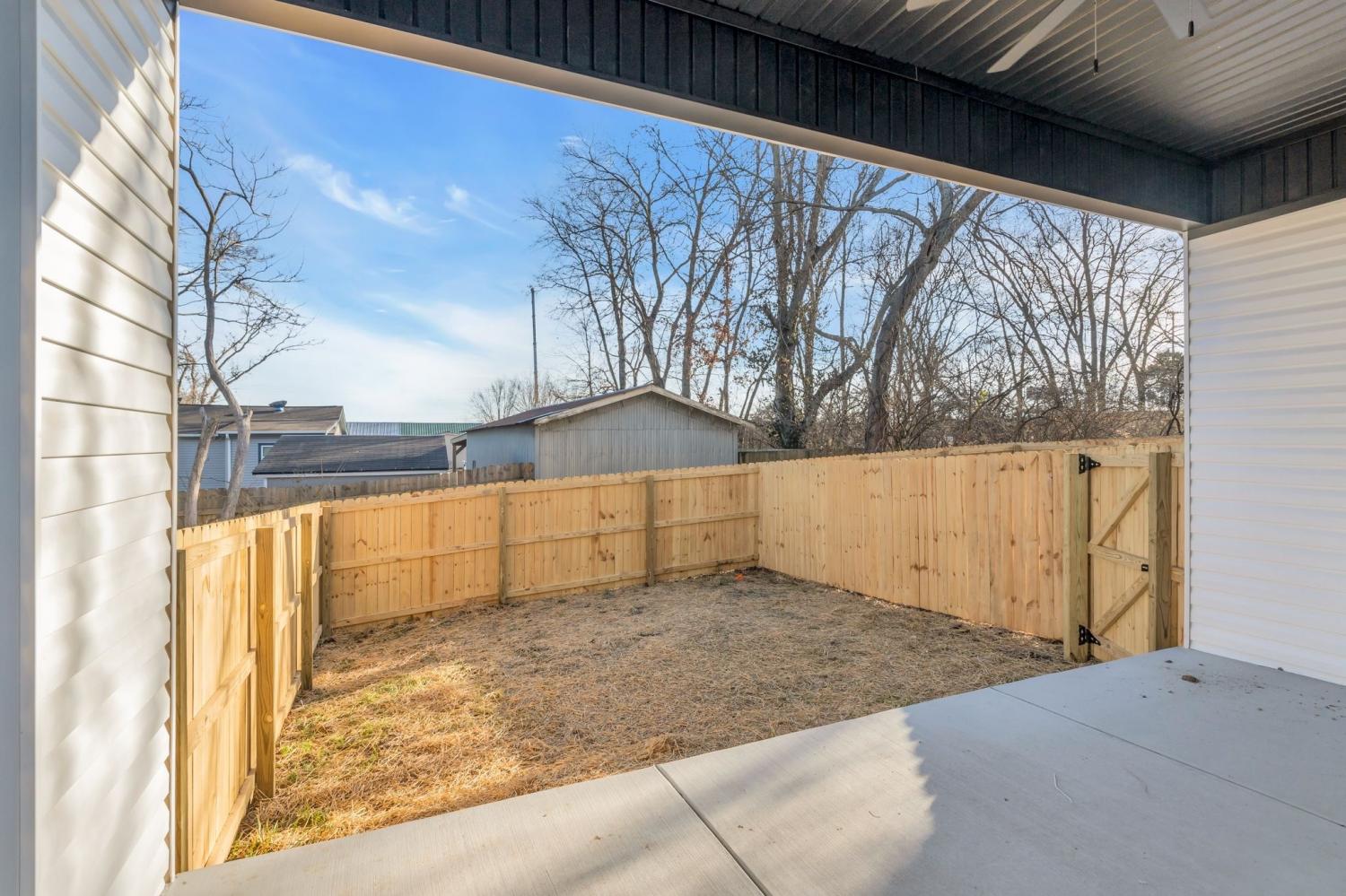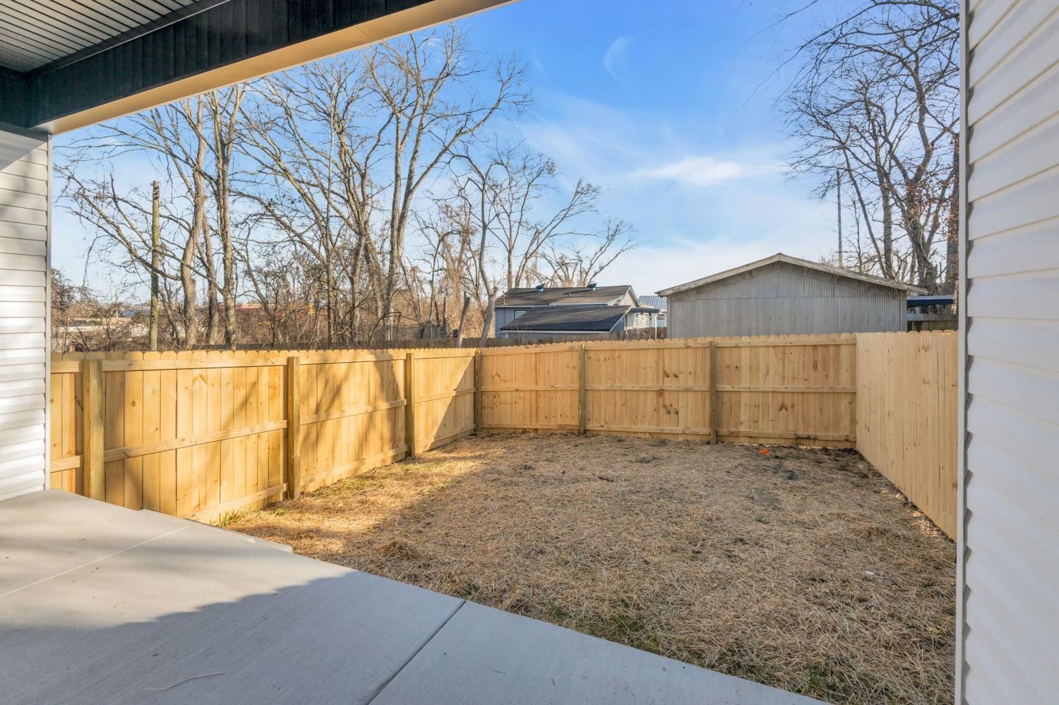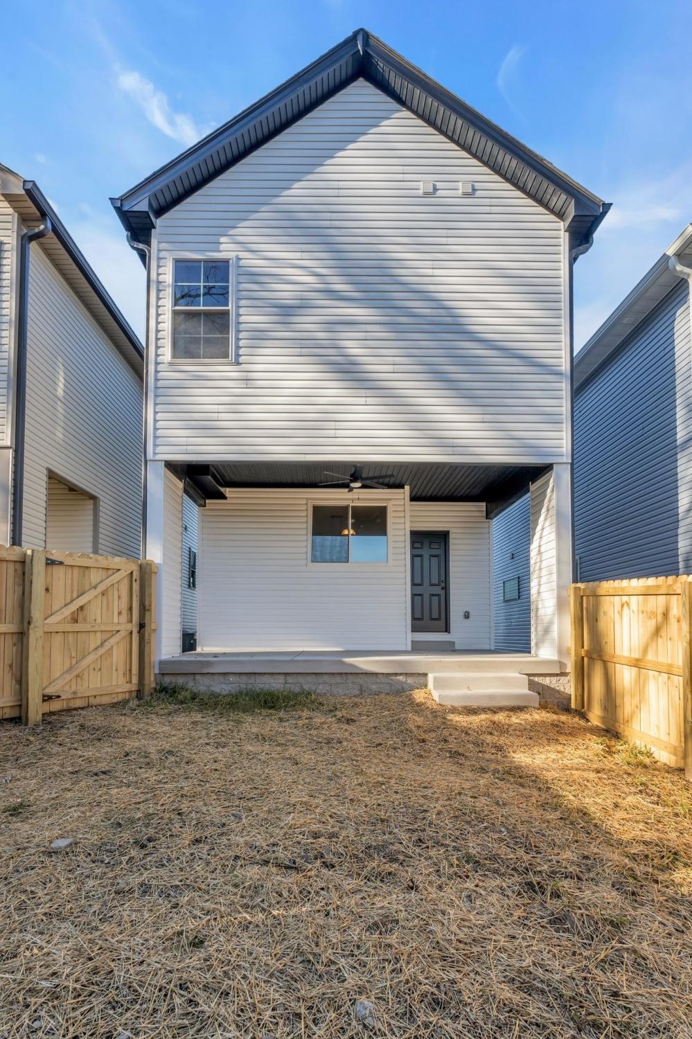 This stunning new two-story home features a welcoming covered front porch and a spacious covered deck, perfect for outdoor living. With three bedrooms and two and a half baths, the home offers a well-designed, open-concept great room, kitchen, and dining area, ideal for modern living and entertaining. The main level includes a convenient half bath, while the fenced backyard provides privacy and a shaded retreat, with mature trees enhancing the outdoor space. The interior boasts top-of-the-line appliances, custom cabinetry, and high-quality flooring, with elegant tile detailing in the bathrooms. Double-hung windows add to the home's efficiency and aesthetic appeal.
