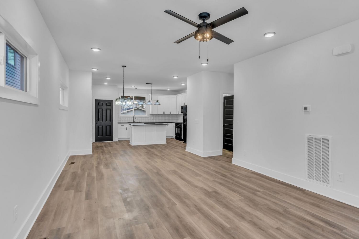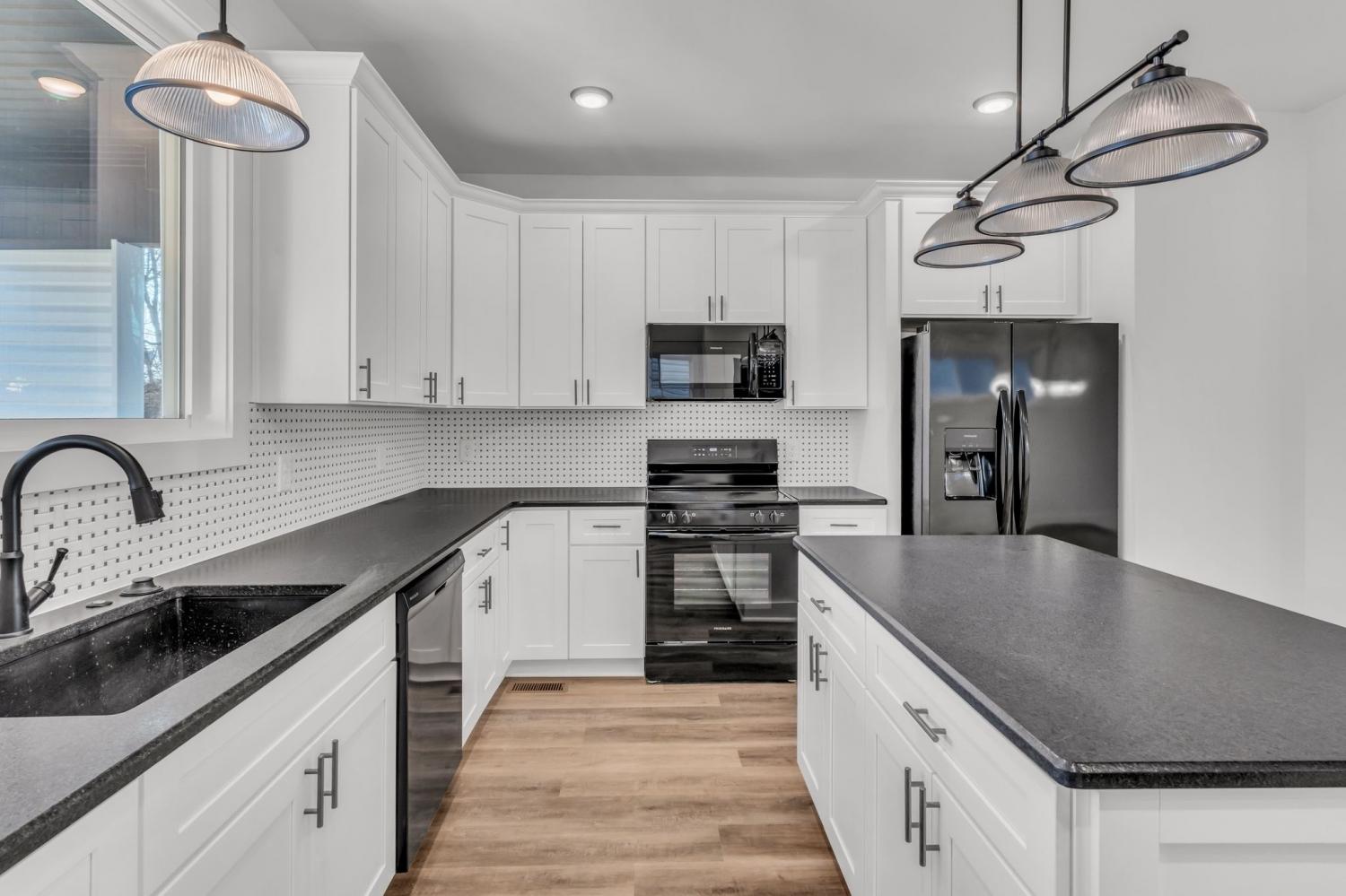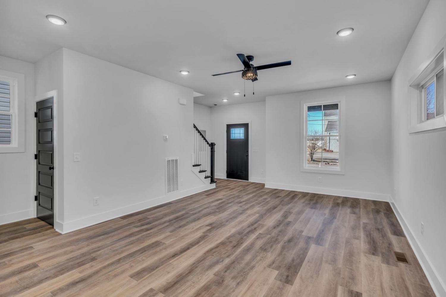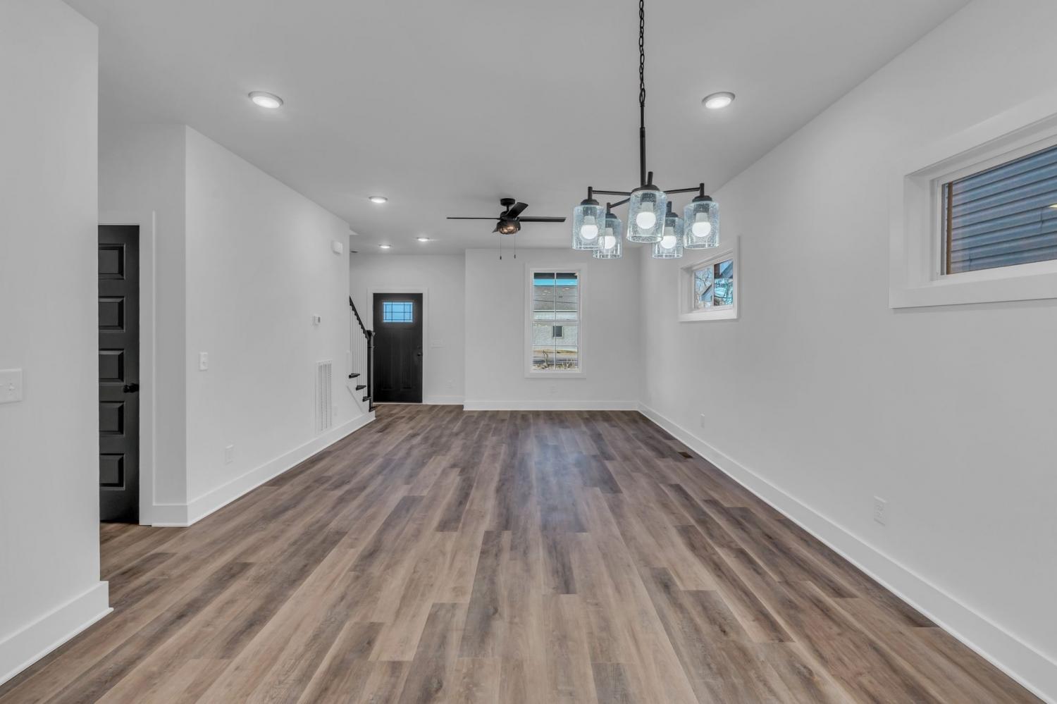 This stunning new two-story home features a welcoming covered front porch and a spacious covered deck, perfect for outdoor living. With three bedrooms and two and a half baths, the home offers a well-designed, open-concept great room, kitchen, and dining area, ideal for modern living and entertaining. The main level includes a convenient half bath, while the fenced backyard provides privacy and a shaded retreat, with mature trees enhancing the outdoor space. The interior boasts top-of-the-line appliances, custom cabinetry, and high-quality flooring, with elegant tile detailing in the bathrooms. Double-hung windows add to the home's efficiency and aesthetic appeal.
