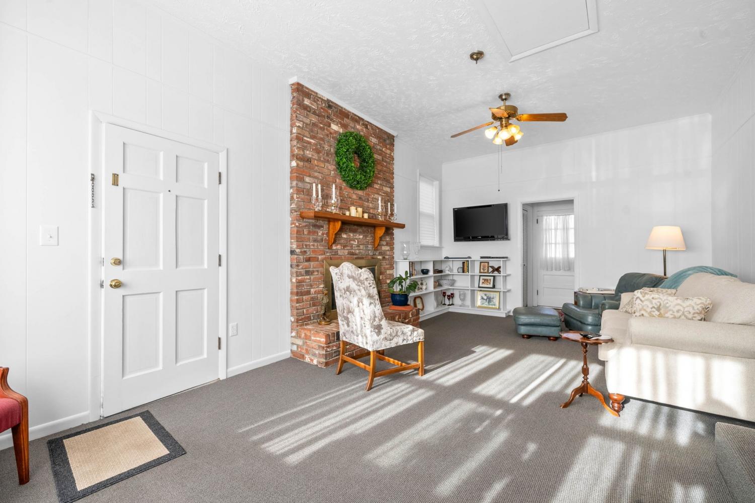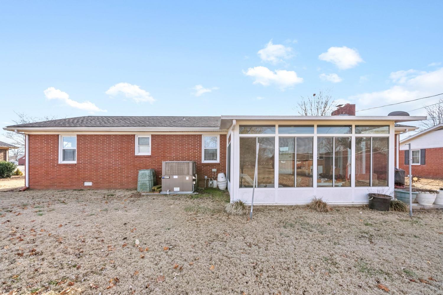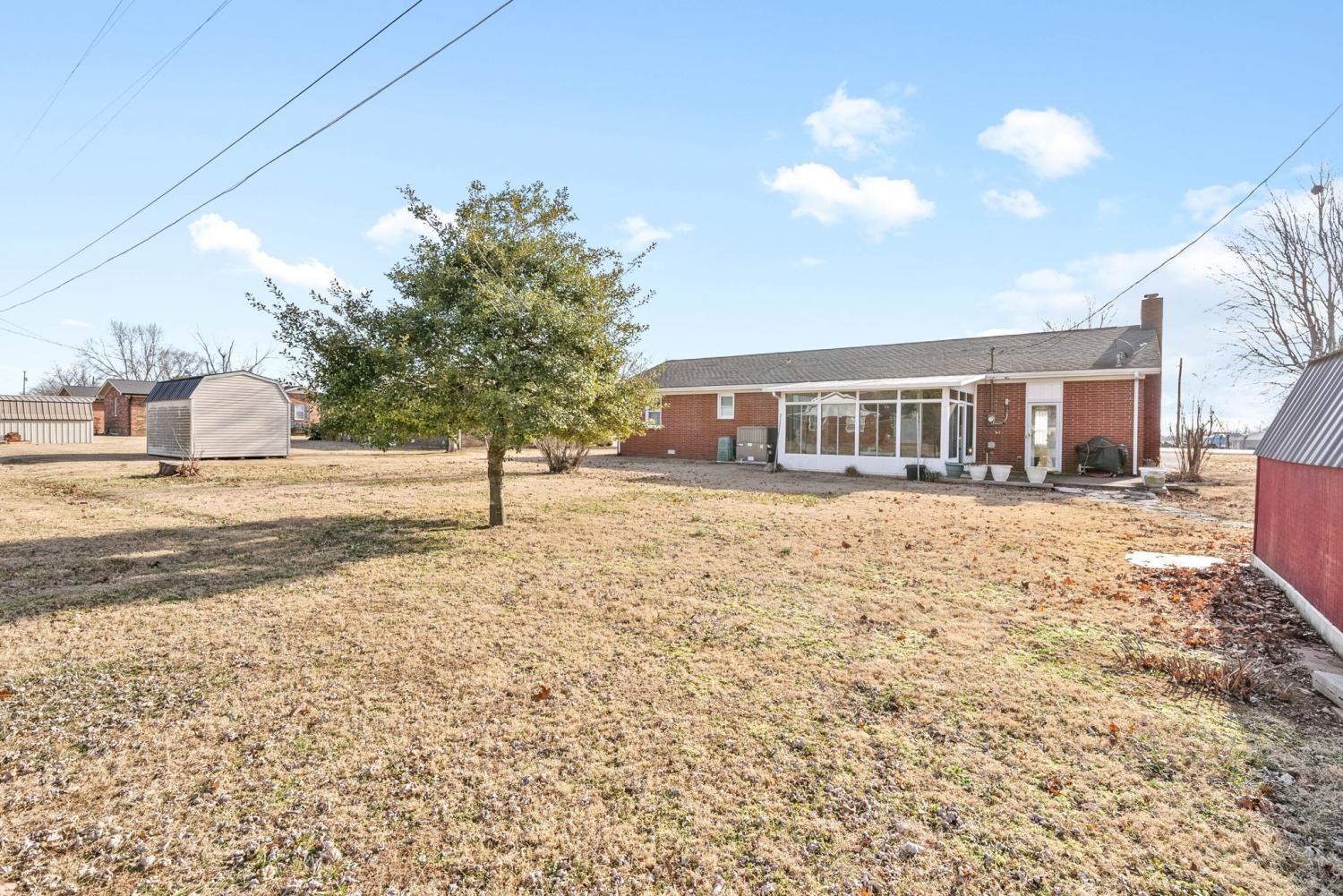 NEW ROOF in March 2025. This charming 3-bedroom, 2-bath home is move-in ready with fresh paint throughout! Enjoy the beautifully updated kitchen cabinets and a renovated bathroom. The cozy den features a natural gas fireplace, perfect for relaxing evenings. A lovely glassed-in sunroom offers additional living space filled with natural light. Outside, you'll find a spacious 12x13 patio, ideal for entertaining, and a 15x11 storage building with electricity for all your storage needs.