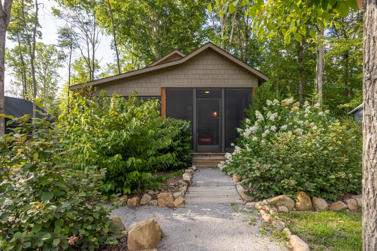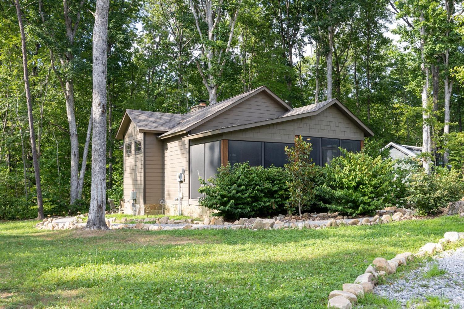 Custom built, not pre-fab. 2 full baths, includes a full size tub and custom shower. Screened porch across the front of the house provides sunset views and plenty of room for dining and relaxing while 2 ceiling fans allow for year round comfort. Vaulted ceilings, Primary suite w/ a queen sized bed, and a guest room w/2 twin beds plus a sleeping loft gives guests privacy from the common great room. Custom woodburning fireplace made from local crab orchard stone provides indoor coziness, while an outdoor fire pit behind the house provides night time stargazing. A full kitchen w/custom cabinets and shiplap and soft close drawers includes a full size range, ice maker, and an under counter fridge/ freezer allowing for maximum counter space. Rollout windows, black out blinds are just some of the unique features, that make this cottage one of a kind. Washer and dryer are included. Additional fire pits , docks and trails are all within walking distance from this gated community. State park trails are close enough to make this your home base for hiking weekends. All furniture remains with the exception of kitchen Harvest table and art.