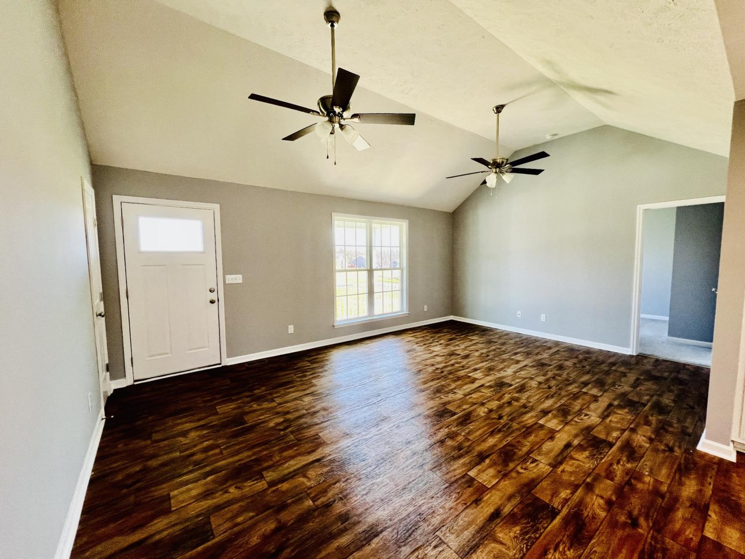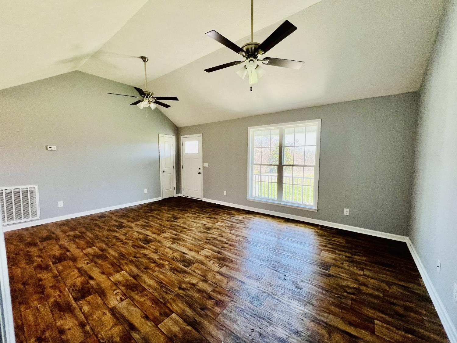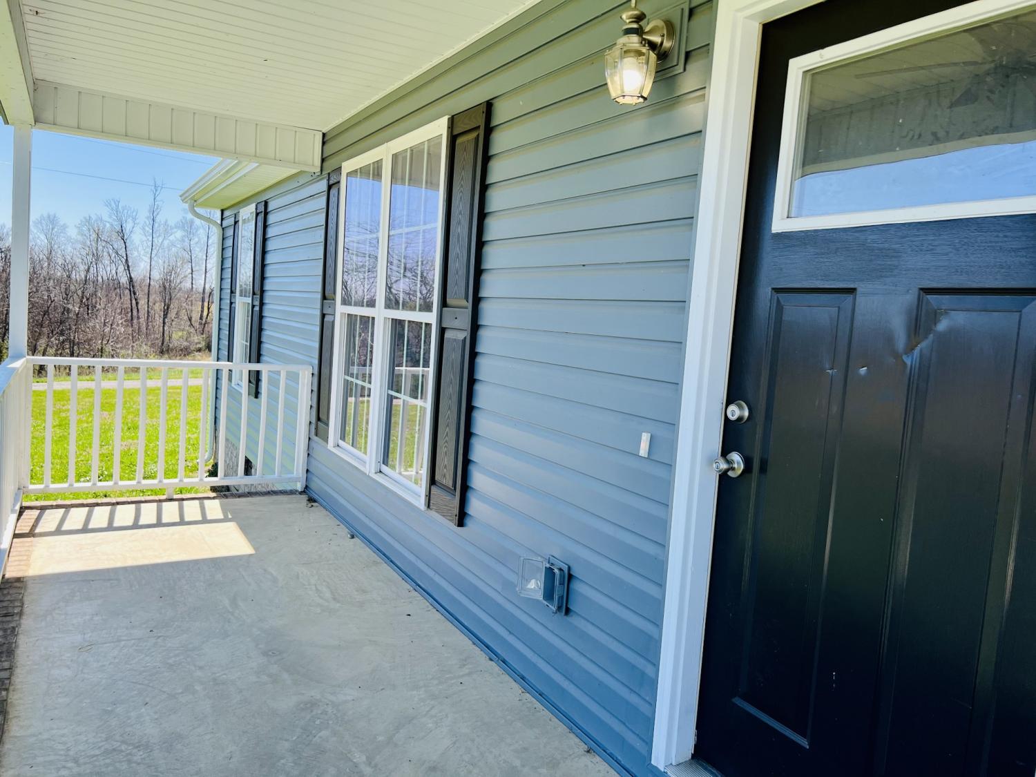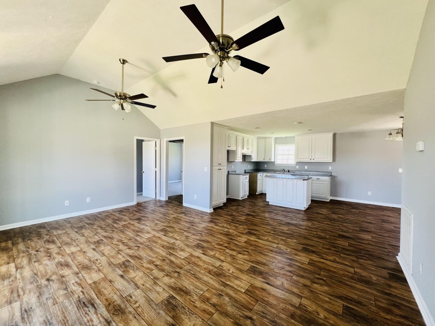 Built in 2023 on almost 2 ACRES, this home has lots of room for family! A large open living/kitchen and dining area makes for spacious living. The living area has a vaulted ceiling and two ceiling fans. Kitchen has an island, recessed lighting and custom cabinetry. NEW stainless stove and refrigerator to be installed soon. Main/primary bedroom has a trey ceiling with fan, its own bath with double sink vanity and tub/shower combination. Two additional bedrooms are in a different part of home, sharing a hallway bath with a tub/shower combination. A large front porch and a deck on the back are great for enjoying the outdoors.