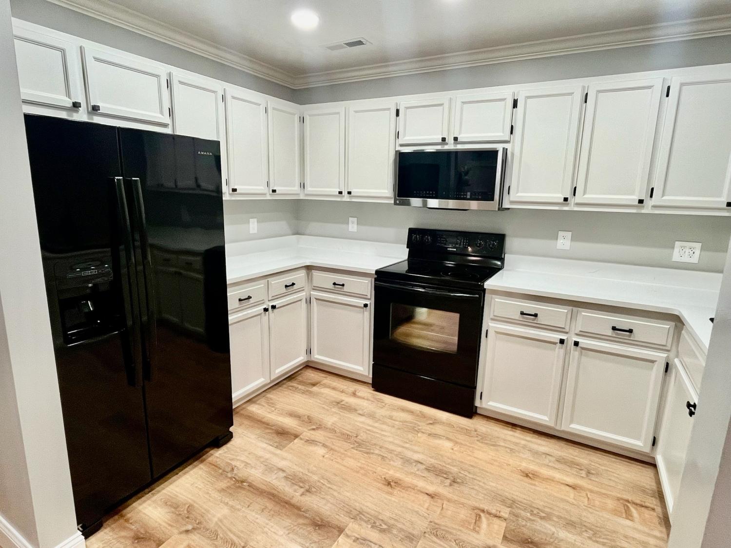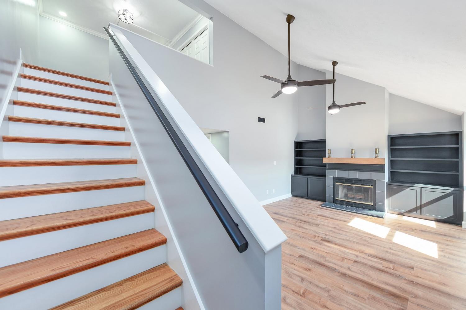 This beautifully updated townhouse offers modern features throughout. The living room boasts a striking masonry fireplace, flanked by built-in shelving, serving as the centerpiece, complemented by soaring cathedral ceilings. The kitchen is a chef's dream with stunning quartz countertops, new microwave, dishwasher, disposal, and tons of cabinet space. The breakfast bar is equipped with a new sink and a touch-free faucet for added convenience. Enjoy relaxing moments on the screened-in back patio, which overlooks a private, fenced-in backyard. Both bathrooms have been fully renovated, featuring fresh paint, new vanities, and updated fixtures. The master bath is highlighted by a luxurious walk-in shower. Experience the home's many new updates, including fresh paint, new flooring, stylish fixtures, crown molding, and ceiling fans.