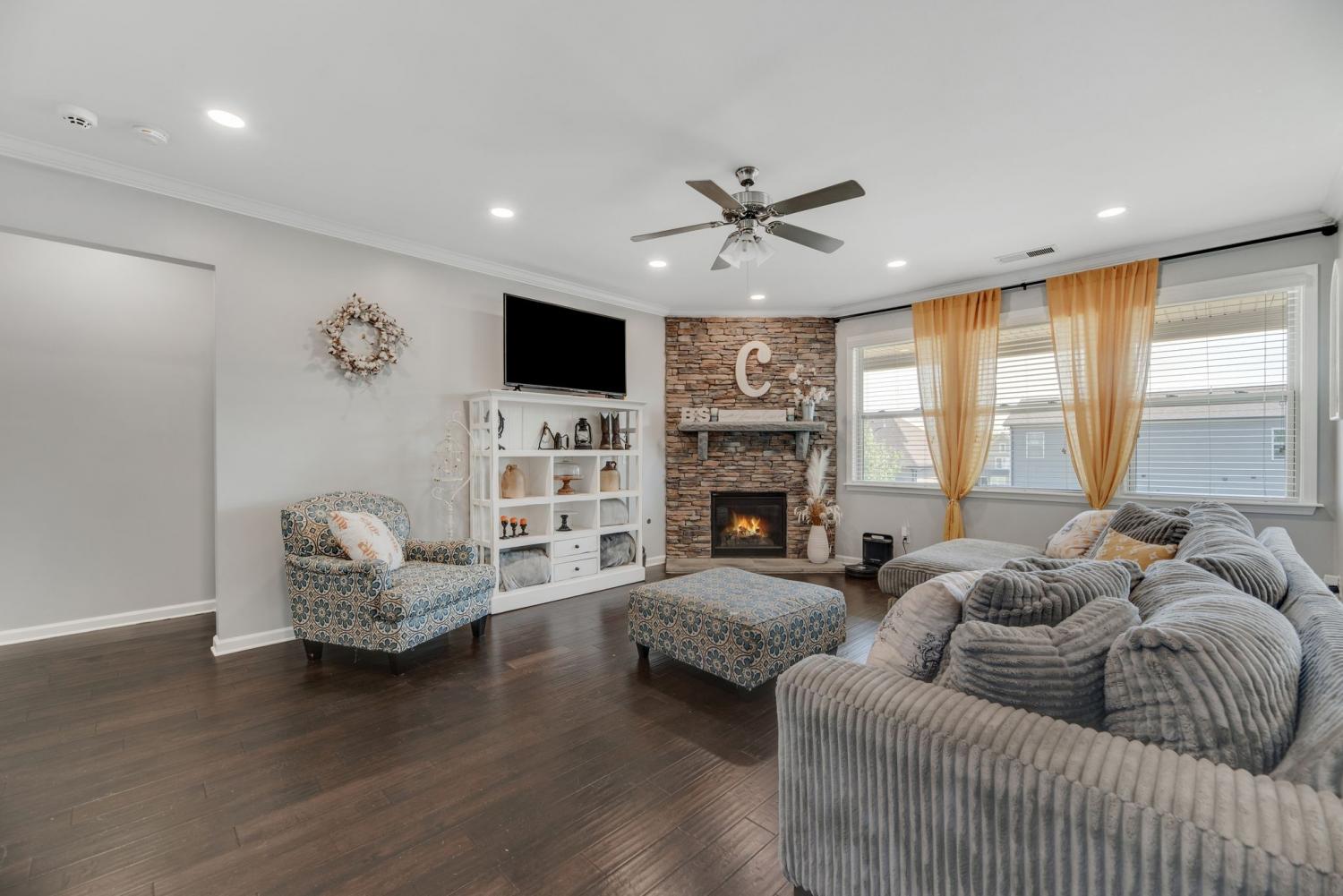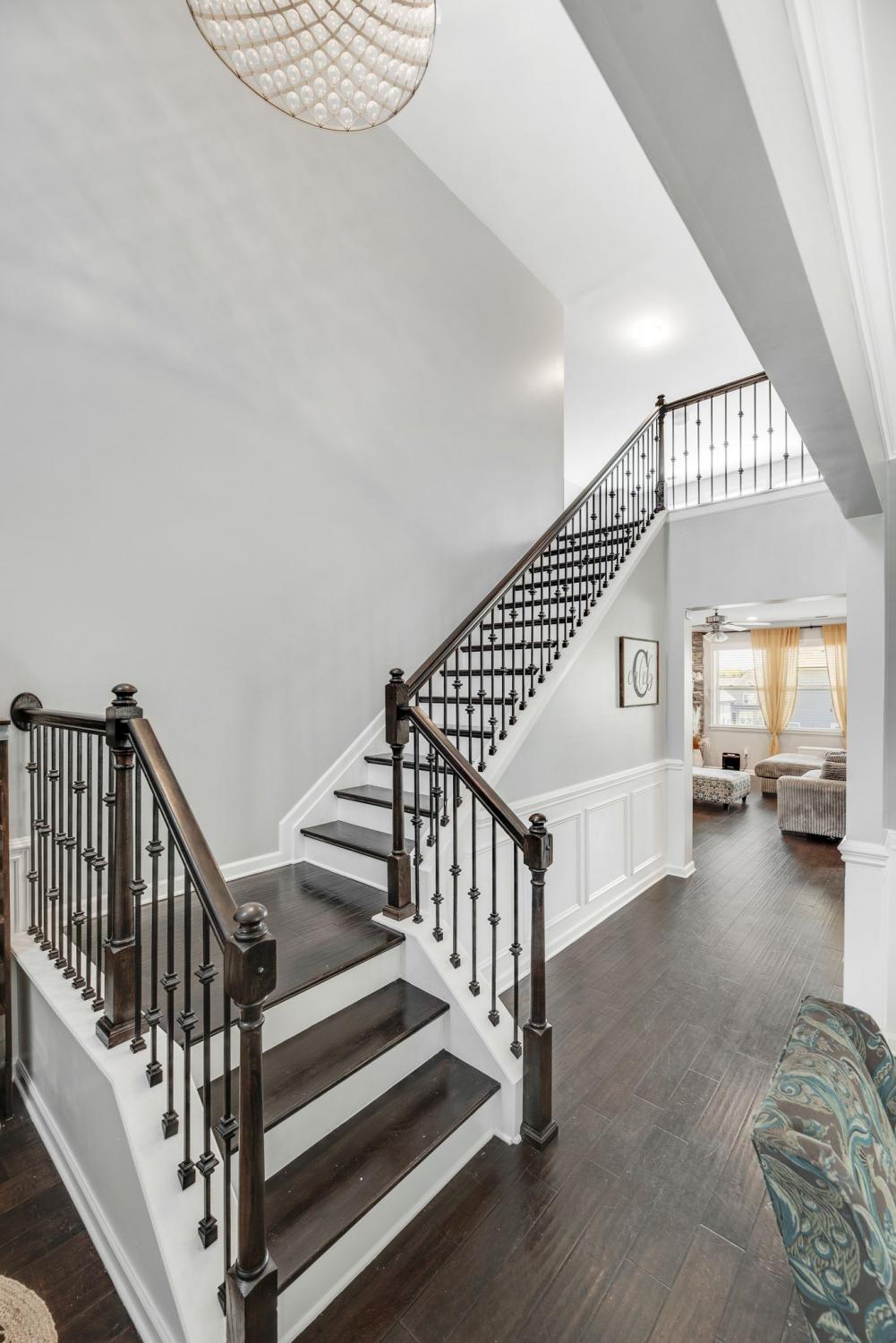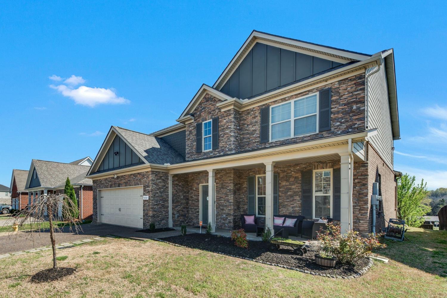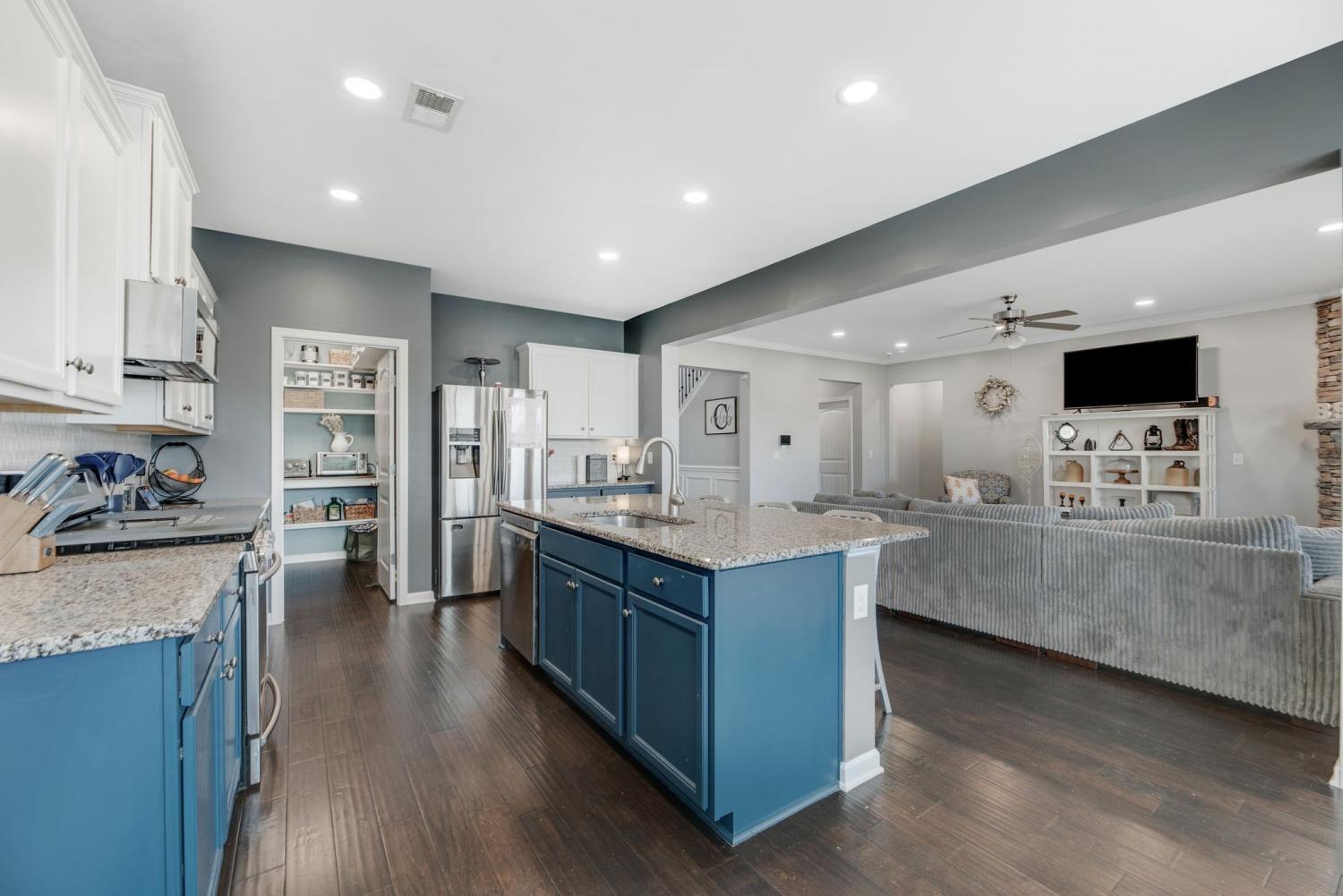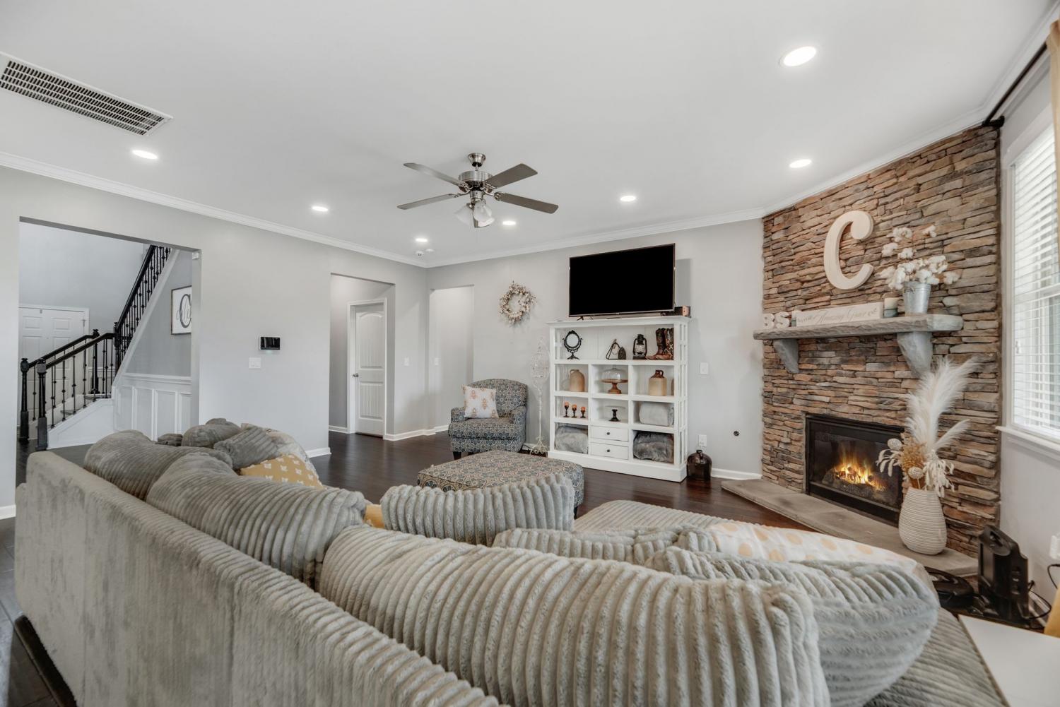 This spacious 5 bedroom, 3.5 bath house is perfect for your large family! Open floor plan with primary bedroom downstairs, 4 bedrooms upstairs with a large bonus room and 2 full bathrooms. TWO LAUNDRY ROOMS! Large walk in pantry with updated shelving. Great front porch and patio area to enjoy grilling this summer! Sidewalks throughout the neighborhood makes family walks and bike rides a breeze. Community pool, green spaces, and pond. Community events and food trucks give the family tons to do within walking distance. TRIPLE STEWARTS SCHOOLS!