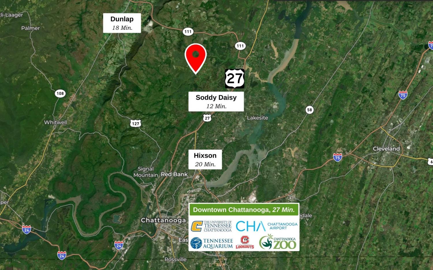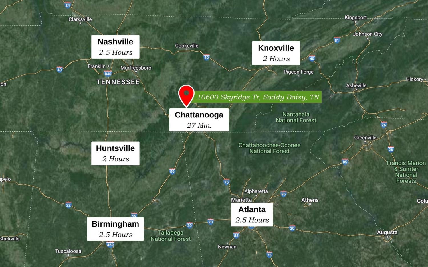 From Downtown Chattanooga: Take Hwy 27N to Harrison Lane exit, turn left. Right onto Dayton Pike, left onto Mountain Road which will turn into Mowbray Pike. Follow for approximately 8 miles. Turn right onto Grant Road, left on Welch Road, left onto Skyridge Trail, down the private driveway.