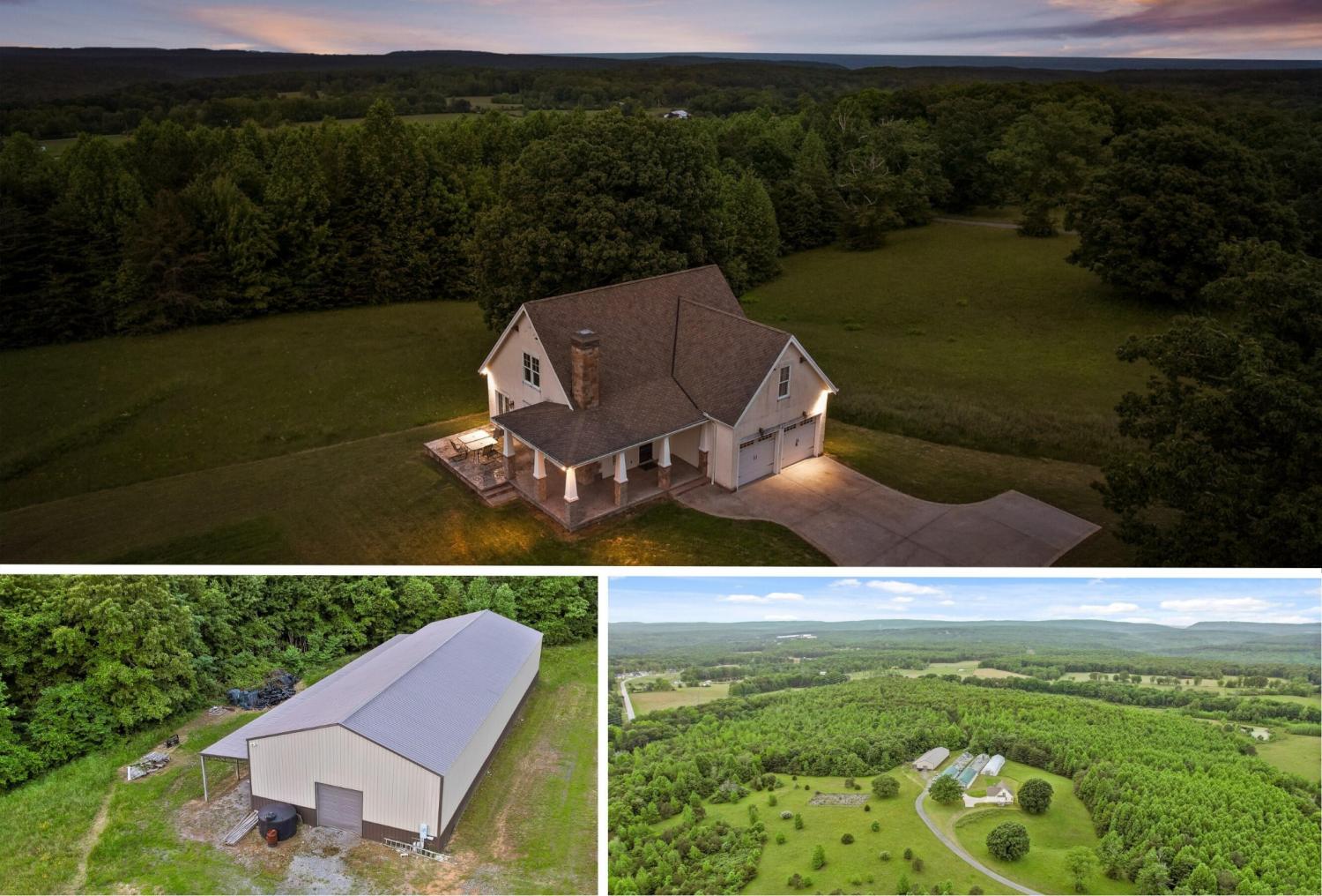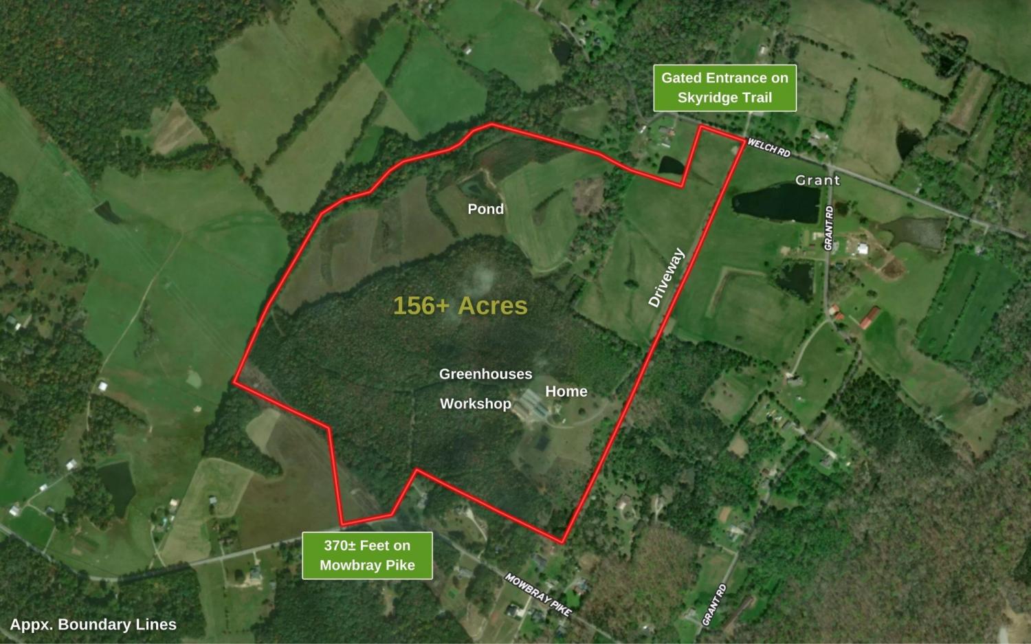 WATCH VIDEO: https://youtu.be/C8JUPRynVMw - RETREAT...INVEST...or BOTH! 156+ Acres in HAMILTON COUNTY, TN. Perched atop Mowbray Mountain, find peace, privacy, and opportunity just 10 minutes to Soddy Daisy conveniences and 30 minutes to downtown Chattanooga. This rare property features a GATED entrance, 4 bedroom HOME, 5 GREENHOUSES, WORKSHOP, and PONDS. Accessed by a private driveway on Skyridge Trail with additional 370+/- feet of frontage on Mowbray Pike. 2-LEVEL barn/workshop with lean-to offers ample room for equipment storage. For those with a green thumb, the property boasts 5 greenhouses perfect for hobbies, gardening, an INCOME-PRODUCING business, or bringing your homestead dreams to life. Pastures, woodlands, and 2 ponds further enhance the acreage opportunity found in north Hamilton County. Currently zoned A-1 (Agricultural), enjoy wildlife watching and HUNTING in your own backyard. The hilltop home hosts a main level primary suite, hardwood floors, and tall windows that invite natural light and views of the woods beyond. Cozy up by the FIREPLACE in the living area or enjoy the warmth of hardwood floors throughout the home with the convenience of the nearby powder room, laundry closet, and porch walkout. Upstairs, you'll find 3 additional bedrooms and 1 bathroom, ideal for extra living space, HOME OFFICE, or playroom. Serene WRAP AROUND PORCH to take in the stunning landscape and towering trees. Less than 30-minute drive to the ''Scenic City'' of Downtown Chattanooga. Enjoy the homestead mountain living experience, with gated entrance, private surroundings, and endless possibilities for recreation, gardening, agriculture, or development. County taxes only and no state income tax in TN! (2 parcels to transfer: 039 004 and 046 006.02. Information provided is deemed reliable but not guaranteed. Buyer responsible for verifying all information deemed important to Buyer. Some images may be virtually staged.