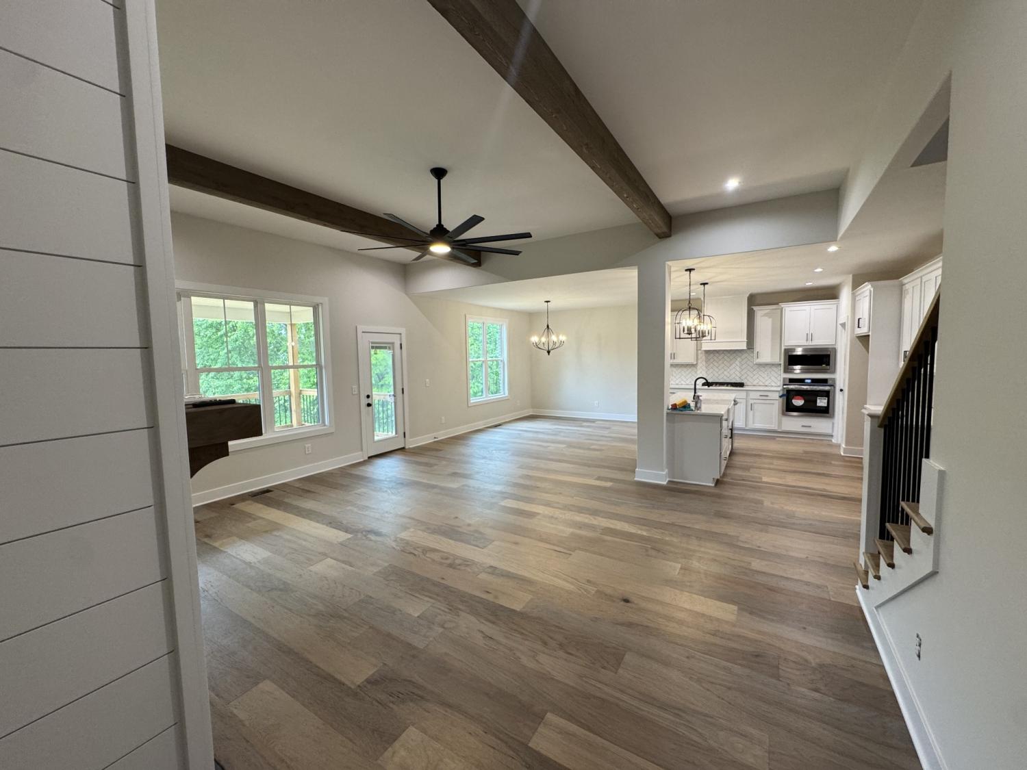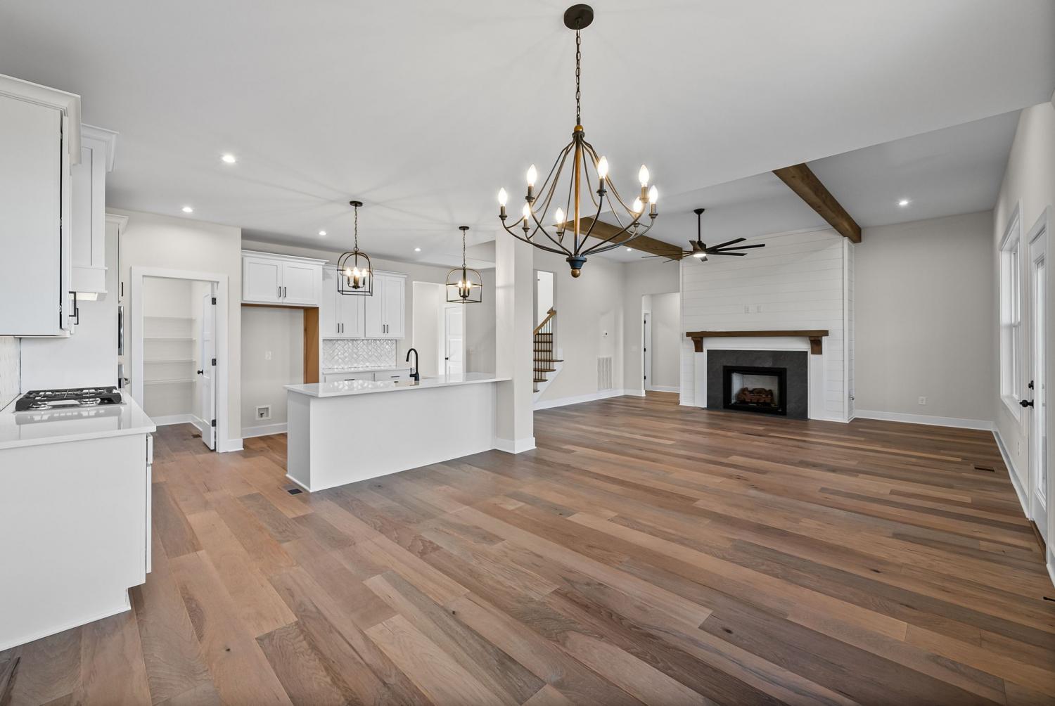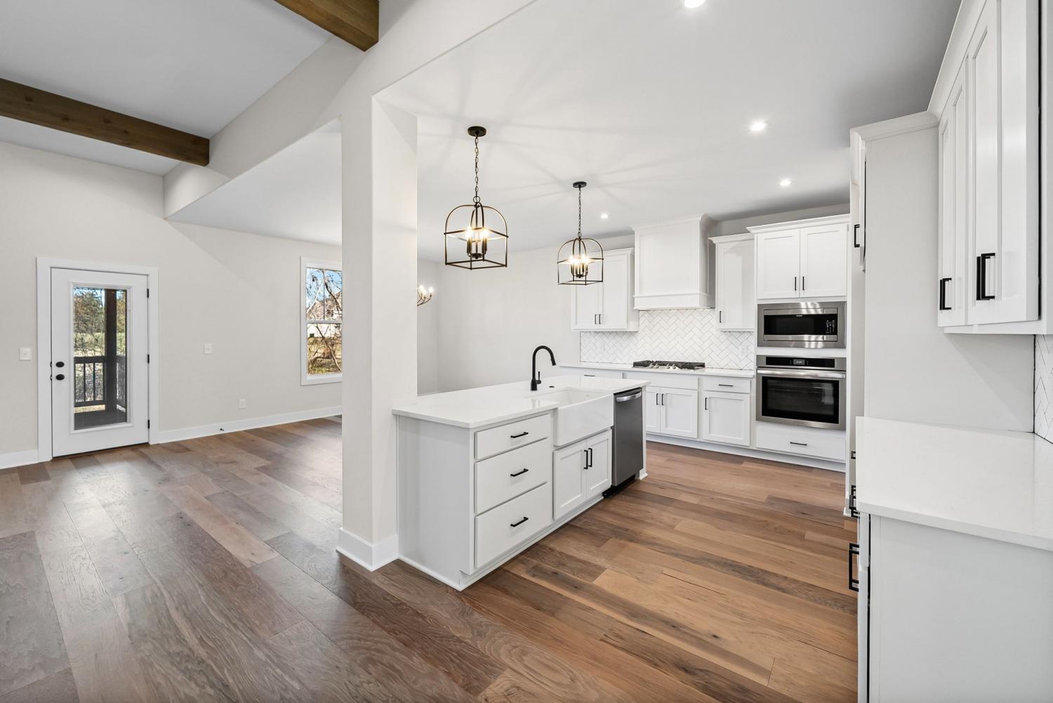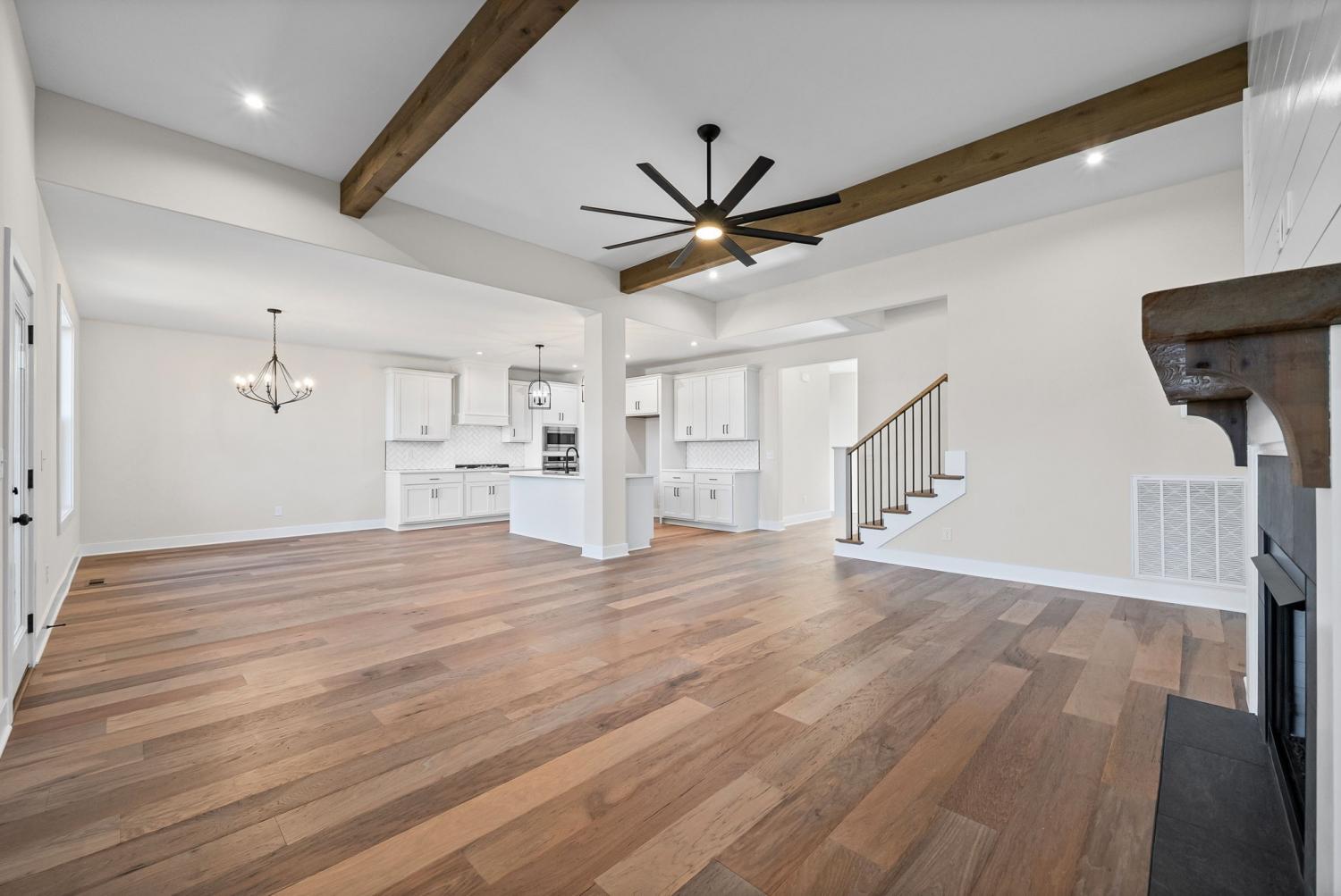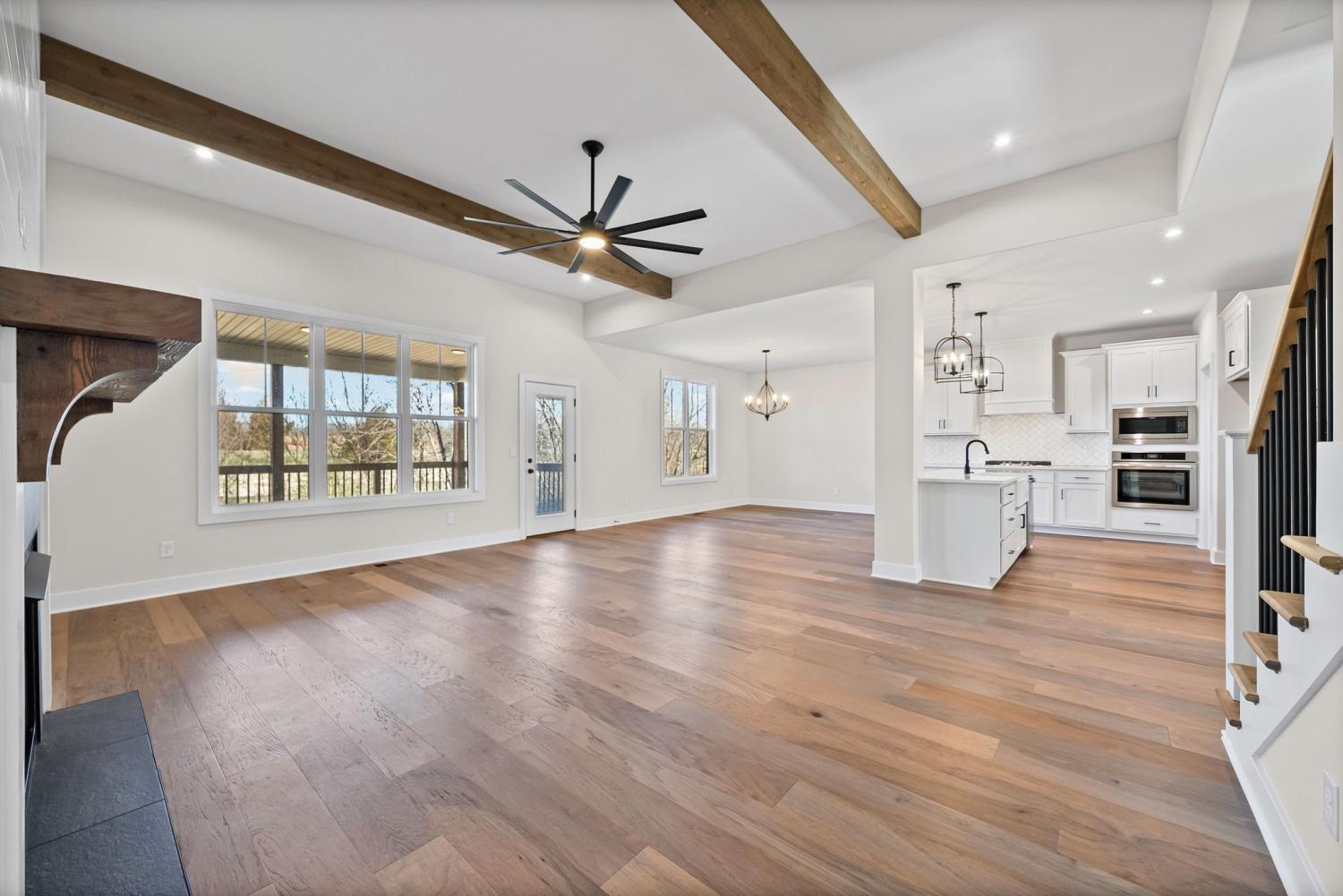 Welcome to this beautiful new home with everything you would want or need! impeccable construction; great location. Must see. Beautiful custom fireplace in great room with exposed beams; overlooking nice private back yard with spacious covered deck. Lots of natural lighting. Open concept, entry foyer, dining room, large kitchen with custom cooktop hood, plenty of cabinets and storage space; soft-close drawers; walk-in pantry with shelving. Quartz countertops. Hardwood floors throughout with carpet in bedrooms; Large bedrooms, play room, large primary bedroom with exposed beams and gorgeous/spacious bathroom suite with custom barn door, freestanding tub, walk-in closet with custom shelving...a dream! Oversized garage; mudroom entryway.