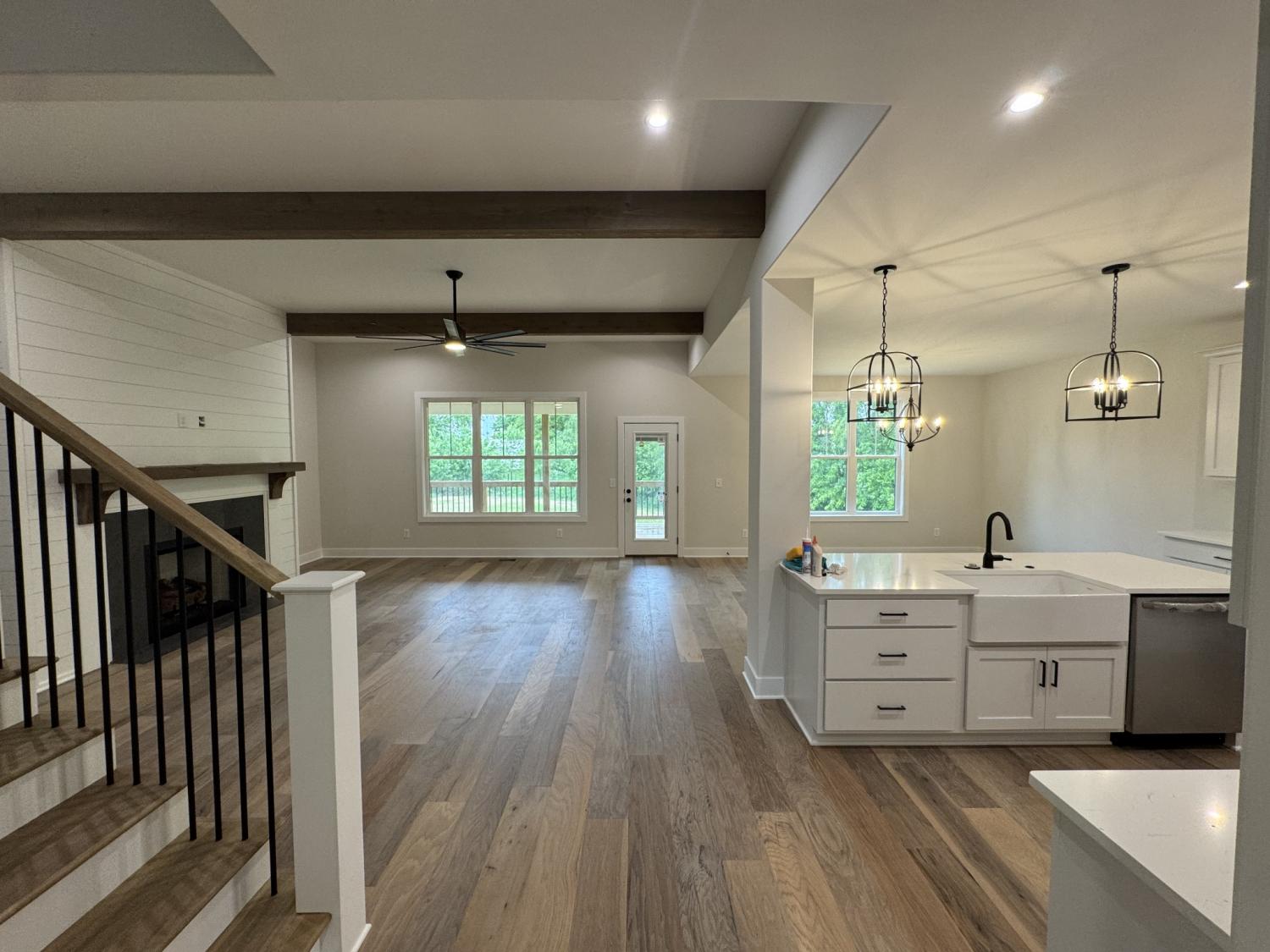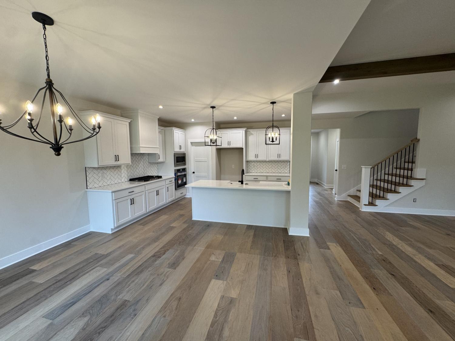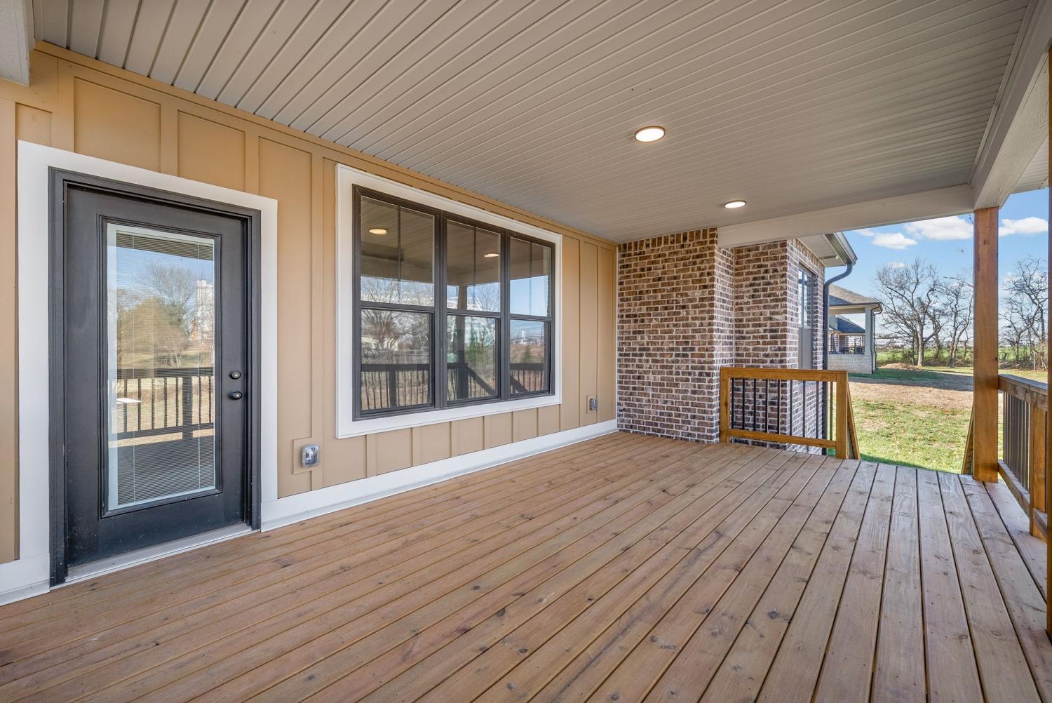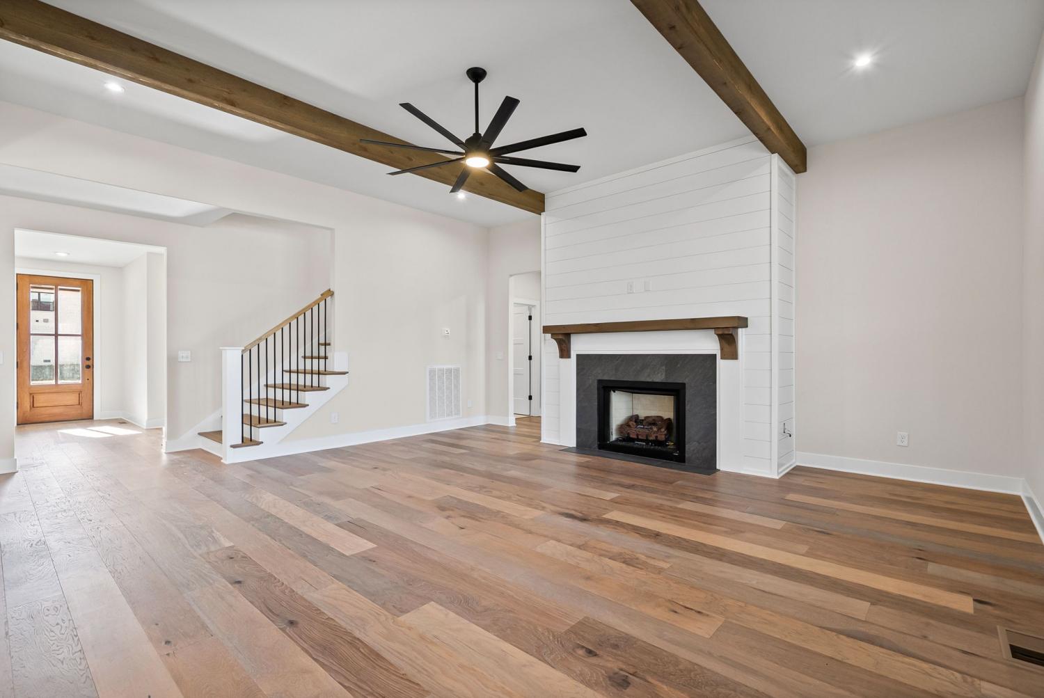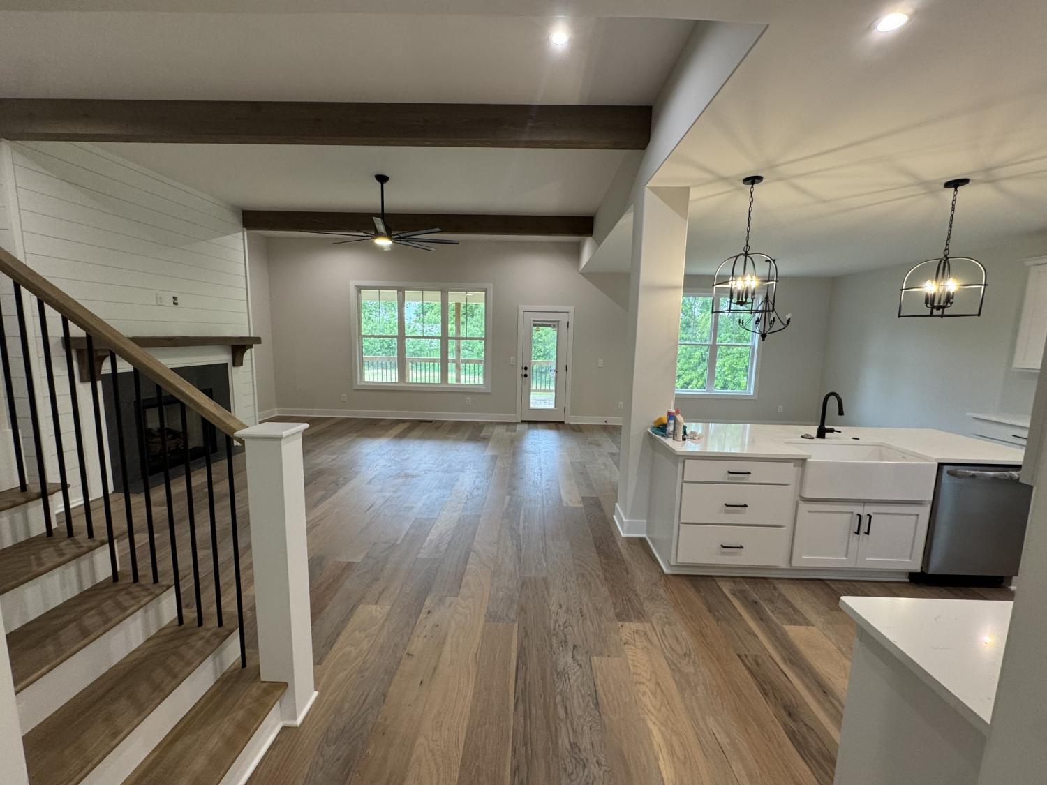 Welcome to this beautiful new home with everything you would want or need! impeccable construction; great location. Must see. Beautiful custom fireplace in great room with exposed beams; overlooking nice private back yard with spacious covered deck. Lots of natural lighting. Open concept, entry foyer, dining room, large kitchen with custom cooktop hood, plenty of cabinets and storage space; soft-close drawers; walk-in pantry with shelving. Quartz countertops. Hardwood floors throughout with carpet in bedrooms; Large bedrooms, play room, large primary bedroom with exposed beams and gorgeous/spacious bathroom suite with custom barn door, freestanding tub, walk-in closet with custom shelving...a dream! Oversized garage; mudroom entryway.