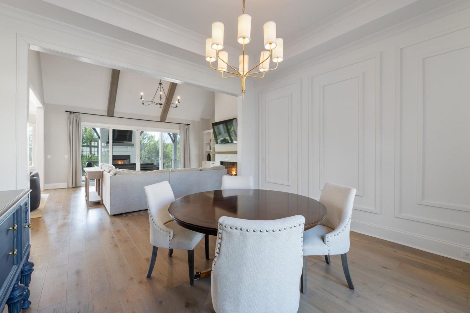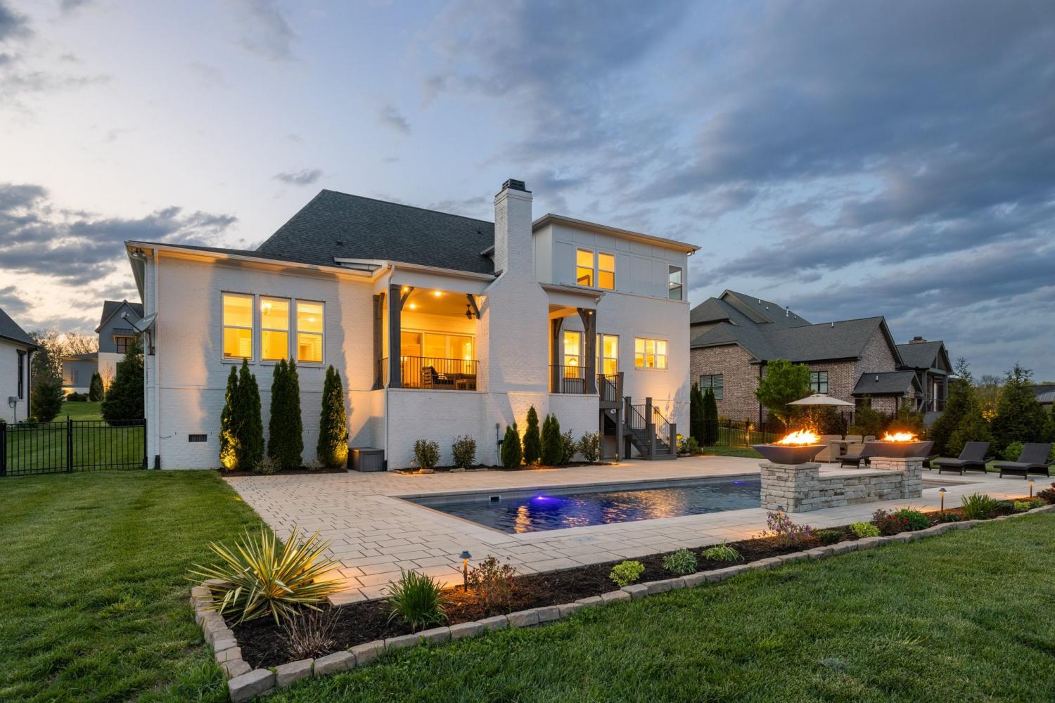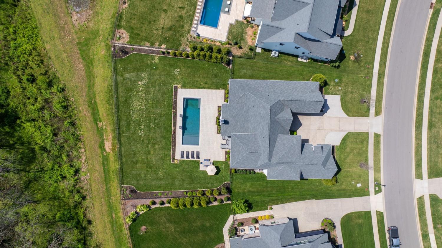 This stunning residence blends luxury, functionality, and thoughtful design across every inch. Located in a desirable community, the home boasts incredible attention to detail—from custom ceiling treatments and exposed wood beams to expansive living spaces and resort-style outdoor amenities. The main level features both a primary suite and guest suite, along with a private study adorned with a coffered ceiling and French doors. Gorgeous hardwood floors run throughout the main living areas, while the formal dining room shines with natural light and elegant wainscoting. The chef’s kitchen is a true centerpiece, offering a large center island with seating, ceiling-height cabinetry, top-of-the-line stainless steel appliances, and ample prep space. Just off the kitchen, a wet bar with beverage center provides the perfect setup for entertaining. The living room features a vaulted ceiling with exposed wood beams, custom built-in bookcases, and a gas fireplace, with glass sliding doors opening to a covered rear porch—complete with a fireplace and views of the in-ground pool and lush green space. The primary suite is a luxurious retreat, showcasing a tray ceiling with shiplap accents, private porch access, dual vanities, a freestanding soaking tub, and a floor-to-ceiling walk-in shower with rainhead and bench seating. Upstairs offers incredible flexibility with a spacious bonus room and a media room pre-wired for surround sound, ideal for movie nights or casual entertaining. The outdoor living space is unmatched, featuring a sparkling pool with sun shelf, fire features, and a generous patio area for lounging. The fenced-in backyard adds privacy, and the 3-car garage with stately courtyard entry completes the package. With its mix of elegance, comfort, and entertainment-ready spaces, this home is truly one-of-a-kind.
