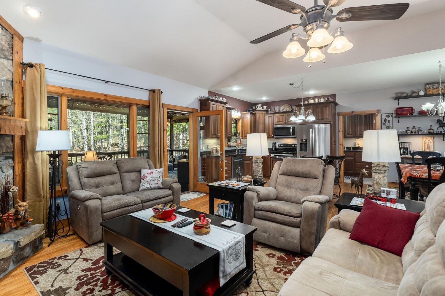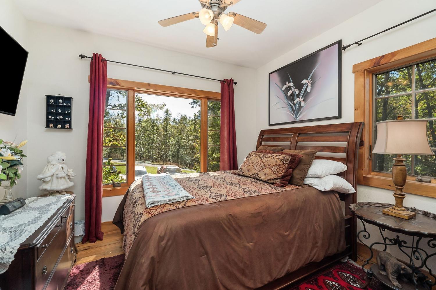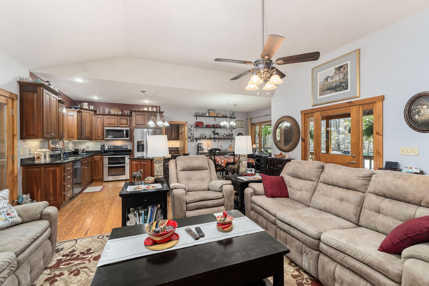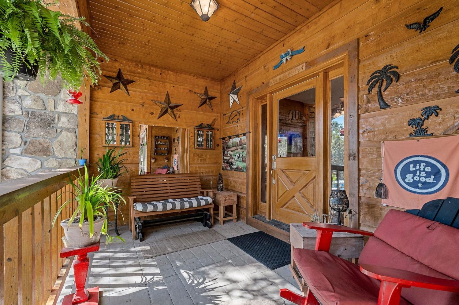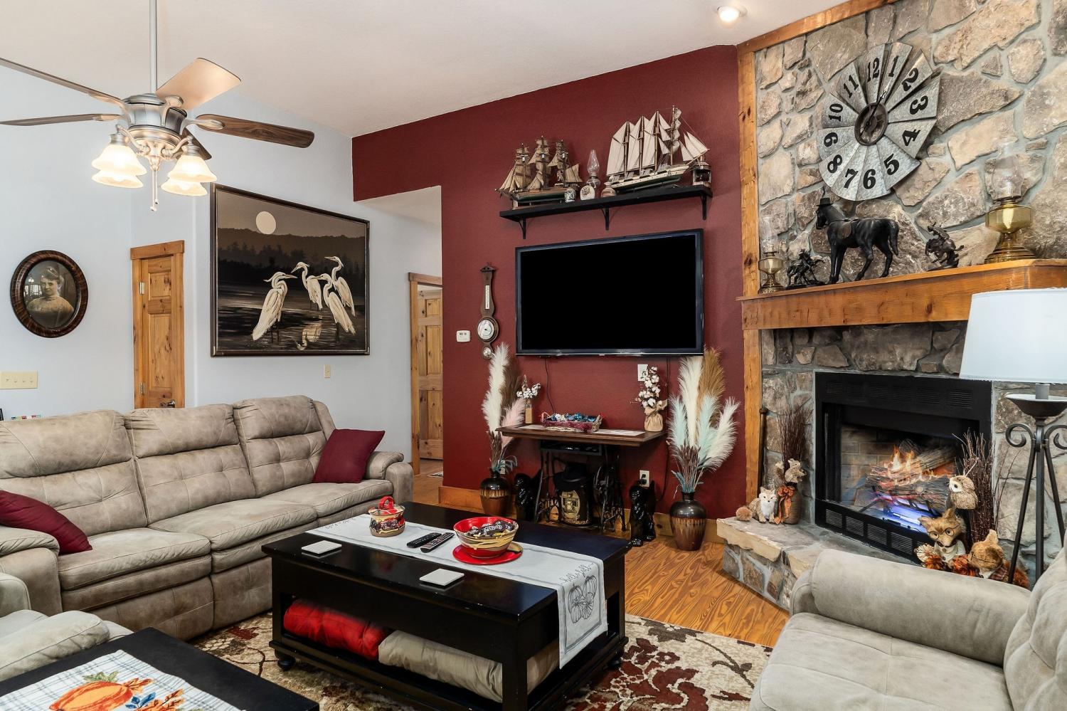 A rare find where nature, comfort, and character come together! Nestled in a gated community with resort-style amenities, this beautifully maintained 3-bedroom, 2-bathroom home offers over 250 feet of creek frontage with peaceful lake views—a true private oasis. Crafted with conventional construction, the home features wood siding and stone accents, blending rustic charm with lasting quality. Inside, you’ll find gorgeous hardwood floors, a cozy inset gas fireplace (easily convertible back to wood-burning), and a warm, inviting layout. The kitchen includes appliances that are just a year old, and the spacious master suite offers a large walk-in shower for added comfort. Step out to your 20x27 screened-in porch and take in the serene creek views, gather around the fire pit, or enjoy time in your garden area. The property also features ample concrete driveway space for parking, leaf guards on the gutters, and fiber optic internet for fast, reliable connection. The climate-controlled one-car subterranean garage includes a workshop and storage area, adding even more functionality to this well-thought-out home. As part of the gated community, you’ll also have access to two large pavilions, a pool, scenic lakes, a general store, and an optional equestrian center for horse lovers. Outdoor furniture is negotiable, making it even easier to move in and start enjoying your peaceful new lifestyle—all for just $479,900. Don’t miss your chance to own this beautiful retreat—schedule your showing today!
