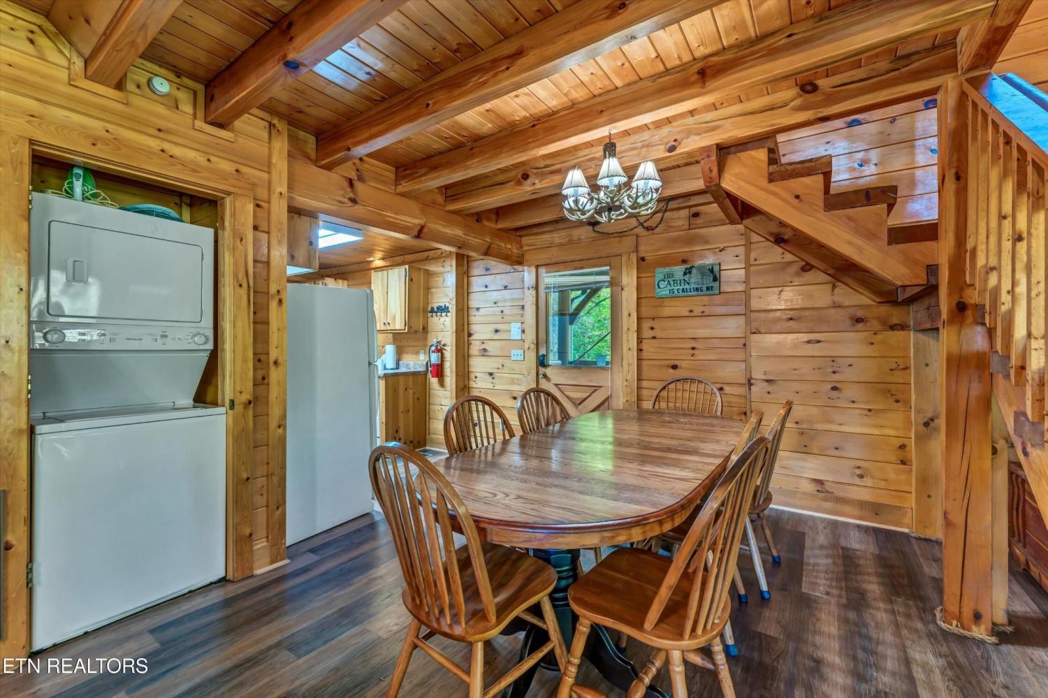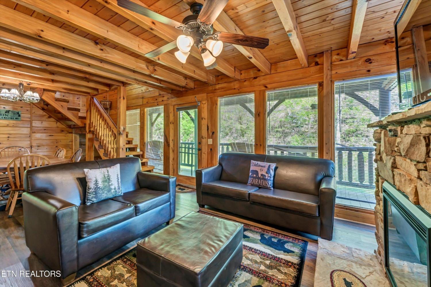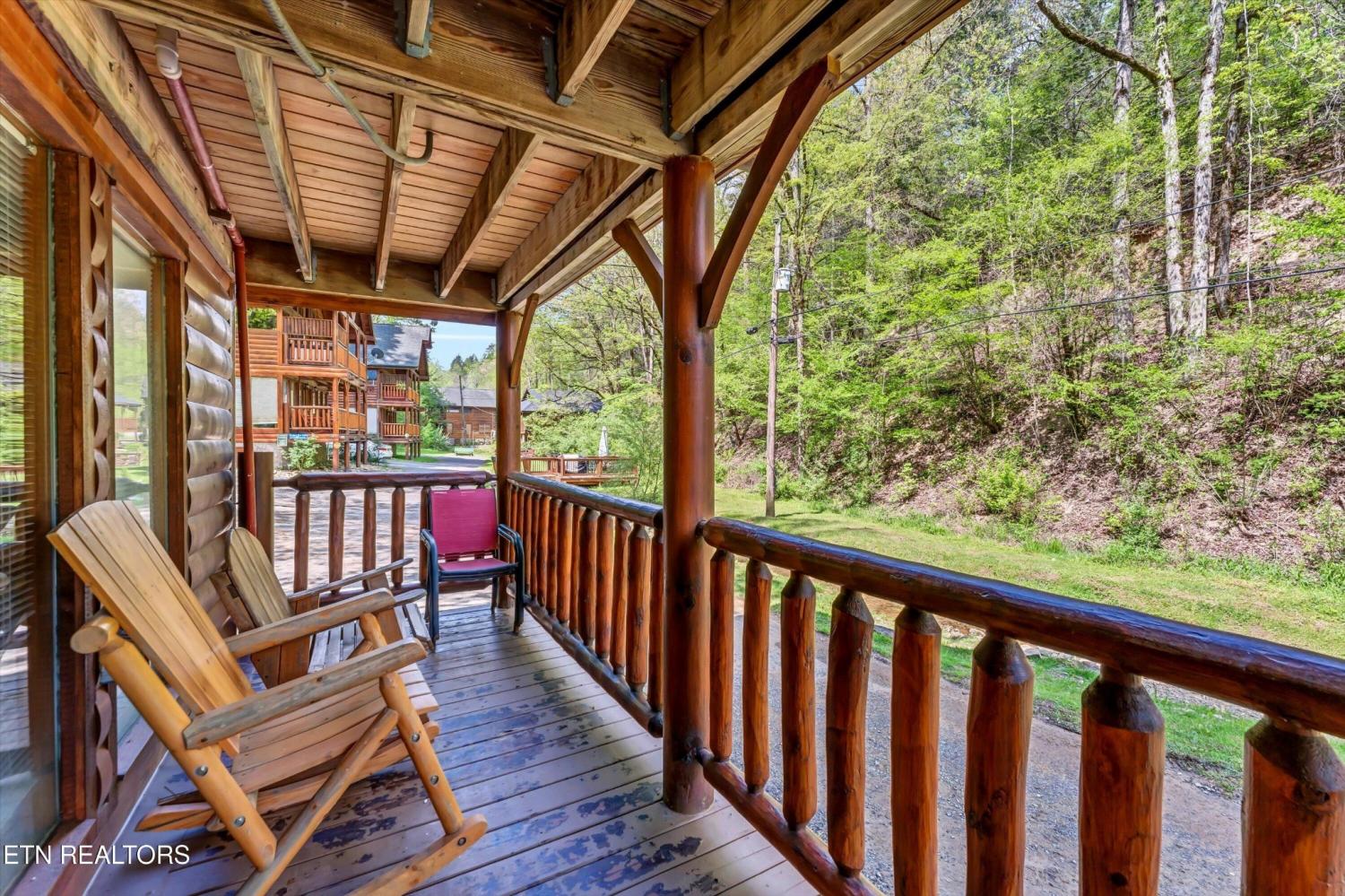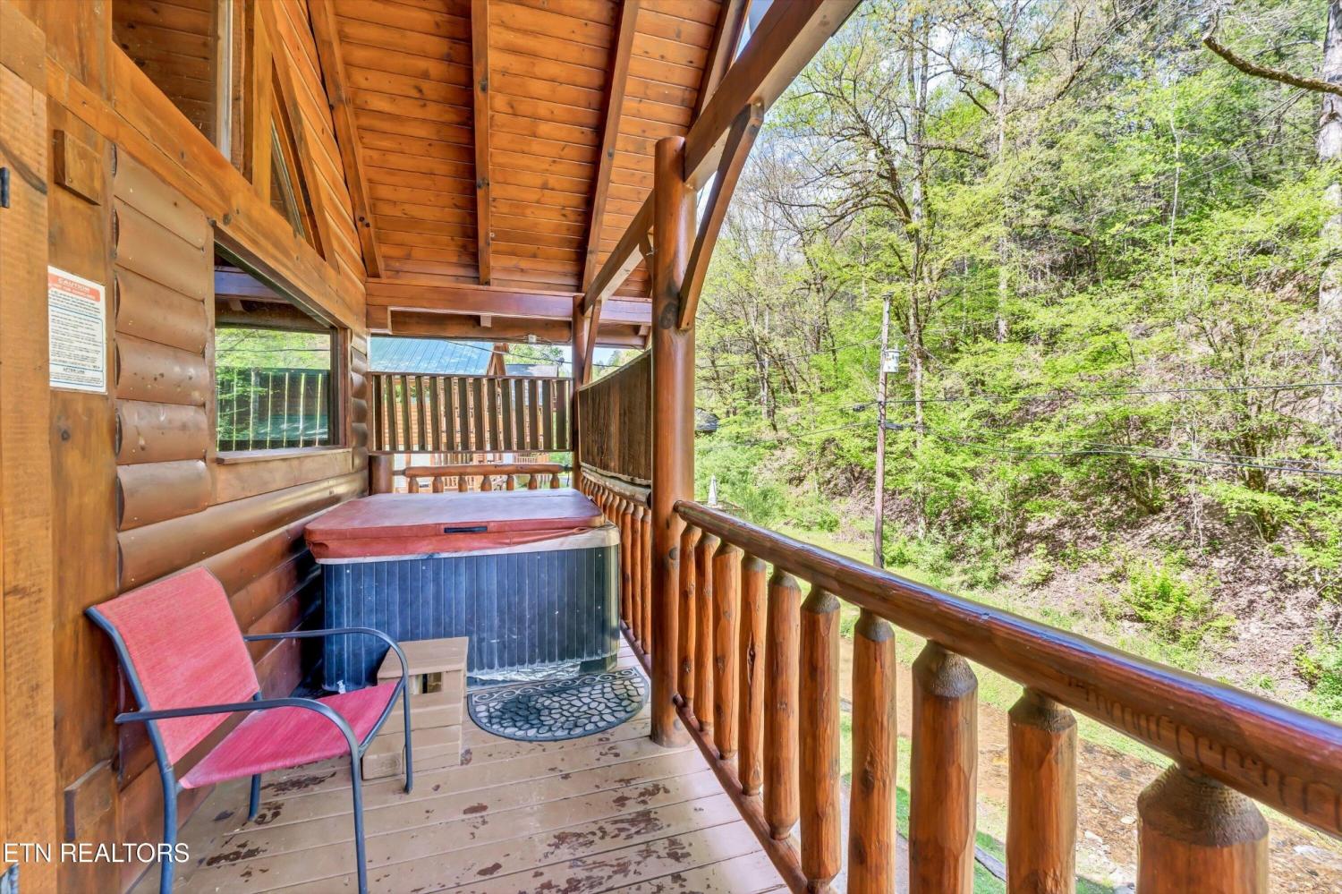 This charming 2 bed, 2 bath log cabin in the heart of Pigeon Forge offers 1,664 sqft of classic cabin charm and modern comfort. An ideal short-term rental or mountain retreat. The open living and dining area features soaring wooden beam ceilings, a cozy fireplace, and an abundance of windows that fill the space with natural light. The kitchen carries the rustic aesthetic with wooden cabinetry and a warm, welcoming atmosphere. Both bedrooms are generously sized, and the two bathrooms include unique features; one boasting a red heart-shaped jetted tub and walk-in shower. The loft area provides extra sleeping space, perfect for accommodating guests. Step outside to unwind on either of the two covered porches overlooking a peaceful creek-one with a private hot tub, perfect for soaking after a day in the Smokies. Incredible location with easy access to area attractions-don't miss this opportunity to own a piece of the Smoky Mountains!