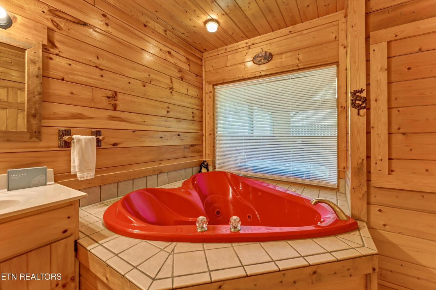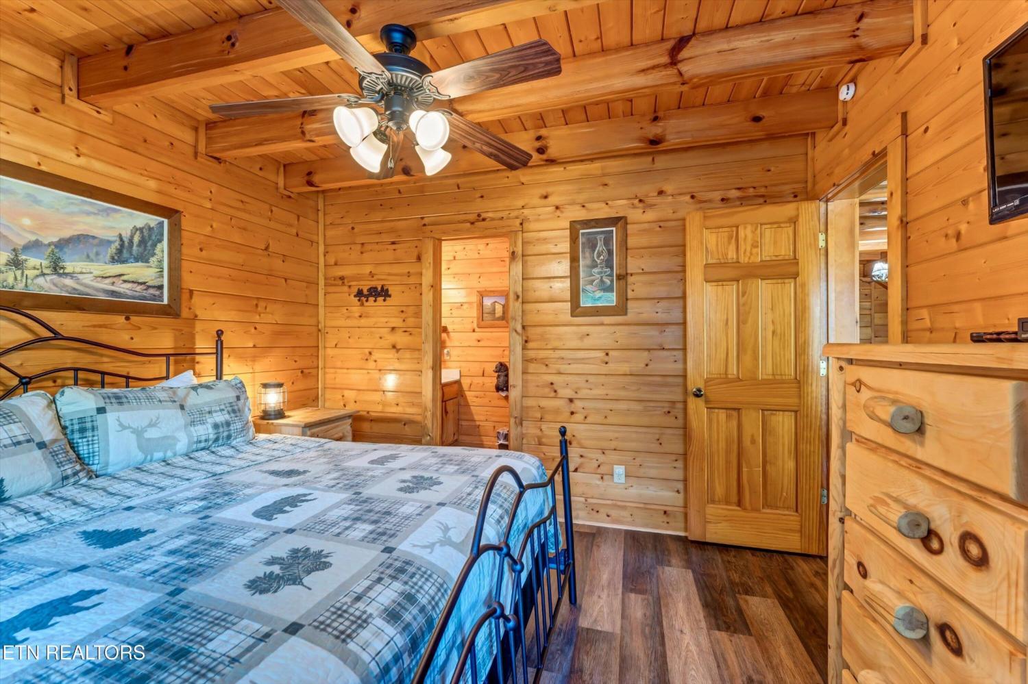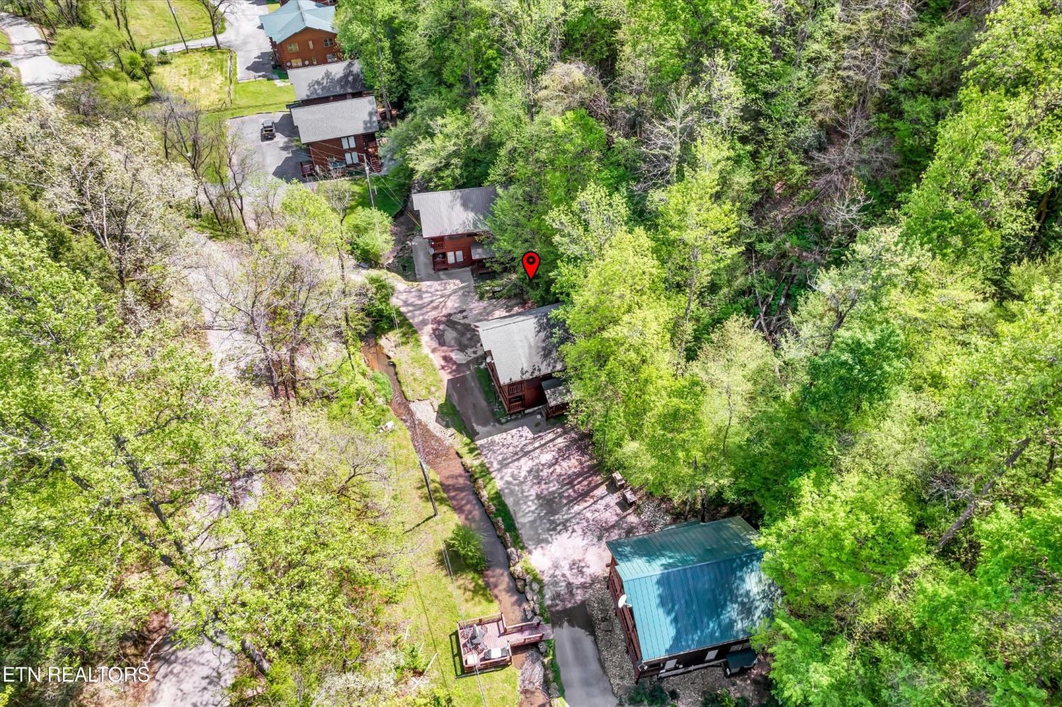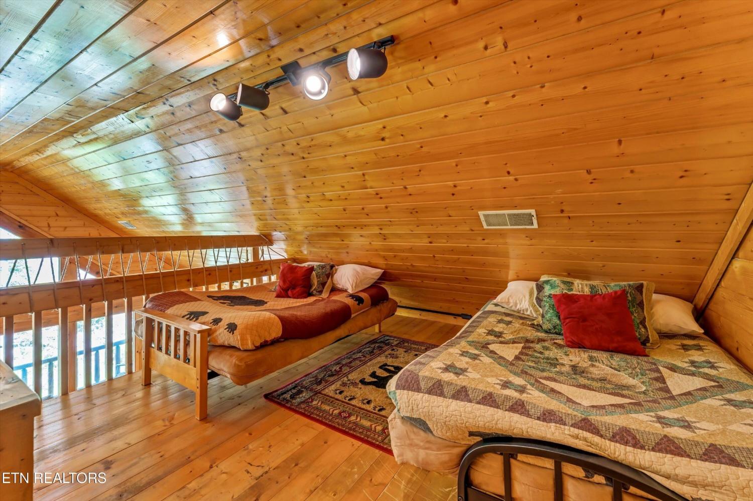 This charming 2 bed, 2 bath log cabin in the heart of Pigeon Forge offers 1,664 sqft of classic cabin charm and modern comfort. An ideal short-term rental or mountain retreat. The open living and dining area features soaring wooden beam ceilings, a cozy fireplace, and an abundance of windows that fill the space with natural light. The kitchen carries the rustic aesthetic with wooden cabinetry and a warm, welcoming atmosphere. Both bedrooms are generously sized, and the two bathrooms include unique features; one boasting a red heart-shaped jetted tub and walk-in shower. The loft area provides extra sleeping space, perfect for accommodating guests. Step outside to unwind on either of the two covered porches overlooking a peaceful creek-one with a private hot tub, perfect for soaking after a day in the Smokies. Incredible location with easy access to area attractions-don't miss this opportunity to own a piece of the Smoky Mountains!