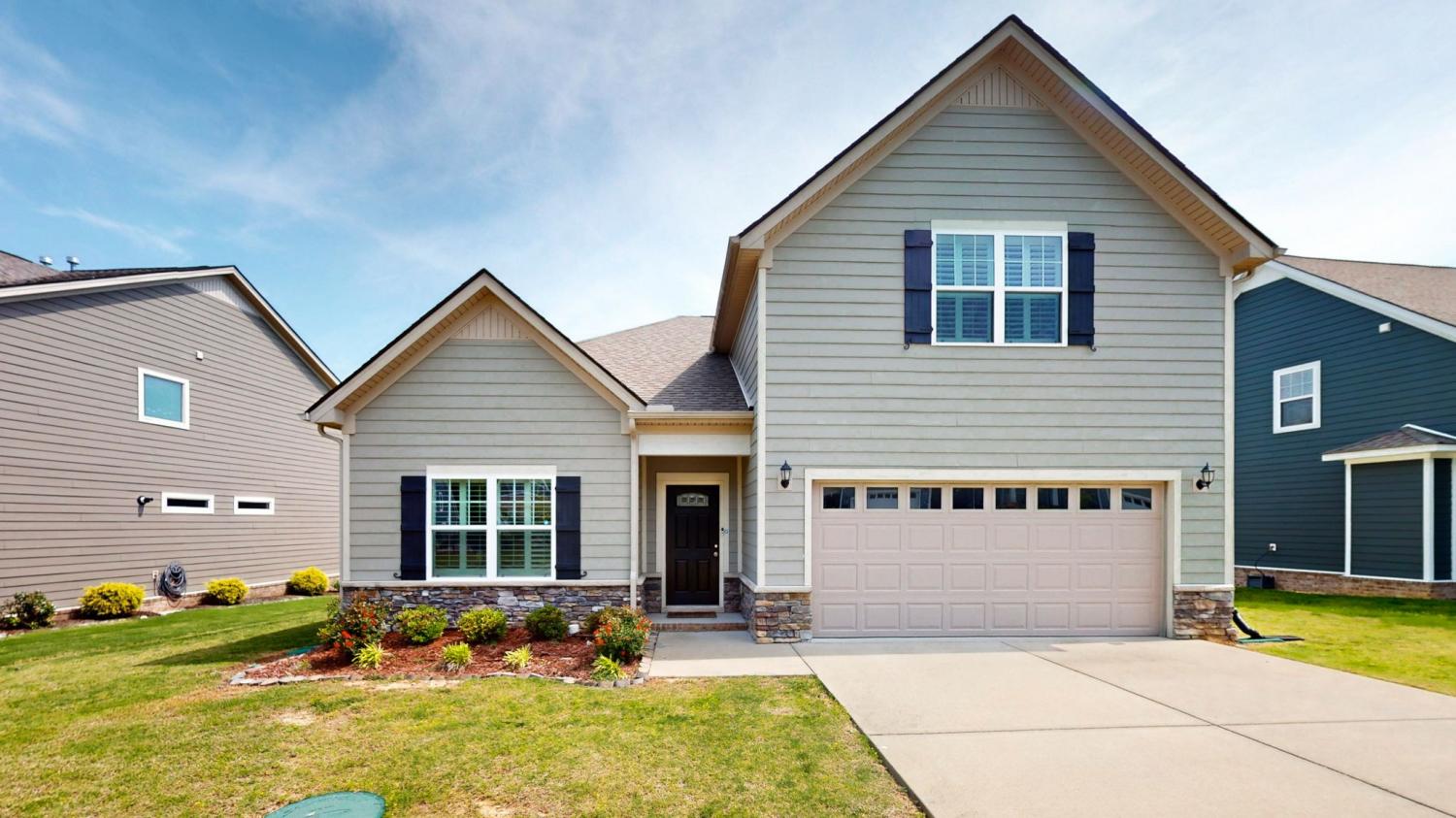 Community OPEN HOUSE Saturday 11am-1pm in Cumberland Estates! Why wait to build. This 3 bedroom, 3 bath home in Fairview is move-in ready and priced to sell. Great room with upgraded flooring, stacked stoned fireplace, crown molding and trey ceiling with recessed lighting. Plantation blinds throughout. Stainless appliances and granite in the kitchen, large breakfast room with access to the covered patio. Primary bedroom with trey ceiling, recessed lighting, fan, walk-in closet, and bathroom with garden tub and double vanity. Bonus room features walk-in storage access, recessed lighting and ceiling fan. Full bathroom upstairs in case you need a 4th bedroom. Two car garage and security system in place.