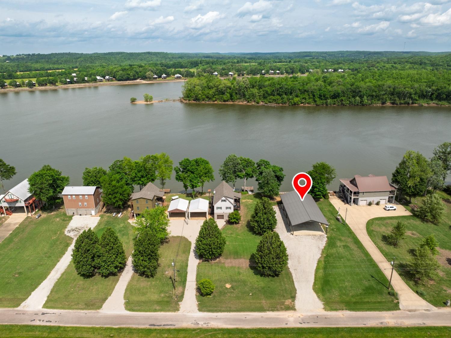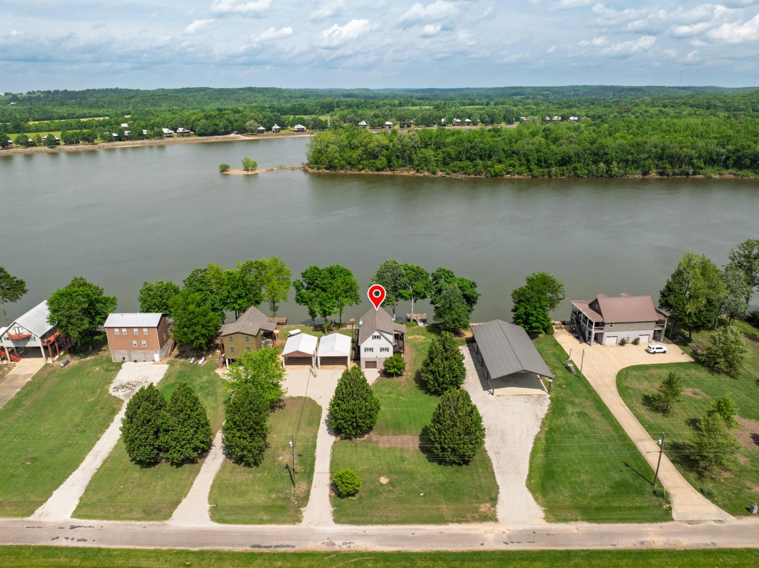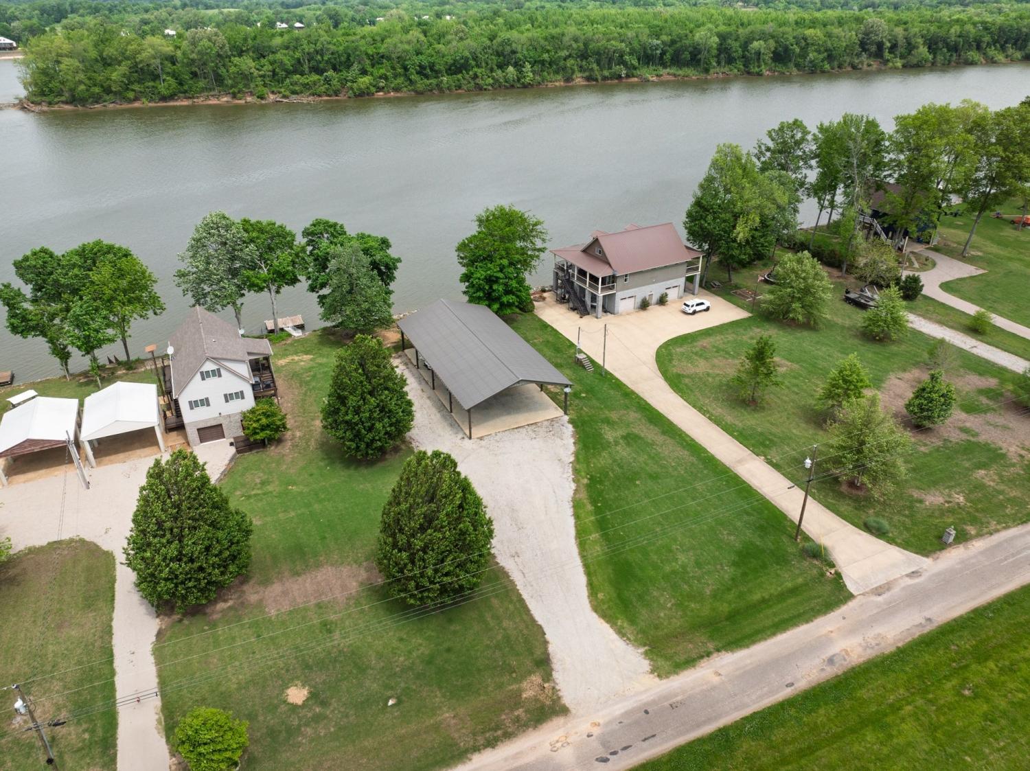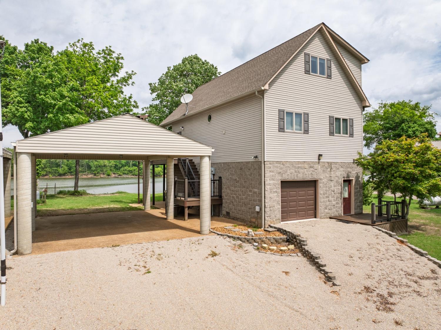 1.13 ACRE RiverFront Living! Mostly furnished & Custom 3BR home w/dock-plus separate 50x65 boat & camper shed! Newly installed composite decking & vaulted ceiling wrap around the waterview deck leading to the home's entry. A wonderful vaulted ceiling anchors the open living area featuring a fireplace & wall of windows-with all the water views! A pretty waterview dining/kitchen area accommodates a breakfast bar, custom cabinetry, granite counters, tile backsplash, & all appliances-w/side door out to the grilling/dining porch. 2 BRs, full BA, & washer/dryer in laundry room complete the main floor. Upstairs is a flexible open loft-roomy enough for an office, bunk room, or den & master BR w/private BA & roomy walk in closet. The heated/cooled garage features a half bath & a large flexible space perfect for gaming, sitting, or bunk area! Ground level covered patio features a perfect place to enjoy the magnificent sunsets as well as a 2nd location for grilling. Lrg covered double carport adds to the plentiful parking & the cargo elevator provides an effortless way to bring in groceries & other household items. Ramp leads to the private floating dock a set of steps down to the beach area are shared with the neighbor as is the well which is located on this 1.13 acre waterfront lot w/197 feet of water frontage overlooking the main channel of the TN River. The extra large boat/camper shed offers plenty of room for extra guests to bring their camper or for your boats & four wheelers/side by sides! Community boat launch next door as well as 2 commercial marinas nearby-located just off Hwy 641 mins from the small TN River towns of Clifton & Bath Springs-between Memphis & Nashville. Ready for a new Family-just bring the kids & the boat!
