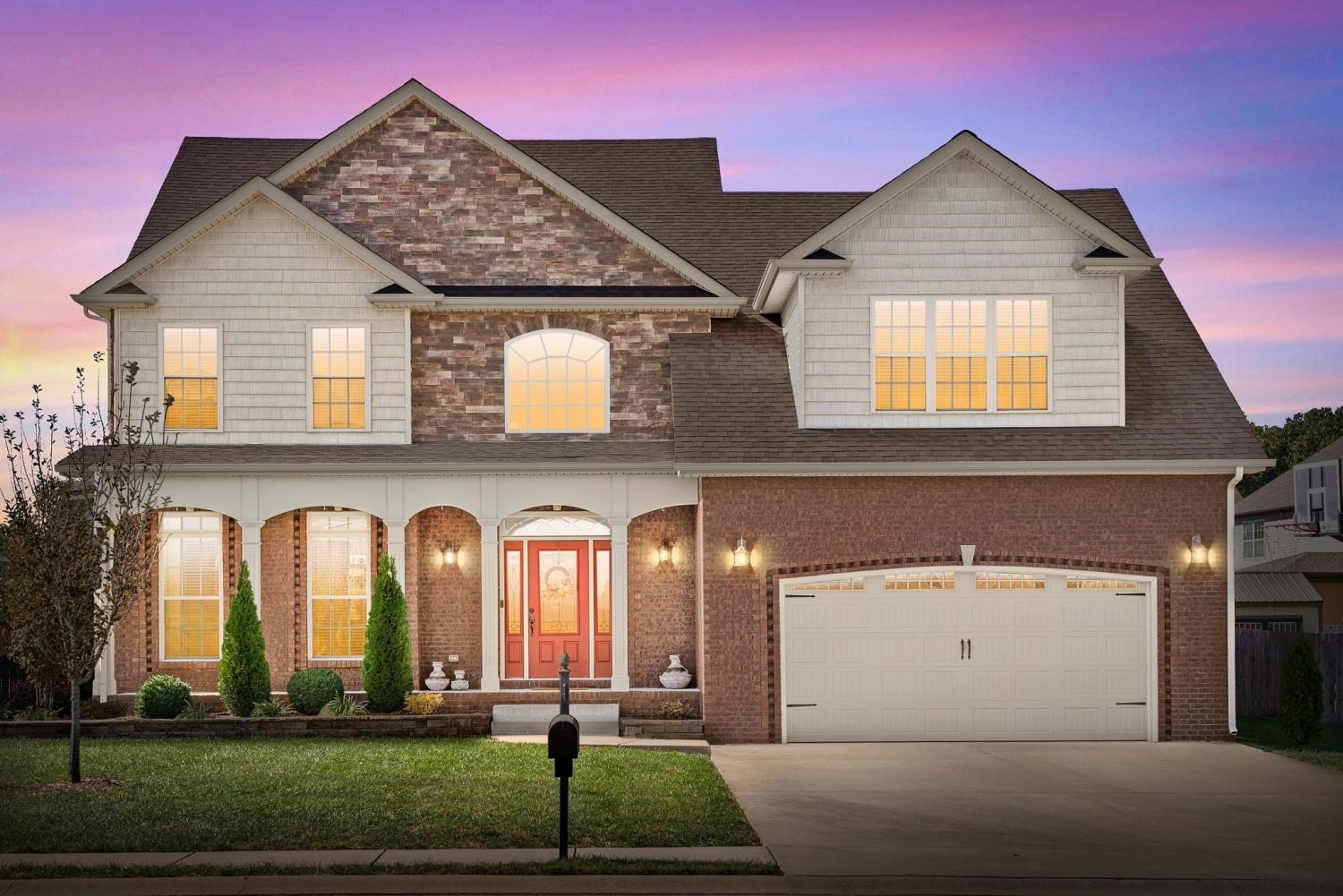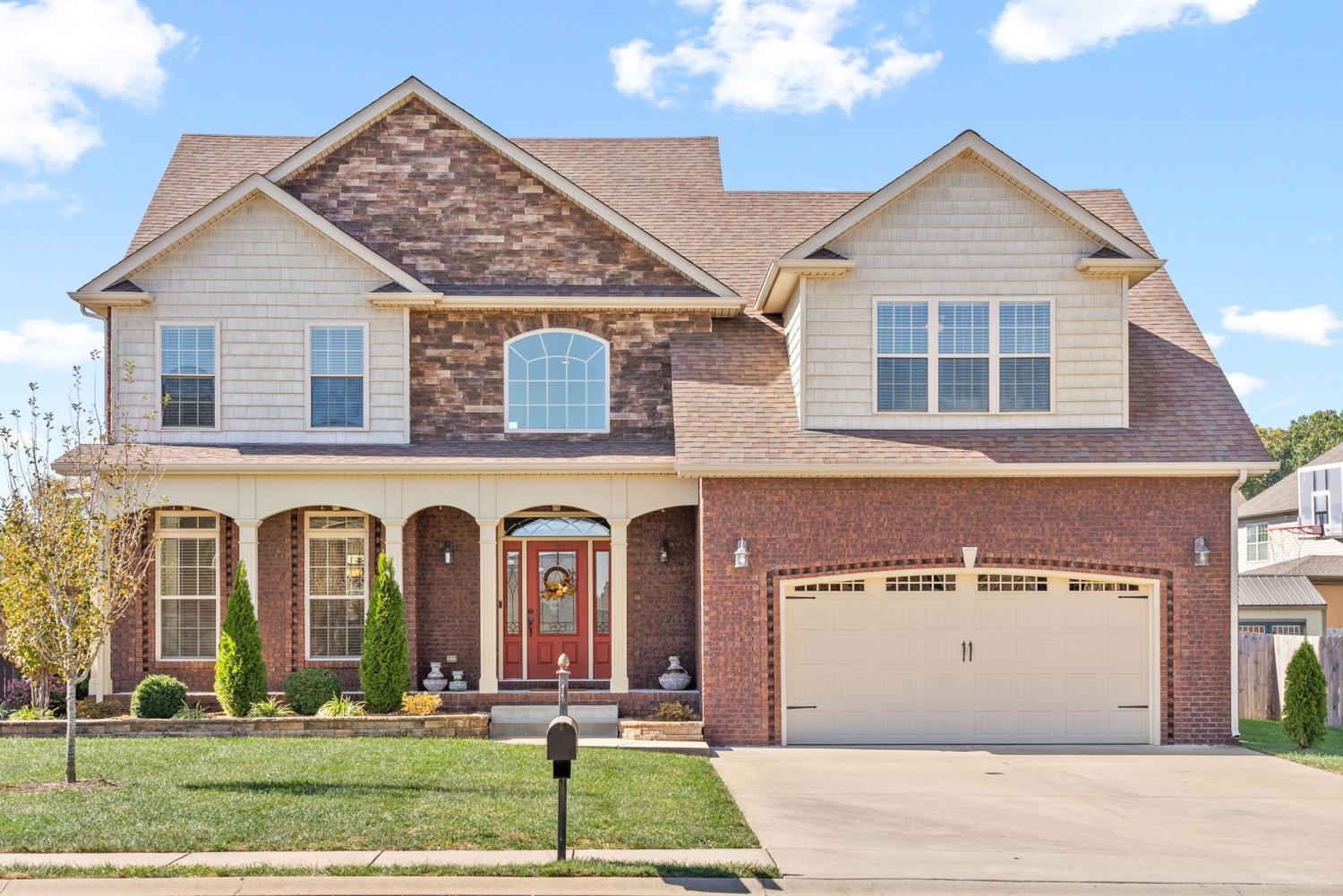 Immaculate all brick home in the sought after Farmington Subdivision. Step in to an expansive home with soaring ceilings, a formal dining room, a large kitchen with Double ovens, real hardwood floors, a large all season room in the back with a dedicated HVAC unit where you can watch the birds in your backyard full of vegetable plants and multiple fruit trees. The primary suite is on the main floor with all additional bedrooms upstairs. With a laundry list of additions including new landscaping and irrigation, new roof on the gorgeous all seasons room, raised garden beds, new windows, new paint in many areas, radon mitigation system, instant hot water system in the kitchen, new disposal, garage cabinets and much more, this home would be perfect for anyone! Home is covered by 2-10 home warranty that is transferable with acceptable offer. This home boasts a covered front porch, Huge yard, large formal dining room, hardwood floors, his & hers vanities and closets, sitting area in primary bedroom, huge shower and soaking tub, large bonus room/5th bedroom, natural gas, & much more. Neighborhood includes ponds, walking trails, basketball court, and playground. Easy access to I24 for a quick commute to Nashville & Fort Campbell. Home is covered by 2-10 home warranty that is transferable with acceptable offer.