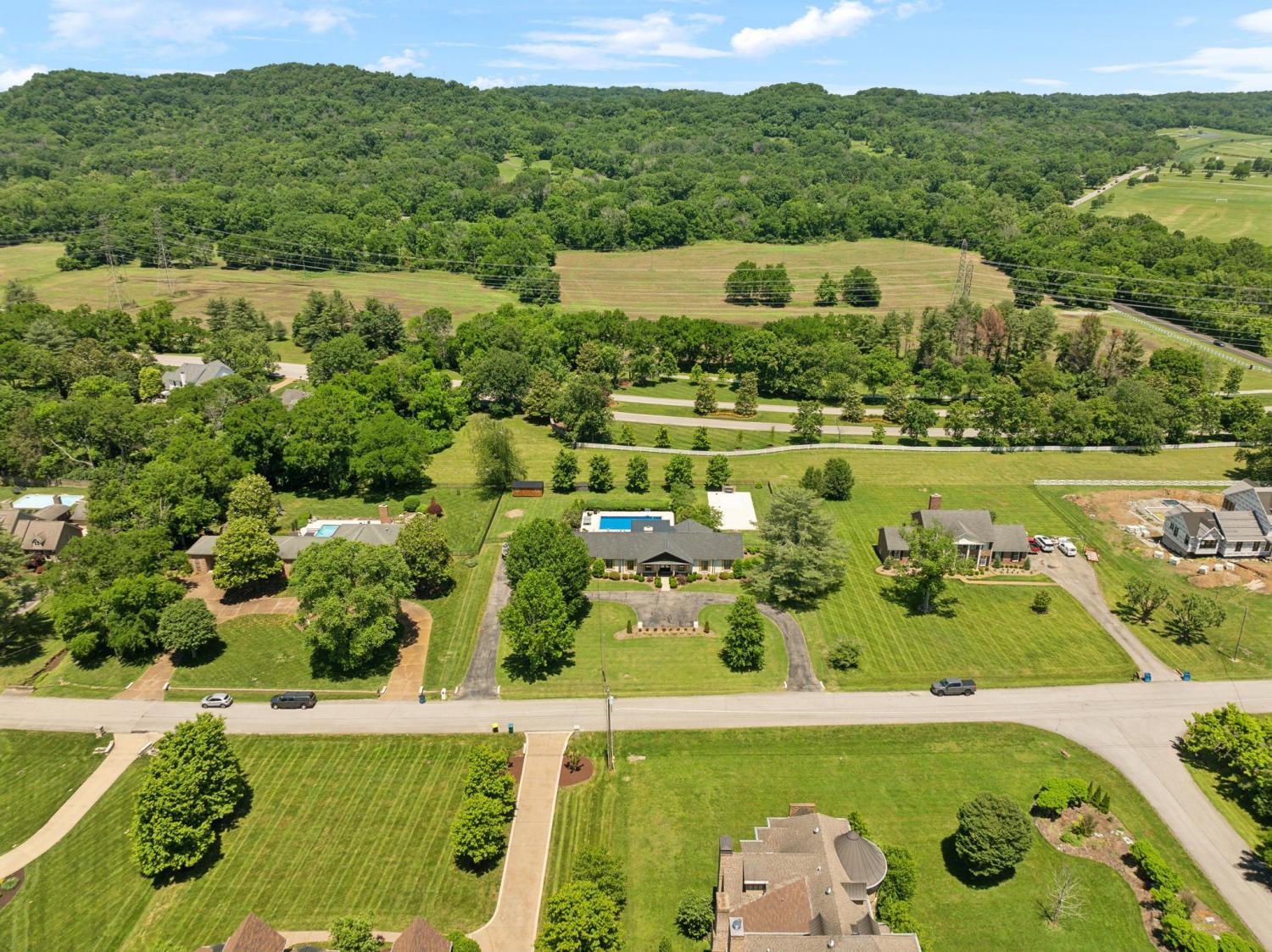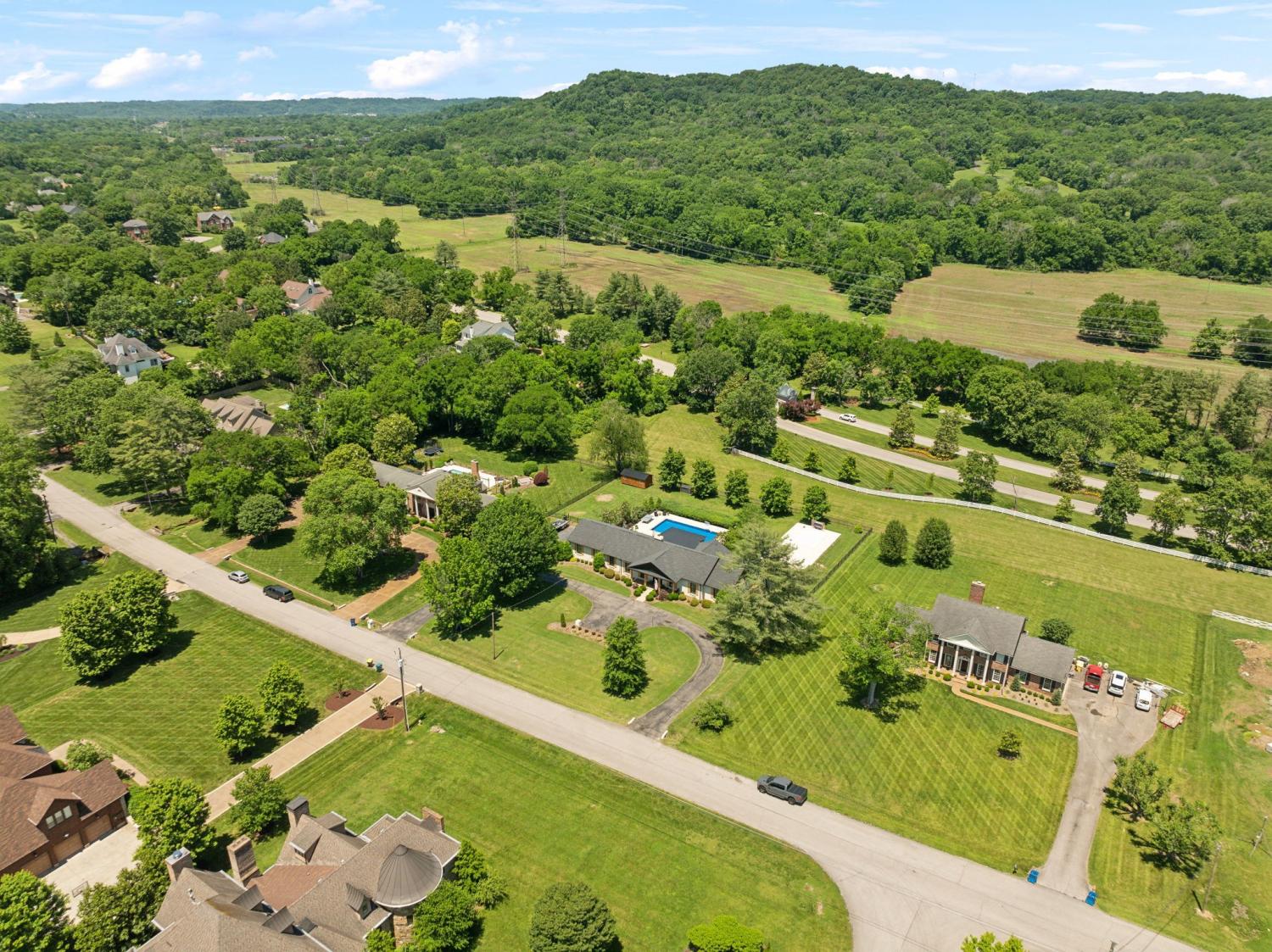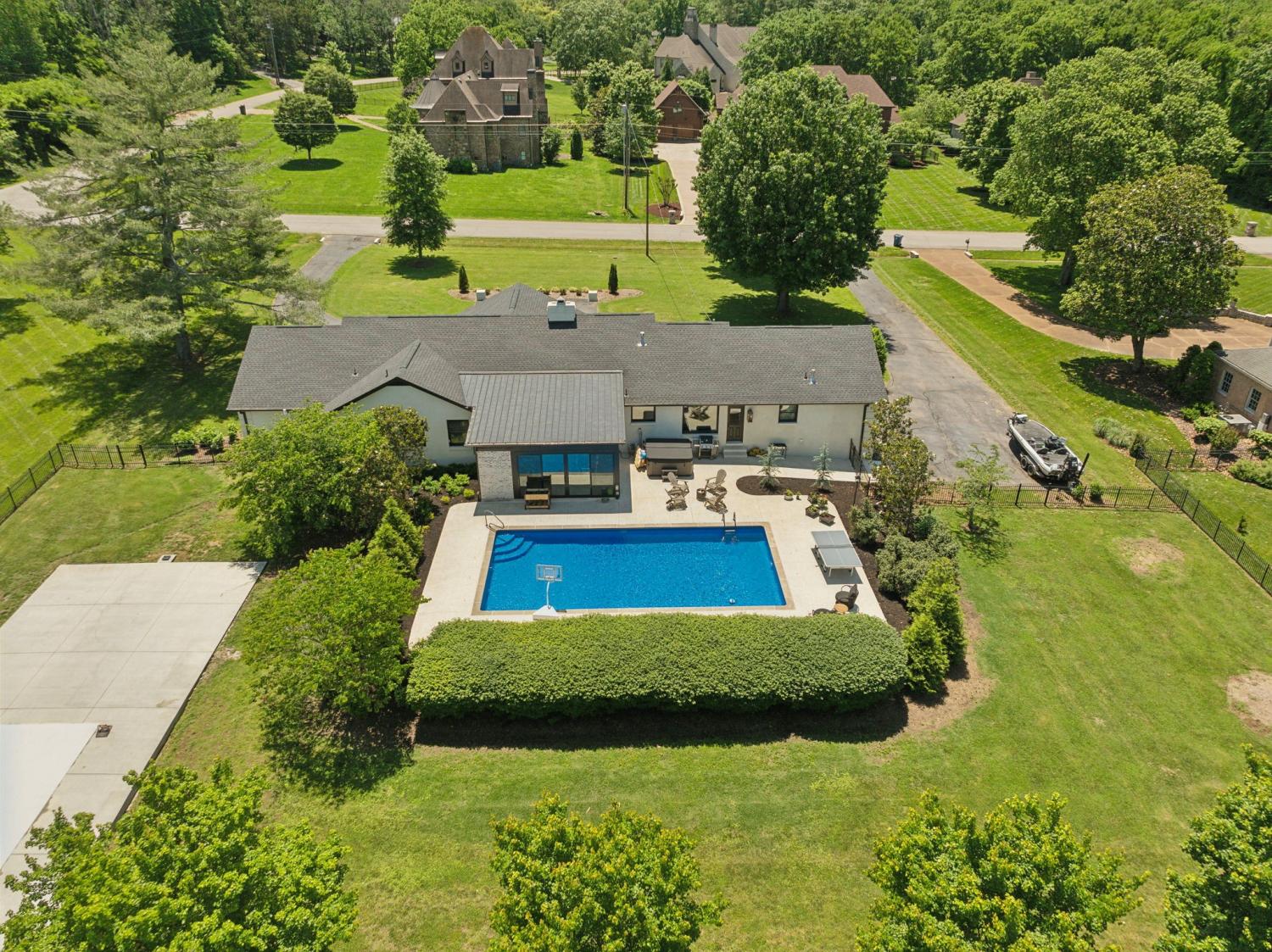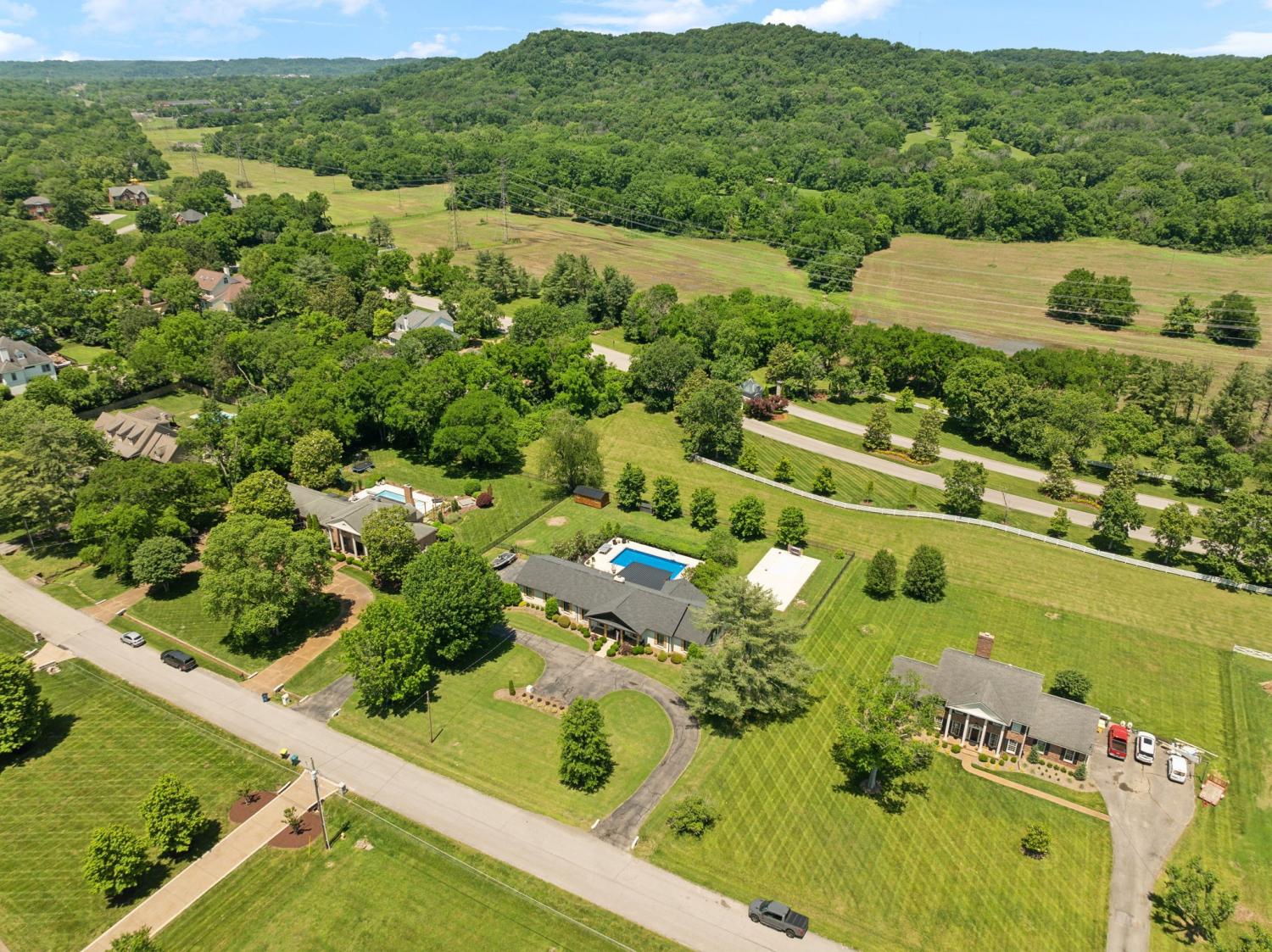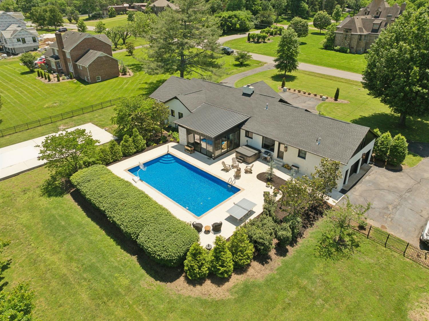Located in a peaceful neighborhood just minutes from Warner Parks and Cheekwood, this stunning 4-bedroom, 3.5-bath ranch-style home blends comfort, style, and functionality. Situated on a flat, one-acre lot, the property features a fenced backyard with a resurfaced saltwater pool and deck (2024), plus a newly added 320 sq. ft. Four Seasons room with cedar ceiling and a cozy gas fireplace—perfect for year-round enjoyment. New sport court concrete pad recently added for pickle ball or basketball! Offering a total of 3,807 sq. ft., the home boasts a spacious family room with gas fireplace that flows seamlessly into the updated kitchen, complete with new appliances, lighting, backsplash, and countertops. The newly renovated primary suite bathroom includes a soaking tub and separate shower. Hardwood floors run throughout the main level. Upstairs, you'll find a versatile bonus/media room, ideal for entertainment or additional living space. The attached two-car garage features epoxy flooring, and the home's curb appeal is enhanced with newly installed copper gas lanterns, new exterior doors, and fresh stucco over brick. Located in desirable Williamson County, this home is zoned for award-winning Grassland Elementary, Grassland Middle, and Franklin High School. No HOA.