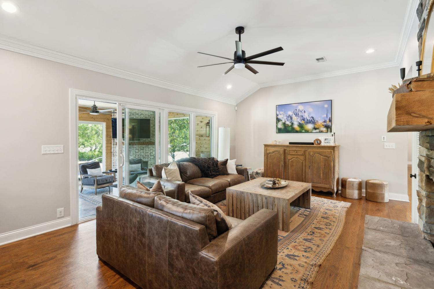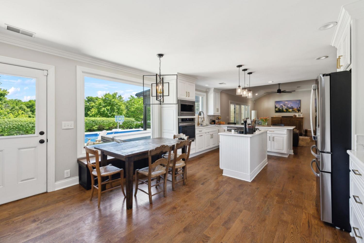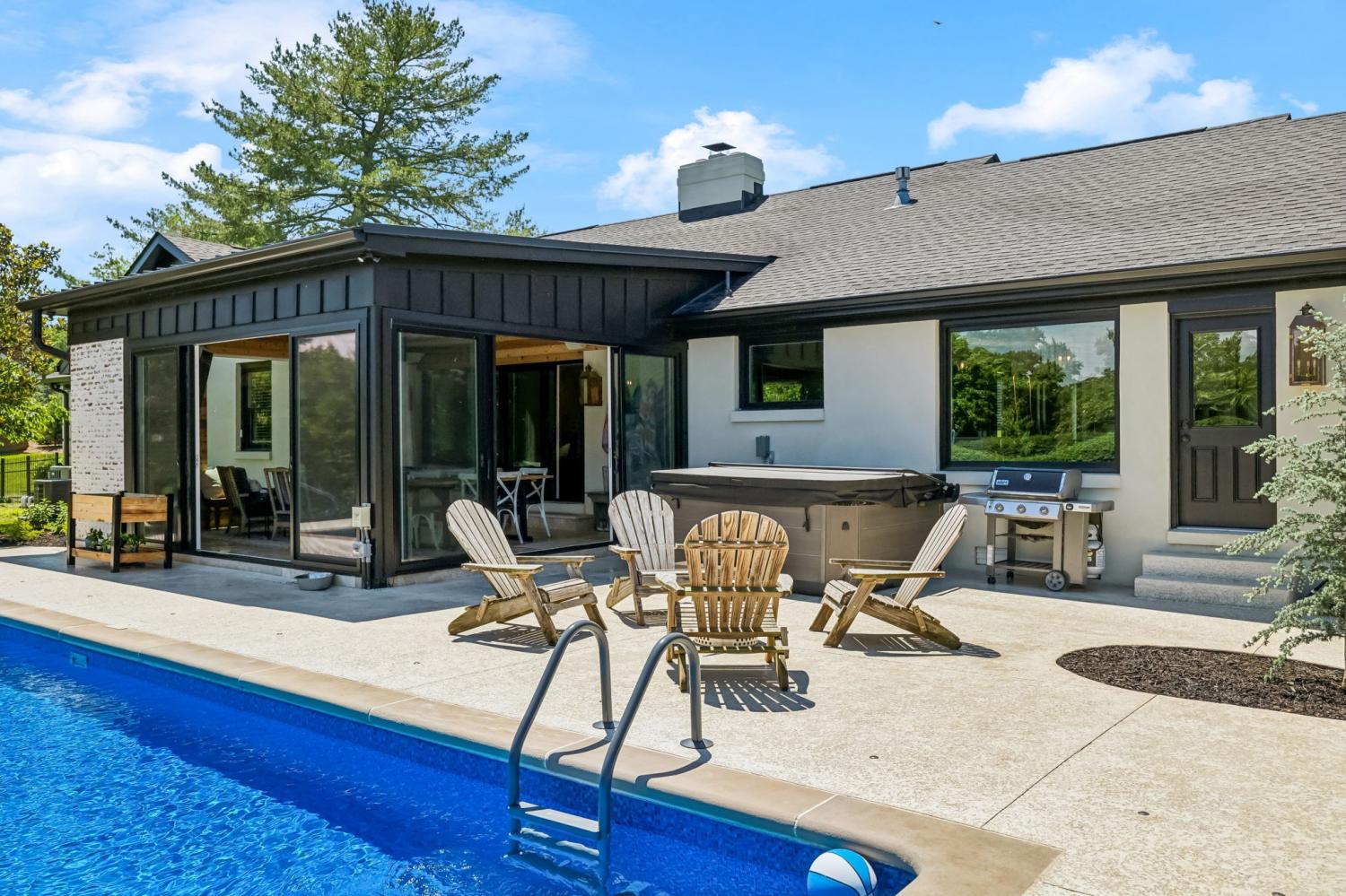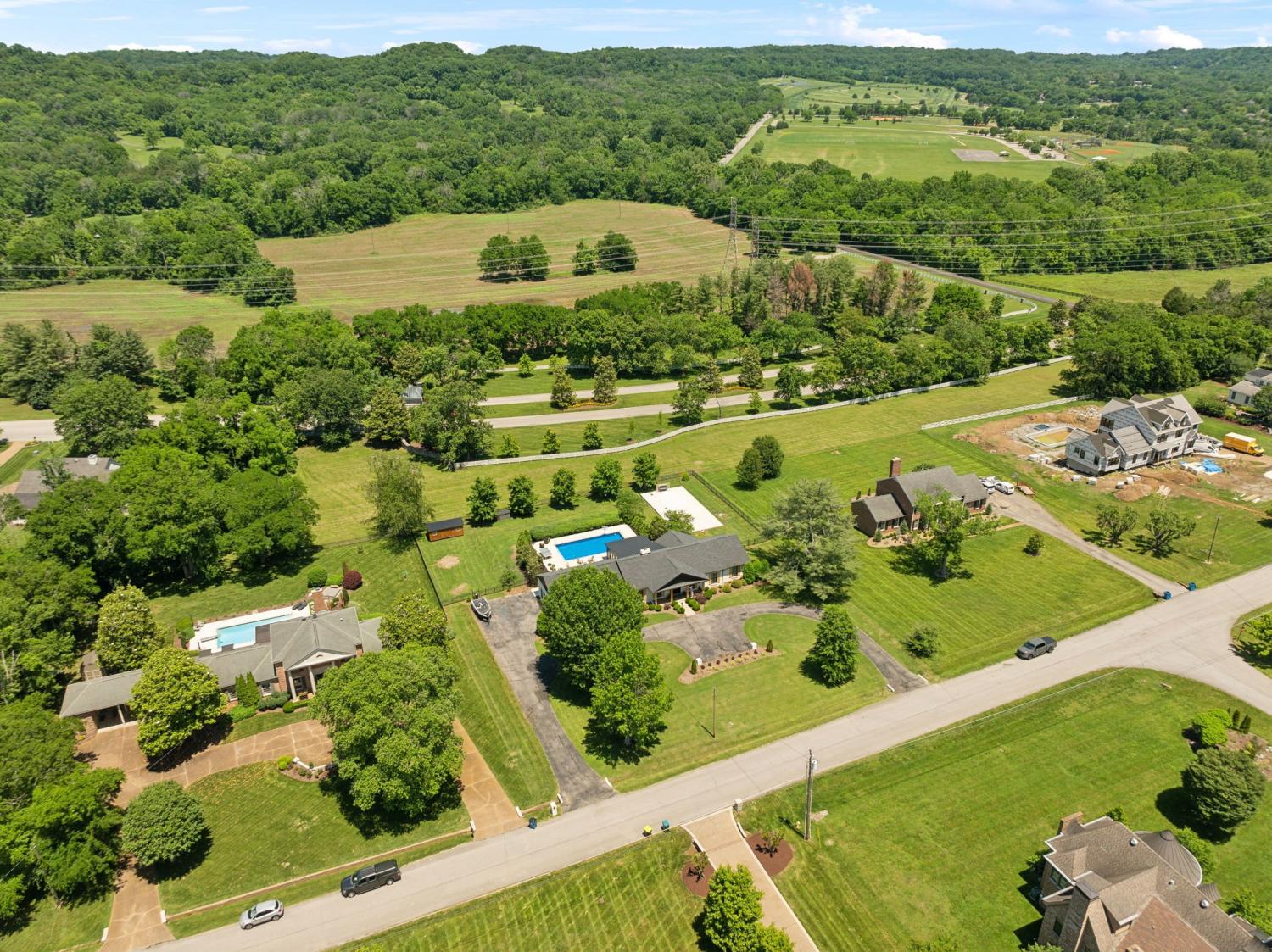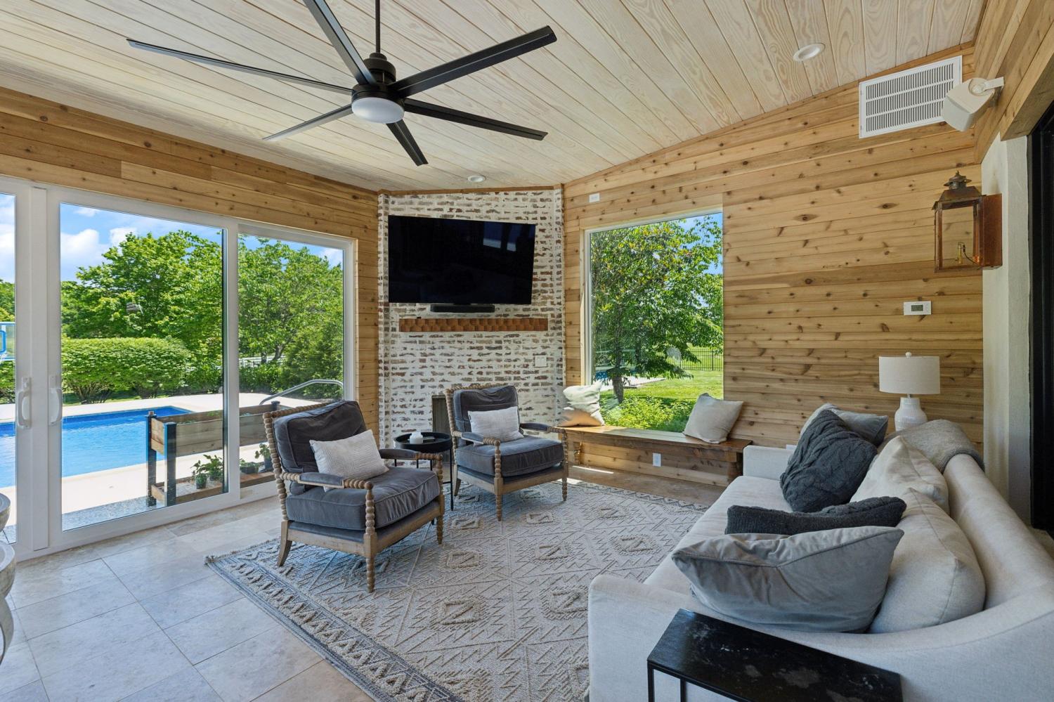 Located in a peaceful neighborhood just minutes from Warner Parks and Cheekwood, this stunning 4-bedroom, 3.5-bath ranch-style home blends comfort, style, and functionality. Situated on a flat, one-acre lot, the property features a fenced backyard with a resurfaced saltwater pool and deck (2024), plus a newly added 320 sq. ft. Four Seasons room with cedar ceiling and a cozy gas fireplace—perfect for year-round enjoyment. New sport court concrete pad recently added for pickle ball or basketball! Offering a total of 3,807 sq. ft., the home boasts a spacious family room with gas fireplace that flows seamlessly into the updated kitchen, complete with new appliances, lighting, backsplash, and countertops. The newly renovated primary suite bathroom includes a soaking tub and separate shower. Hardwood floors run throughout the main level. Upstairs, you'll find a versatile bonus/media room, ideal for entertainment or additional living space. The attached two-car garage features epoxy flooring, and the home's curb appeal is enhanced with newly installed copper gas lanterns, new exterior doors, and fresh stucco over brick. Located in desirable Williamson County, this home is zoned for award-winning Grassland Elementary, Grassland Middle, and Franklin High School. No HOA.