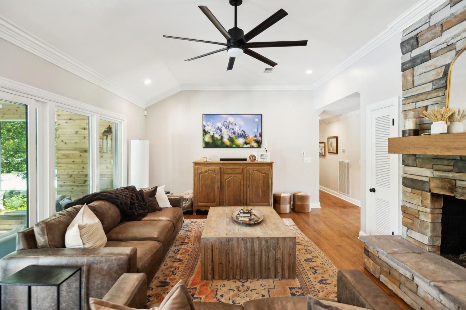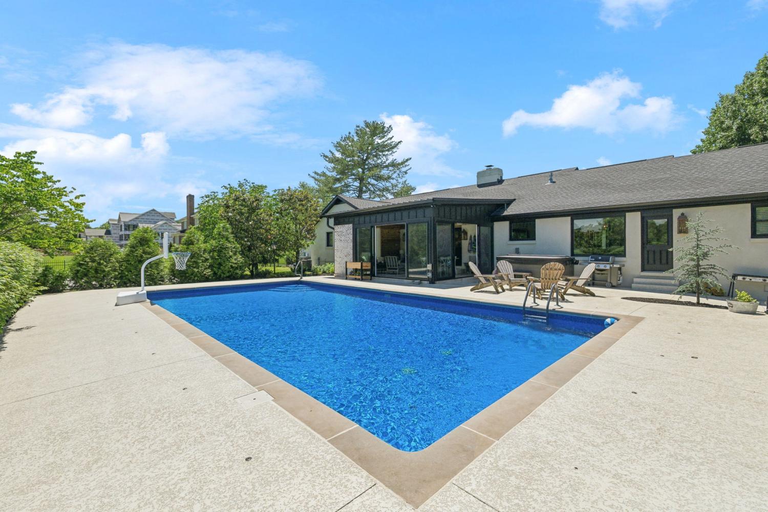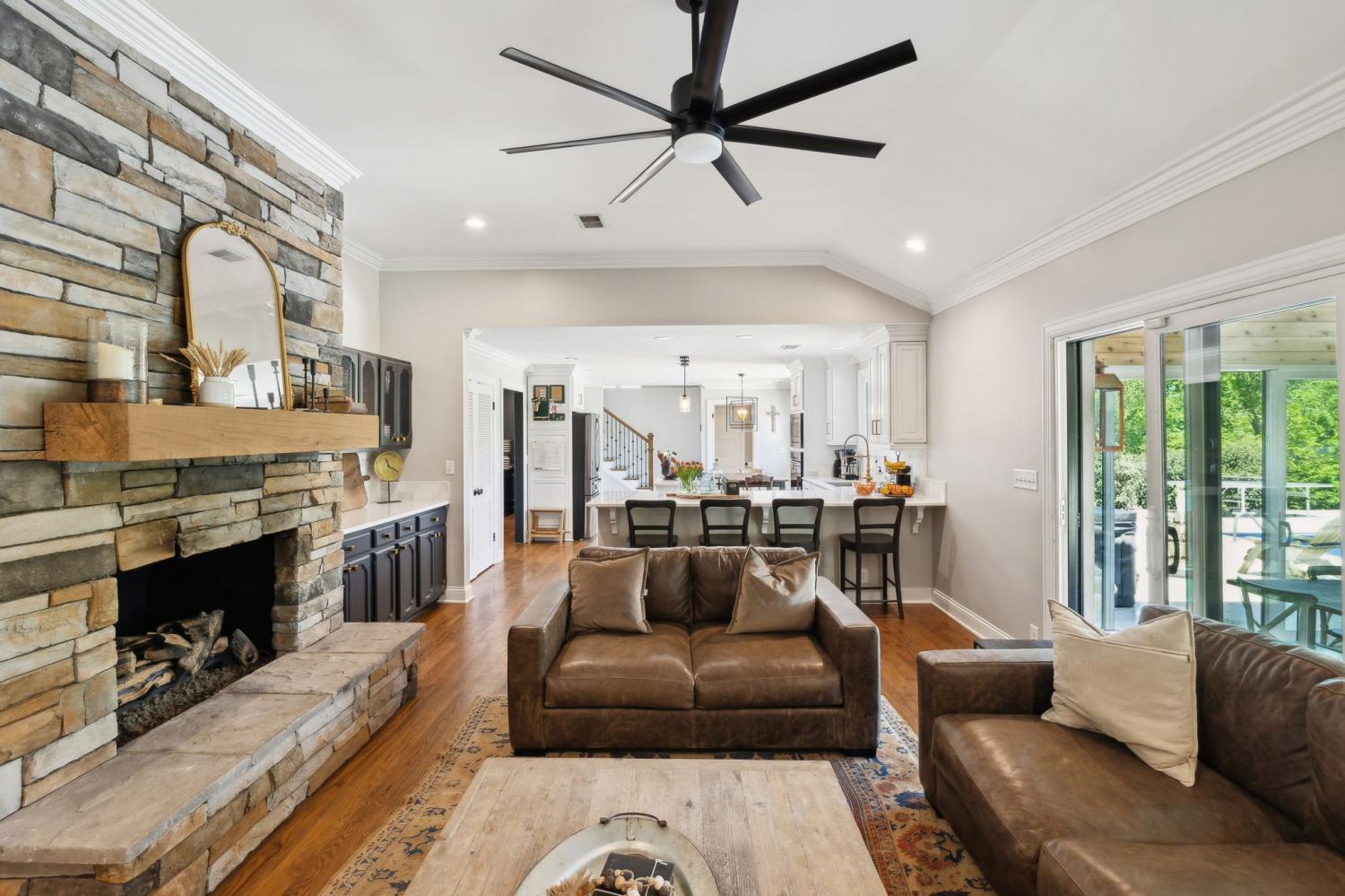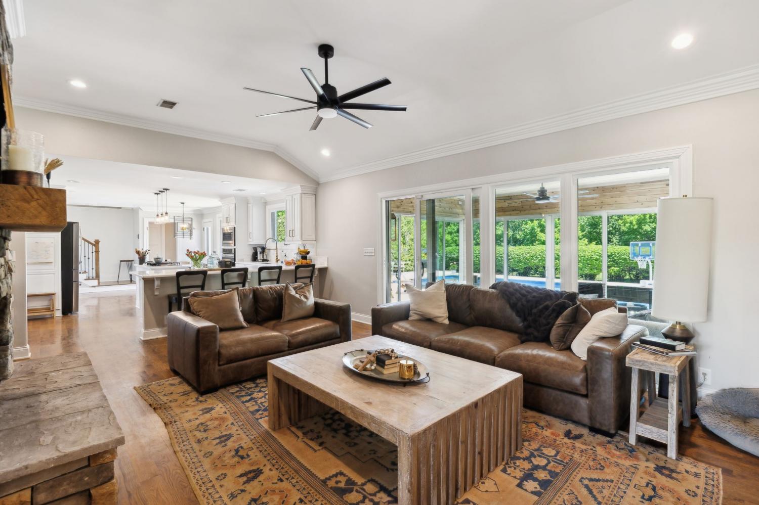 Located in a peaceful neighborhood just minutes from Warner Parks and Cheekwood, this stunning 4-bedroom, 3.5-bath ranch-style home blends comfort, style, and functionality. Situated on a flat, one-acre lot, the property features a fenced backyard with a resurfaced saltwater pool and deck (2024), plus a newly added 320 sq. ft. Four Seasons room with cedar ceiling and a cozy gas fireplace—perfect for year-round enjoyment. New sport court concrete pad recently added for pickle ball or basketball! Offering a total of 3,807 sq. ft., the home boasts a spacious family room with gas fireplace that flows seamlessly into the updated kitchen, complete with new appliances, lighting, backsplash, and countertops. The newly renovated primary suite bathroom includes a soaking tub and separate shower. Hardwood floors run throughout the main level. Upstairs, you'll find a versatile bonus/media room, ideal for entertainment or additional living space. The attached two-car garage features epoxy flooring, and the home's curb appeal is enhanced with newly installed copper gas lanterns, new exterior doors, and fresh stucco over brick. Located in desirable Williamson County, this home is zoned for award-winning Grassland Elementary, Grassland Middle, and Franklin High School. No HOA.