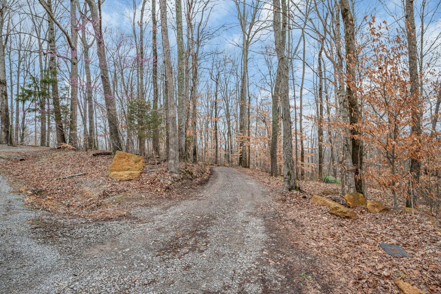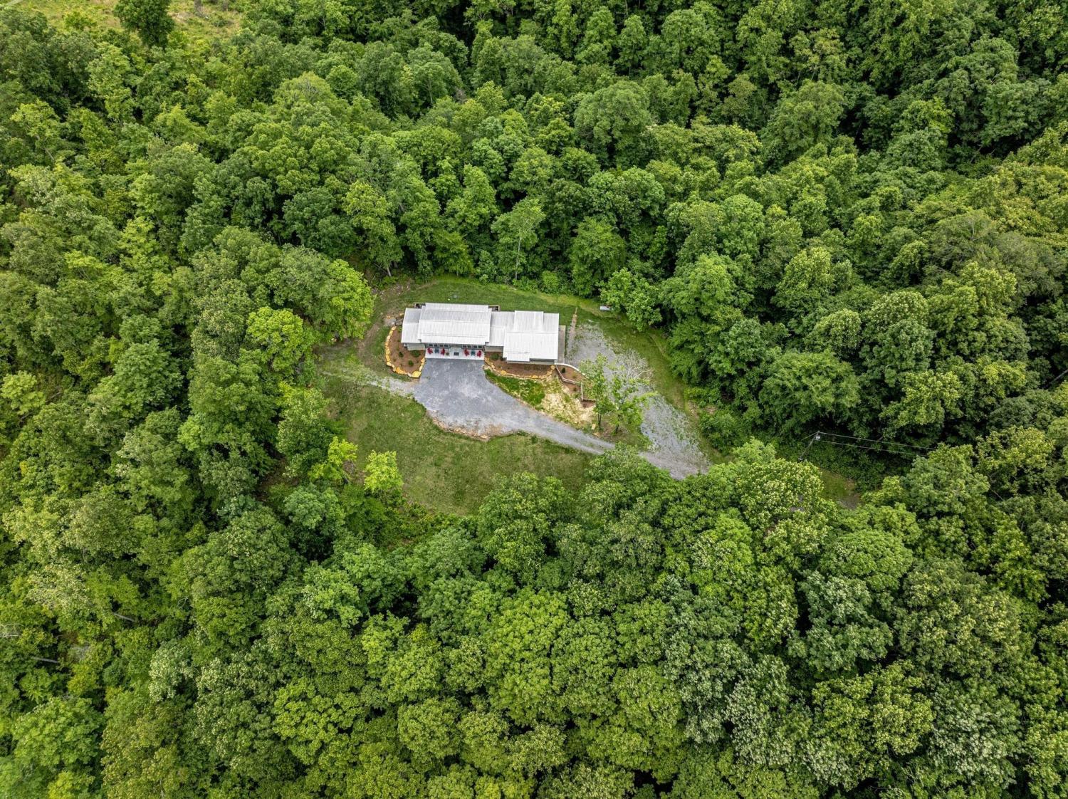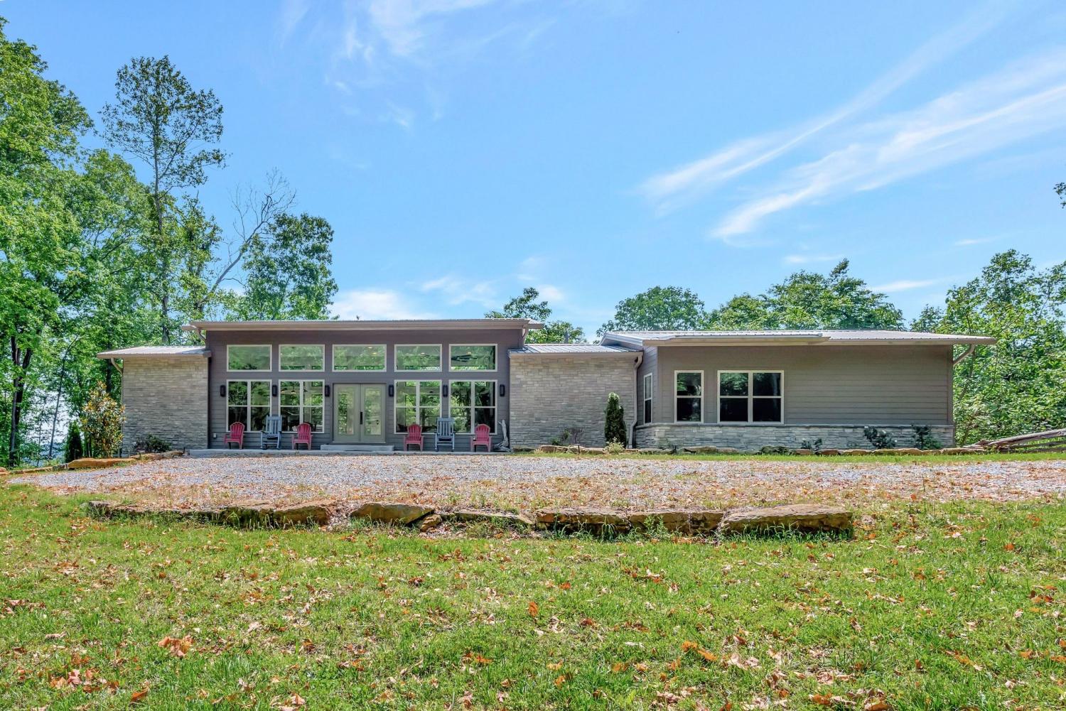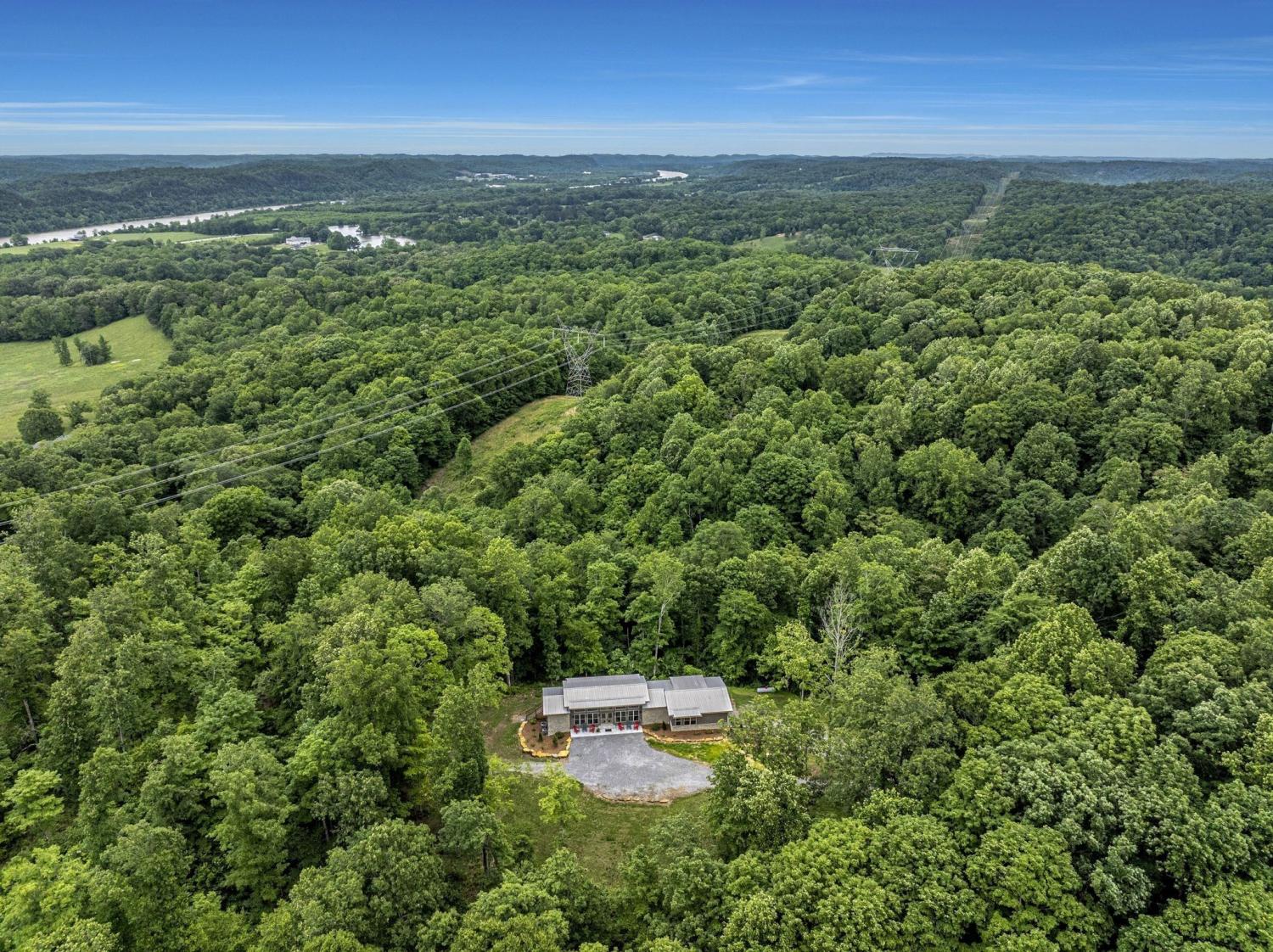 Lender Incentives! Stunning Contemporary Retreat situated on your Own Private Ridge w7.91 Wooded Acres. Perched 300’ above the Cumberland River Valley you have distant Views of River below. This residence reflects the homeowners Architectural Ingenuity, Seamlessly blending its Natural Surroundings w Modern Comfort & Convenience. Its walls of stone + timber echo the rugged beauty of the wilderness that surrounds it, all the while 56 expansive windows invite the breathtaking panorama of the river & tree lined valley. The living spaces are bathed in natural light w 12 foot +ceilings 32’ of glass on ea side of the main level anchored by stone FP Kitchen w island + Bar Top w Glass Garage DOOR complete w oak slab cut from the property overlooking the 50’ deck& ideal vantage point for river vistas, treetops & wildlife. First flr Primary Bedrm w vaulted ceilings en-suite w shower & stand-alone tub, Lower Level w 10’ ceilings Rec Rm Bedrooms 3& 4,wet bar all overlooking covered patio + Oversized heated and cooled 2 car garage! w Dog Washing Rm Architects Custom Built Home
