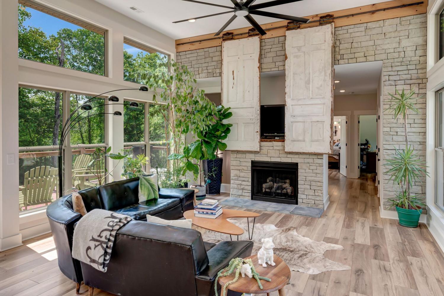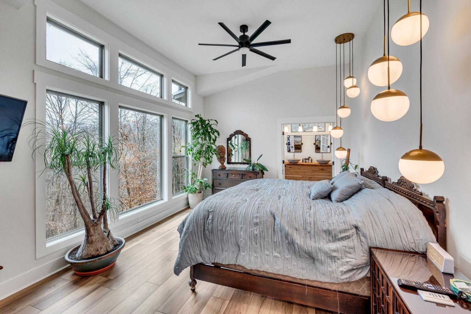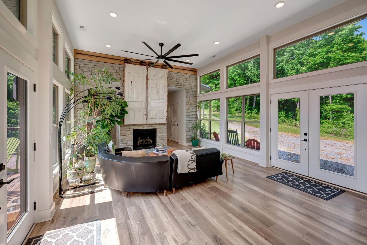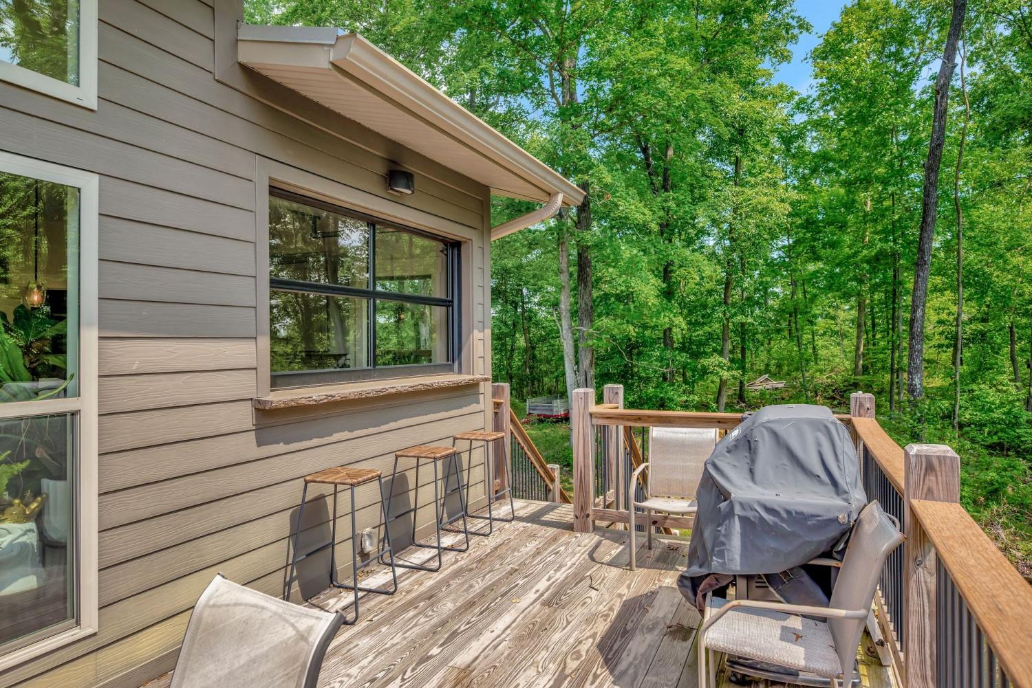 Lender Incentives! Stunning Contemporary Retreat situated on your Own Private Ridge w7.91 Wooded Acres. Perched 300’ above the Cumberland River Valley you have distant Views of River below. This residence reflects the homeowners Architectural Ingenuity, Seamlessly blending its Natural Surroundings w Modern Comfort & Convenience. Its walls of stone + timber echo the rugged beauty of the wilderness that surrounds it, all the while 56 expansive windows invite the breathtaking panorama of the river & tree lined valley. The living spaces are bathed in natural light w 12 foot +ceilings 32’ of glass on ea side of the main level anchored by stone FP Kitchen w island + Bar Top w Glass Garage DOOR complete w oak slab cut from the property overlooking the 50’ deck& ideal vantage point for river vistas, treetops & wildlife. First flr Primary Bedrm w vaulted ceilings en-suite w shower & stand-alone tub, Lower Level w 10’ ceilings Rec Rm Bedrooms 3& 4,wet bar all overlooking covered patio + Oversized heated and cooled 2 car garage! w Dog Washing Rm Architects Custom Built Home