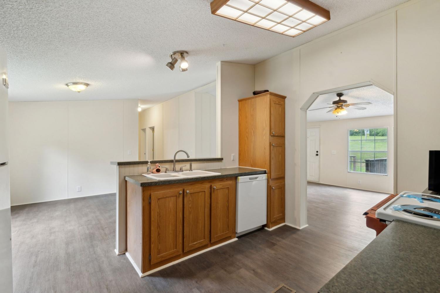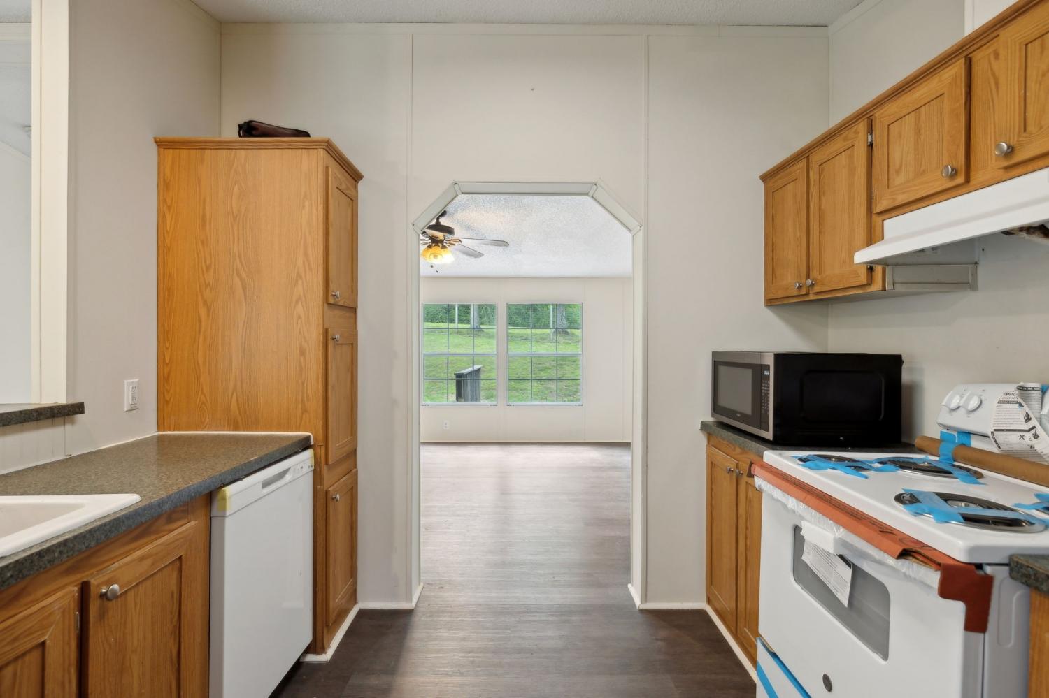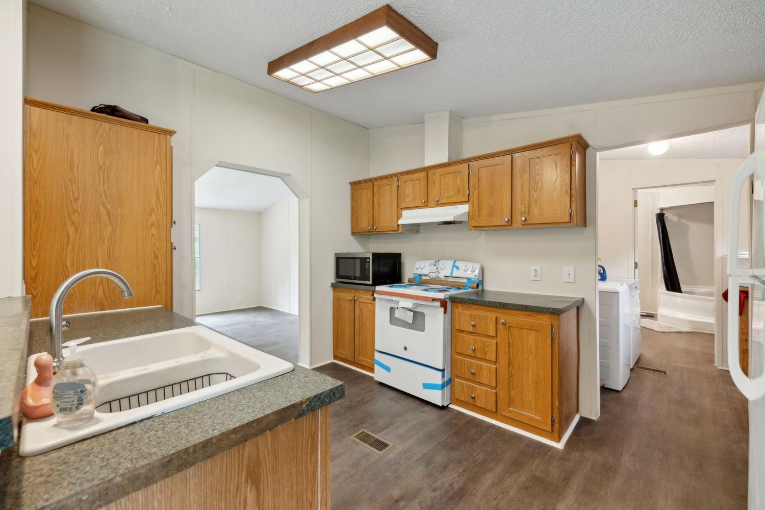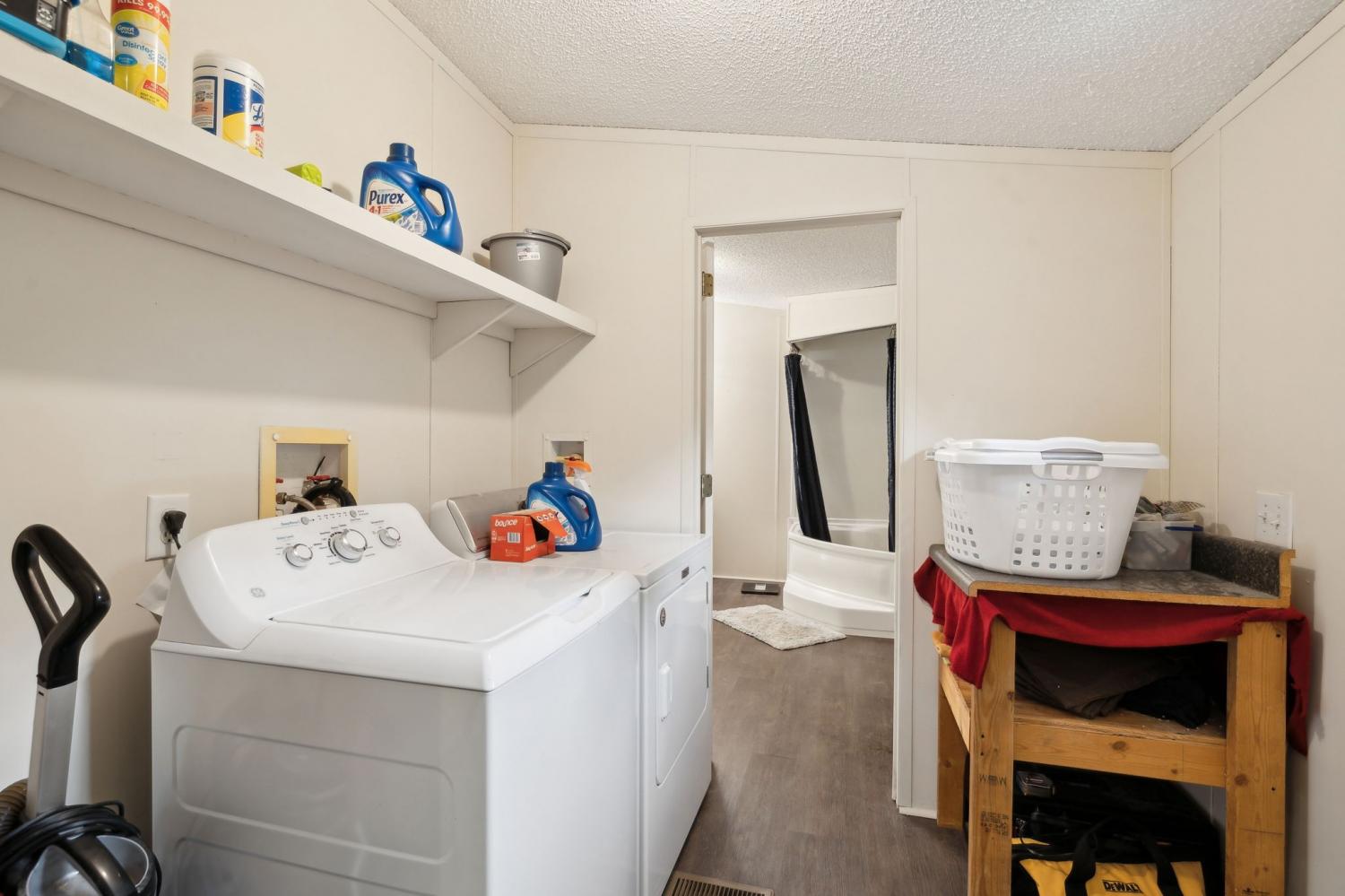 Easy Care! Manufactured home on a permanent foundation~LVP flooring throughout for easy care~ perfectly sized fenced in front yard for your loved ones both two and four legged~ all kitchen appliances remain (stove-new, dishwasher 1 year old, microwave-new), open kitchen/living room concept with bar for extra seating~large master suite and full bath with combo tub/shower only this tub is an oversized soaking tub~ detached garage could also be a good workshop~private back yard which is currently treed so you could clear out more space for a yard if you wanted~plenty of extra room for parking vehicles, boat or ATV