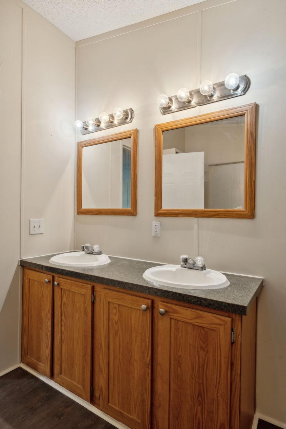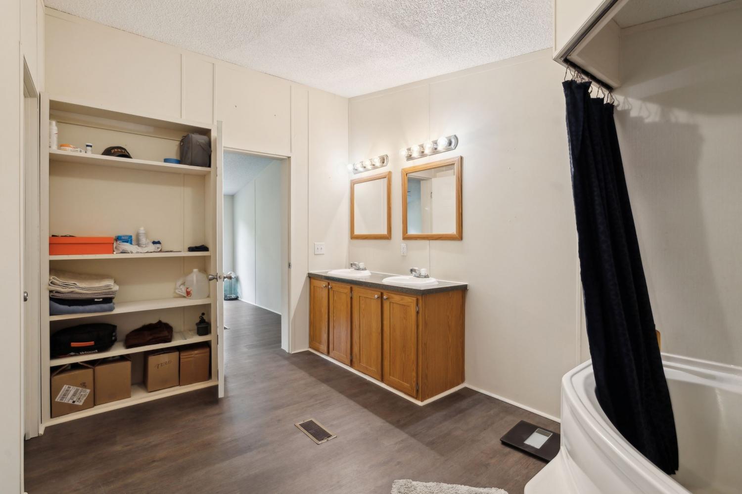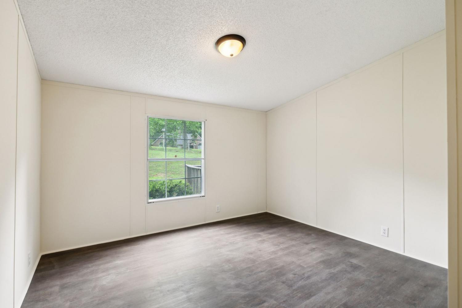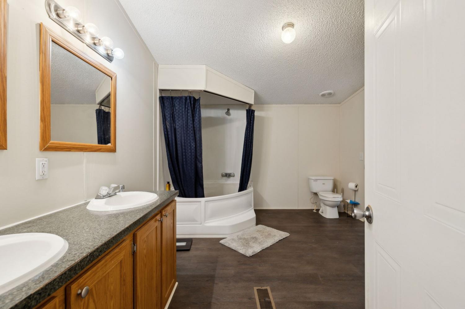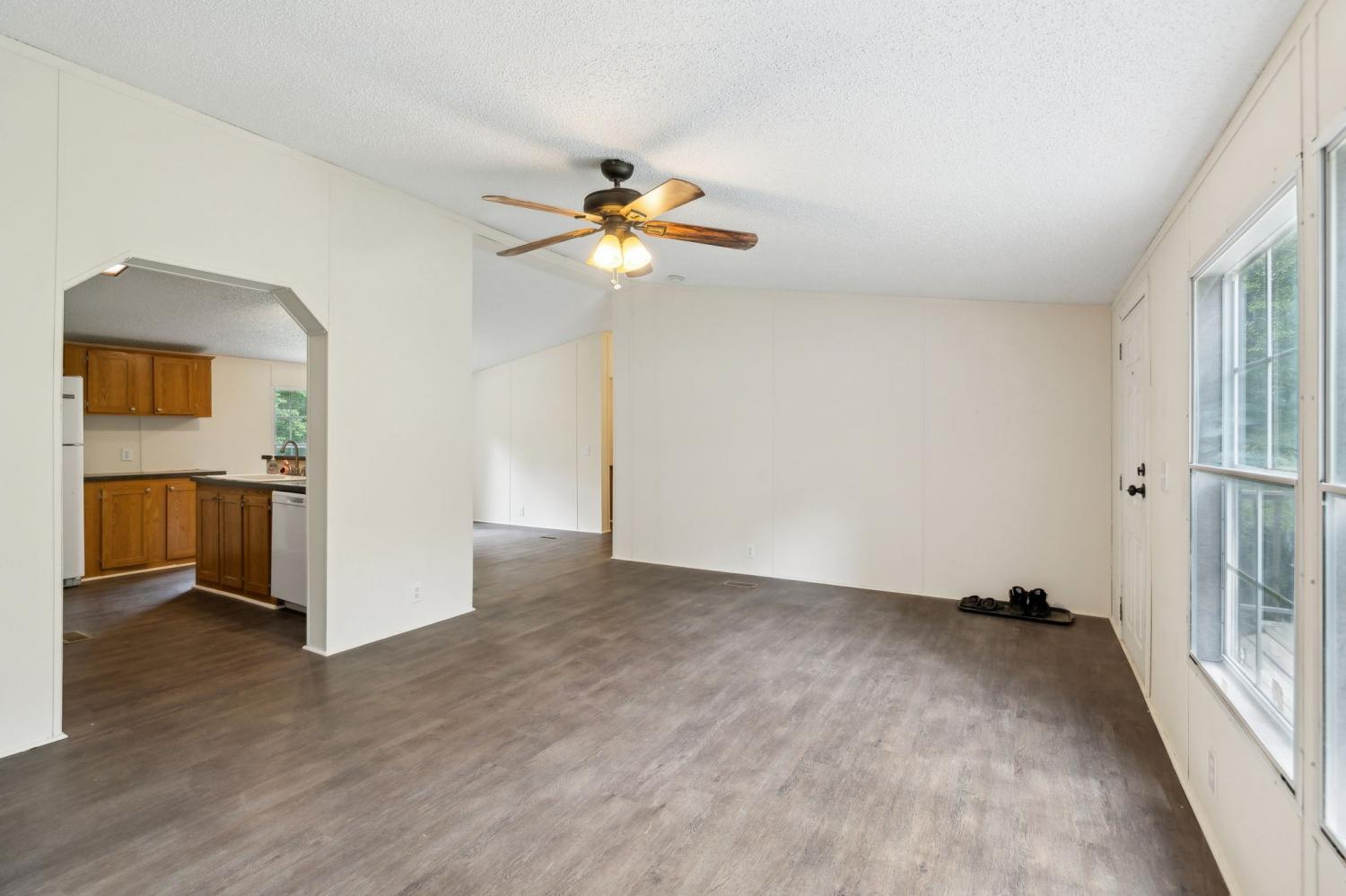 Easy Care! Manufactured home on a permanent foundation~LVP flooring throughout for easy care~ perfectly sized fenced in front yard for your loved ones both two and four legged~ all kitchen appliances remain (stove-new, dishwasher 1 year old, microwave-new), open kitchen/living room concept with bar for extra seating~large master suite and full bath with combo tub/shower only this tub is an oversized soaking tub~ detached garage could also be a good workshop~private back yard which is currently treed so you could clear out more space for a yard if you wanted~plenty of extra room for parking vehicles, boat or ATV