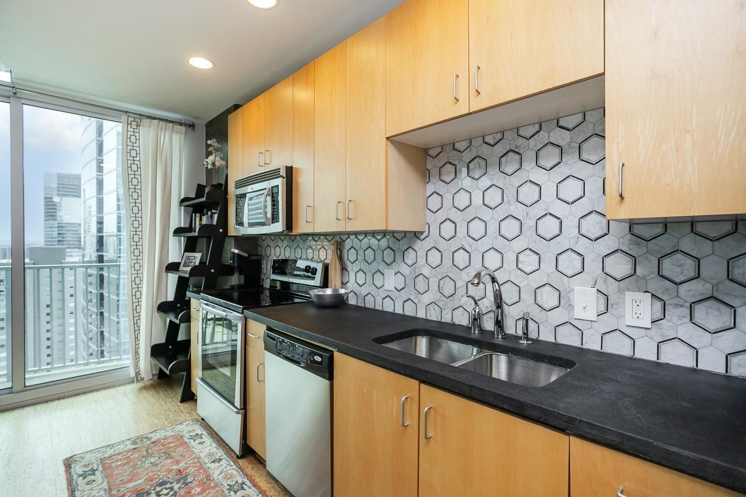 **Price Improvement**. Fully furnished, turnkey condo in the heart of downtown Nashville! YES, this one is completely furnished. This unit has new bamboo floors, new kitchen countertops and a beautiful backsplash design. In addition, the custom closet provides an abundant amount of storage. The Viridian boasts the only true rooftop pool on the 31st floor, overlooking downtown and the Nissan Stadium. The clubroom and fitness center are located on the 31st floor as well. Additional amenities include 24/7 Concierge service and Google Fiber. The location offers direct access to Broadway, Bridgestone Arena, Ryman, Printer’s Alley, Nissan Stadium, 5th and Broad, newly renovated Arcade, and Nashville Yards, housing the Pinnacle music venue, many new restaurants/bars, bowling alley, and movie theater. Unit conveys with 1 deeded parking spot. This unit has been smoke free and pet free. Just bring your clothes and you are ready to enjoy all urban living has to offer!