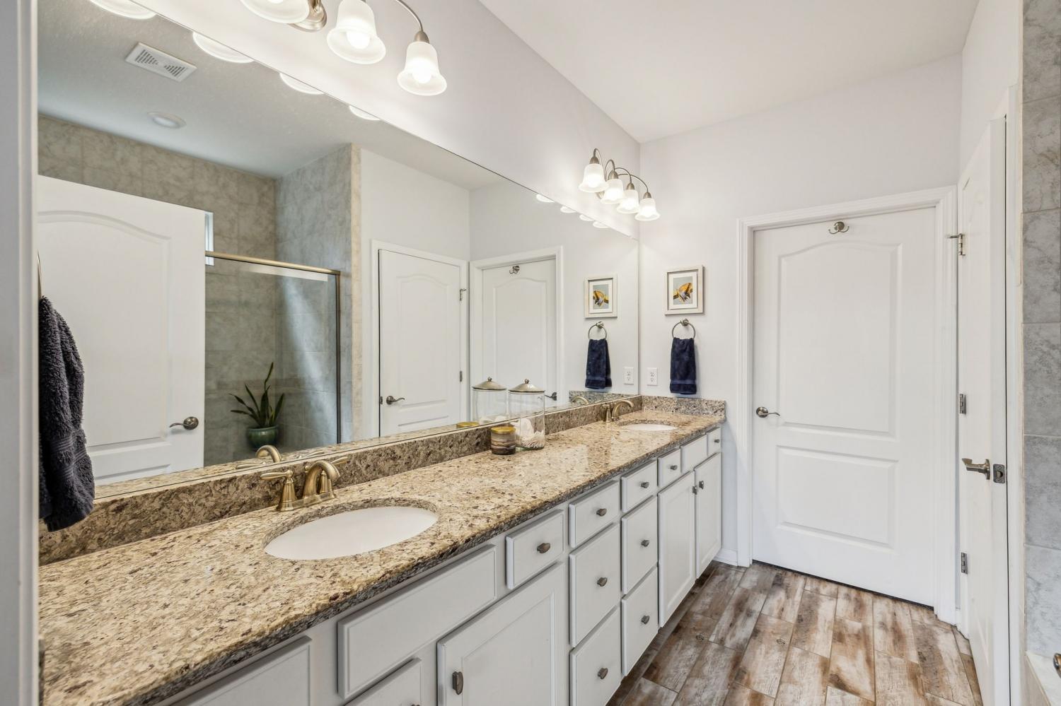 LIKE NEW with NEW PRICE! and Ready for quick move-in!This much loved, beautiful 2 story home with Abbeyville floor plan is elegantly placed on the western edge of the Southern Springs 55+ Del Webb community. From the patio is a view of the historically preserved Rippa Villa Plantation;a perfect spot to relax or entertain. This beautifully maintained home features 3 bedrooms, 3 full baths.The owner’s retreat provides a water closet, abundant double sink vanity with lots of drawers,walk-in tile shower, and a huge walk-in closet. The master area has large windows facing the backyard and is equipped with blackout shades.The first floor provides a sunny sitting room with lots of natural light overlooking the easily maintained gardens, grape arbor and tree dotted backyard.The living/dining/kitchen area is structured in the open concept design, making living and socializing easy. The living room contains wiring that accommodates a smart TV and contains wiring that includes 2 ceiling speakers for surround sound effects. In addition to these areas, there’s a study with French Doors, and a bedroom with full bath. A roomy laundry room is conveniently located next to the owner’s retreat. When you enter from the garage, there’s a drop zone and an additional coat closet that also houses the smart technology for electronics. The kitchen features a large island with granite countertops for entertaining family and friends, The water proof and scratch resistant, the tasteful LVP flooring ties everything together. Upstairs is a third bedroom, with walk-in closet,full bath, and flexible family/rec/bonus room, plus an additional easy access large storage closet.There is a large, floored attic storage area in the furnace area.This home has a whole house water filtration system, tankless water heater and hot water recirculation system.The fully fenced lawn and landscape beds are fully irrigated.Sunsets on the covered patio are breathtaking!This community is truly resort style living!