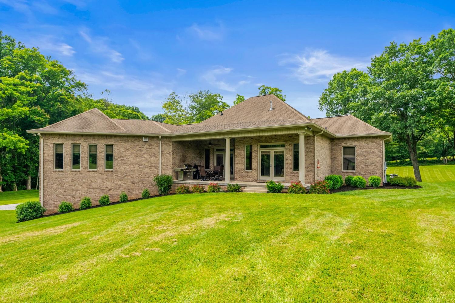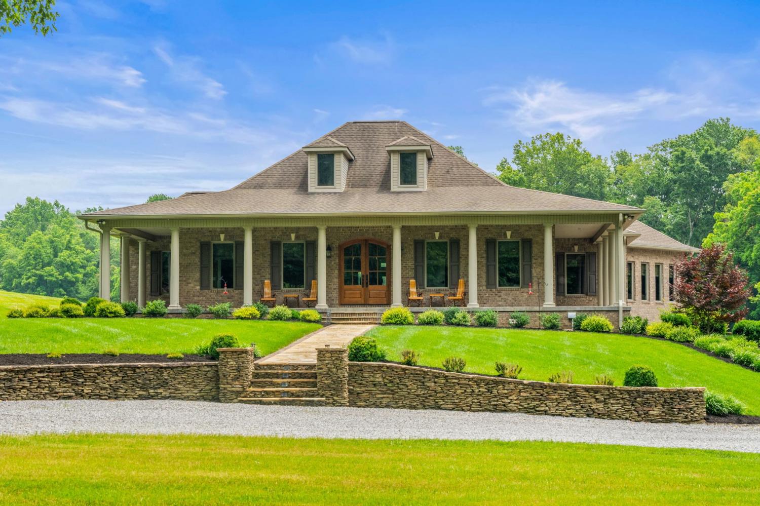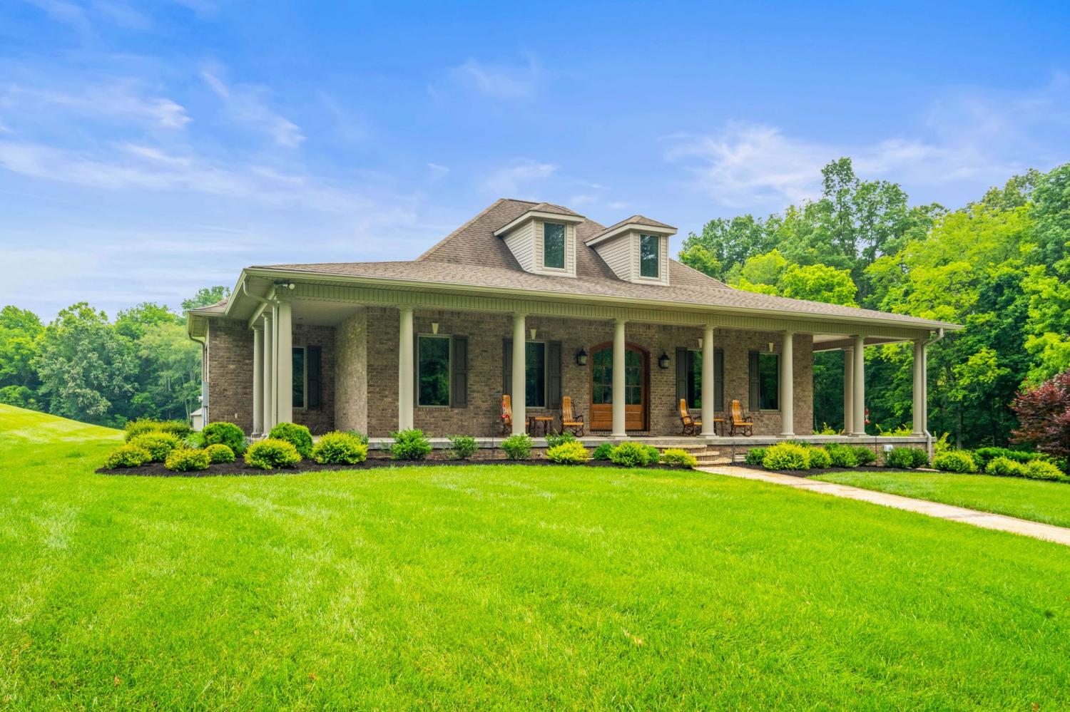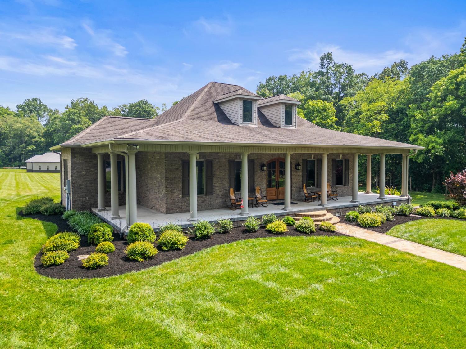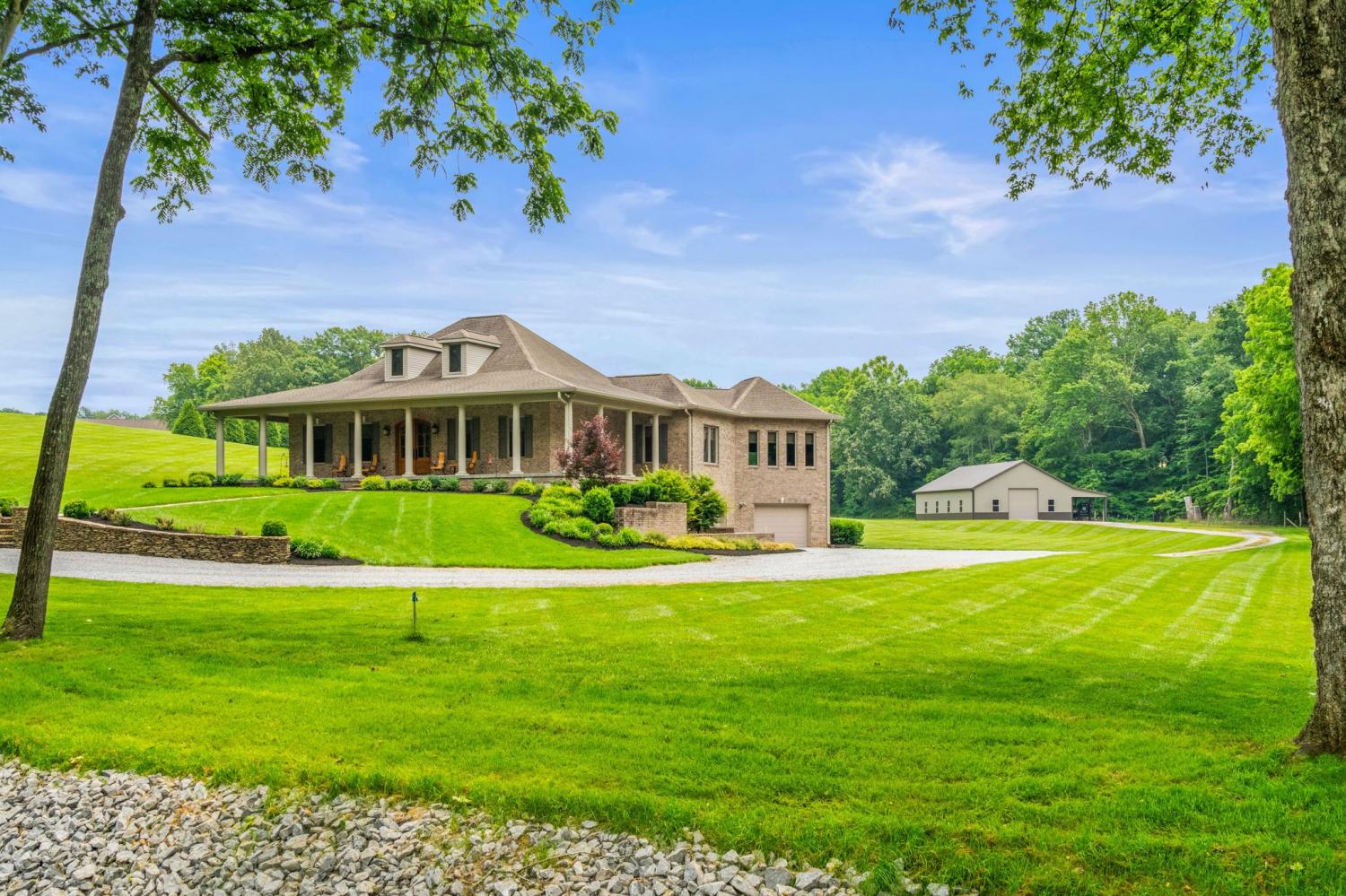 This beautiful custom home with timeless design has 12 acres of manicured privacy. The stunning all-brick estate with wrap around porch, huge columns and a set of solid mahogany front doors lead into an open concept that is warm and inviting. Home features a 9x18 foyer with barrel ceiling, chef's kitchen w/ss appliances, DCS gas range and double ovens, the solid maple cabinetry, granite counter tops w/stone back splash, Bosch dishwasher, walk-in pantry w/extra shelving for storage, great rm with stone fireplace, surround sound and custom built-in cabinets and lighted shelving, crown molding throughout tells you this house was all custom built. Heirloom qualities in this home are on full display, ceilings that are 10, 12 and 15 ft, 6 ft casement windows for natural light, custom black-out shades when needed, handmade white oak flooring, porcelain tile and natural stone tile, french doors leading out to patio from primary and living rms, landscaping 2 yrs old with irrigation. Basement with 10 ft ceilings, a flex room thats 17x27 (3rd bedroom) 2 separate garage doors with workshop between. All attached shelving and cabinets will remain. 56x90 bldg with 40x60 enclosed. This property could easily be converted into a mini farm and the building into a stable. LOCATION, LOCATION, LOCATION. This property is minutes off I-24W, 30 min. from Nashville and 20 min. from Clarksville.