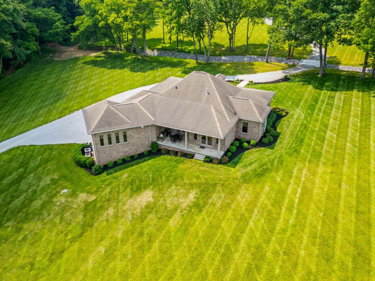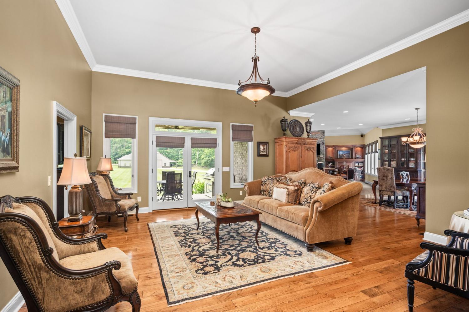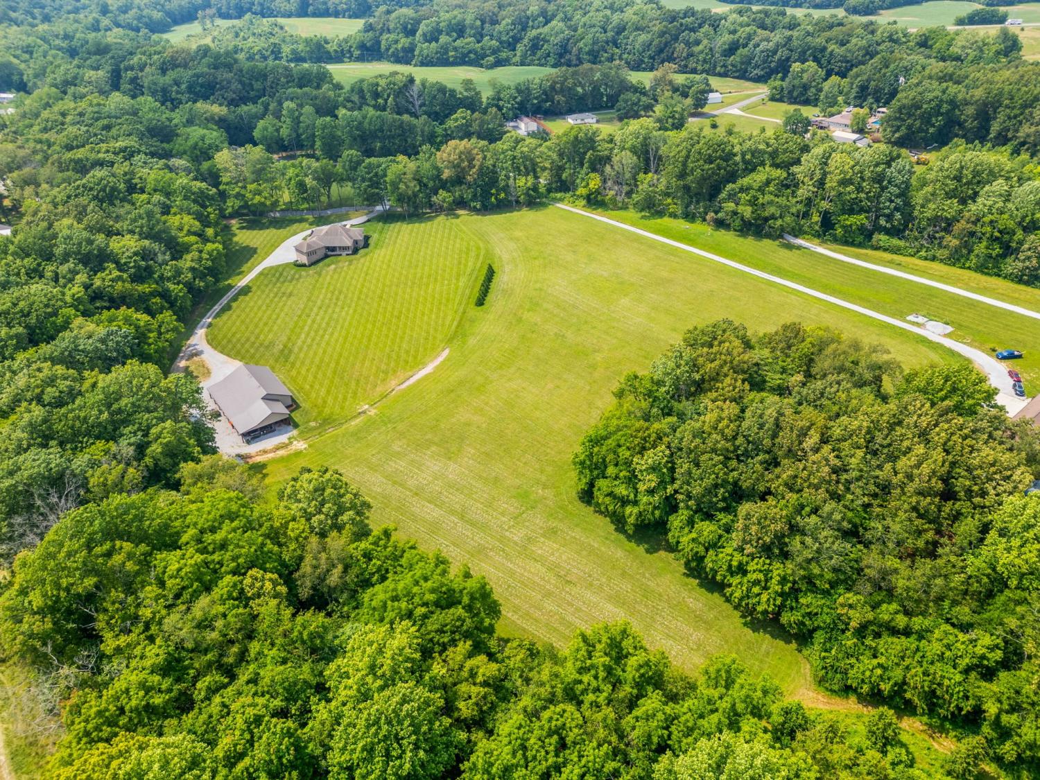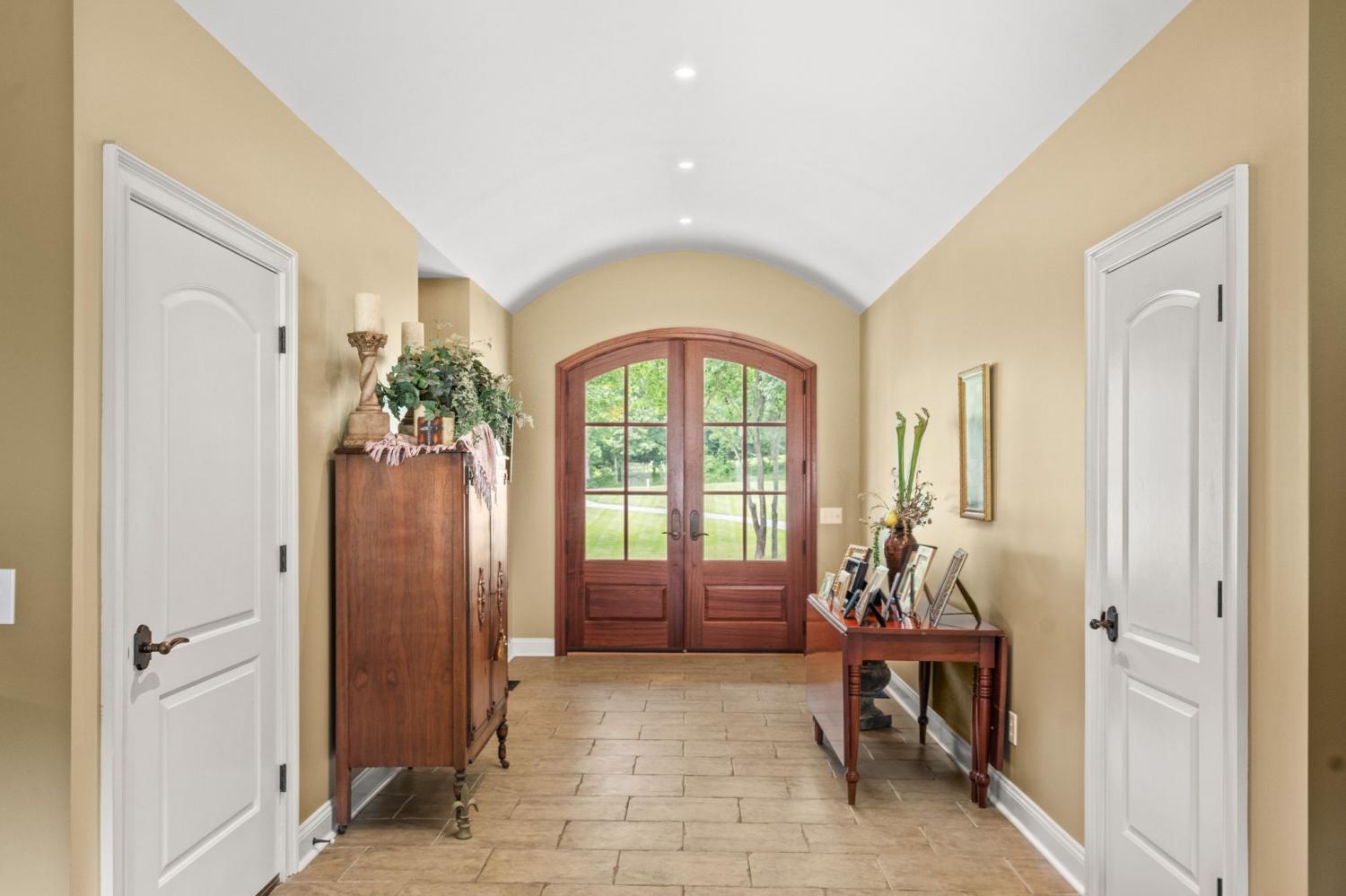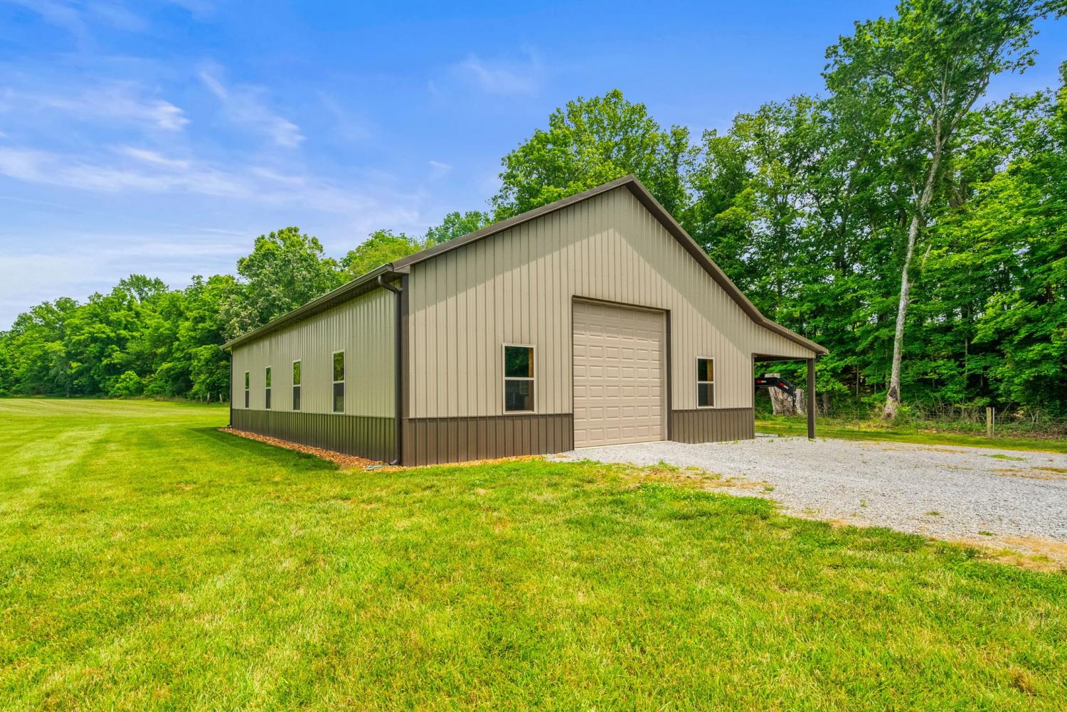 This beautiful custom home with timeless design has 12 acres of manicured privacy. The stunning all-brick estate with wrap around porch, huge columns and a set of solid mahogany front doors lead into an open concept that is warm and inviting. Home features a 9x18 foyer with barrel ceiling, chef's kitchen w/ss appliances, DCS gas range and double ovens, the solid maple cabinetry, granite counter tops w/stone back splash, Bosch dishwasher, walk-in pantry w/extra shelving for storage, great rm with stone fireplace, surround sound and custom built-in cabinets and lighted shelving, crown molding throughout tells you this house was all custom built. Heirloom qualities in this home are on full display, ceilings that are 10, 12 and 15 ft, 6 ft casement windows for natural light, custom black-out shades when needed, handmade white oak flooring, porcelain tile and natural stone tile, french doors leading out to patio from primary and living rms, landscaping 2 yrs old with irrigation. Basement with 10 ft ceilings, a flex room thats 17x27 (3rd bedroom) 2 separate garage doors with workshop between. All attached shelving and cabinets will remain. 56x90 bldg with 40x60 enclosed. This property could easily be converted into a mini farm and the building into a stable. LOCATION, LOCATION, LOCATION. This property is minutes off I-24W, 30 min. from Nashville and 20 min. from Clarksville.