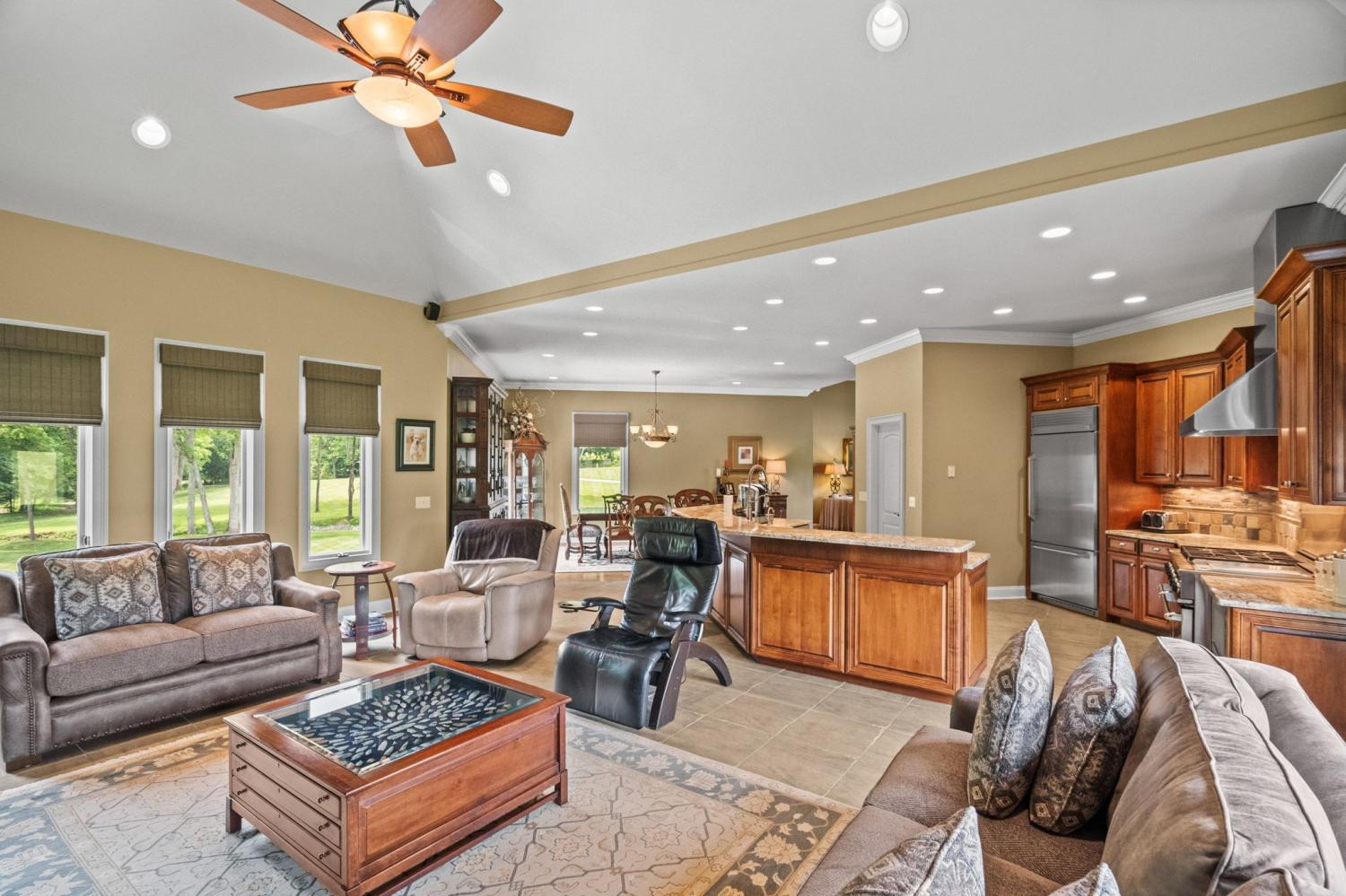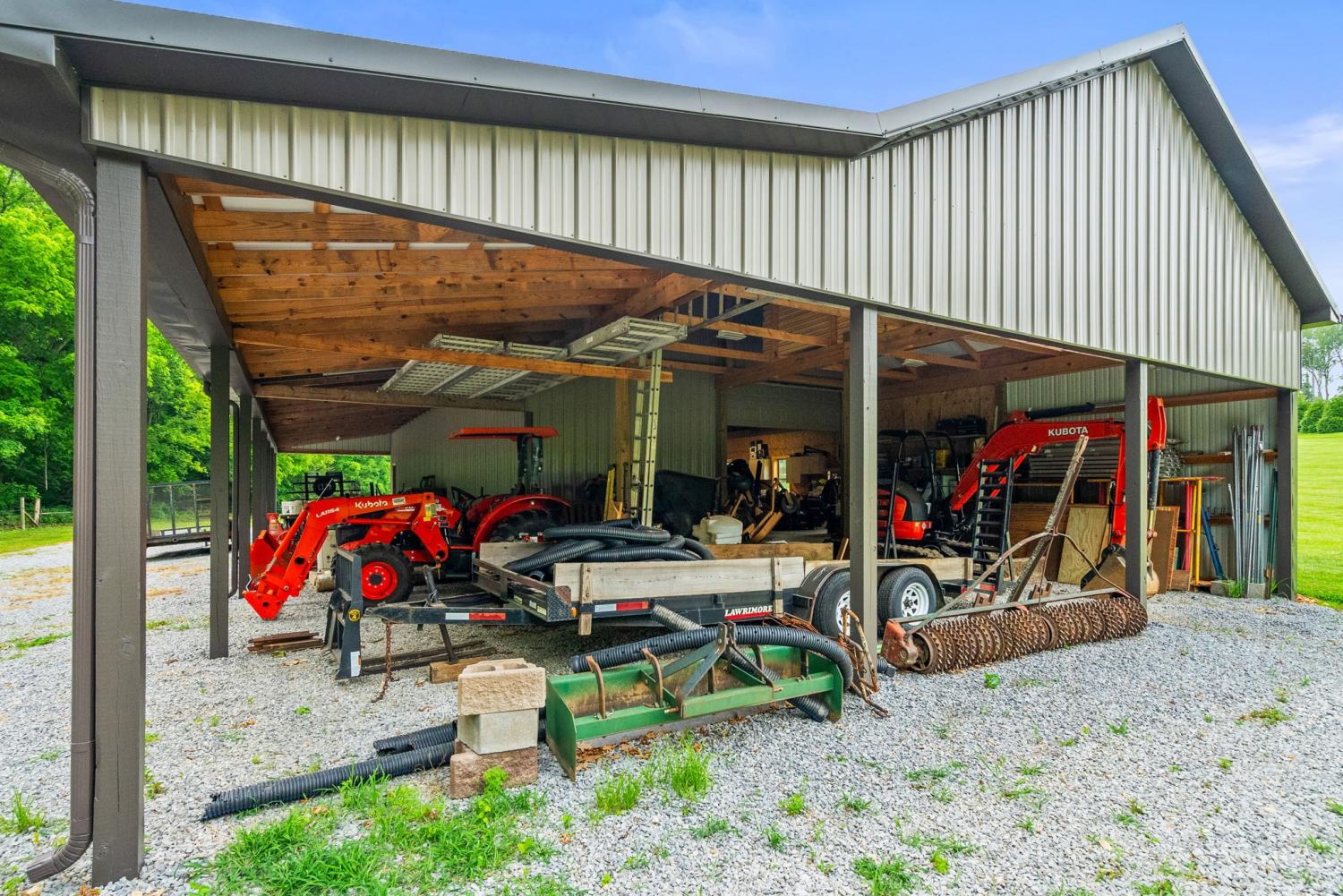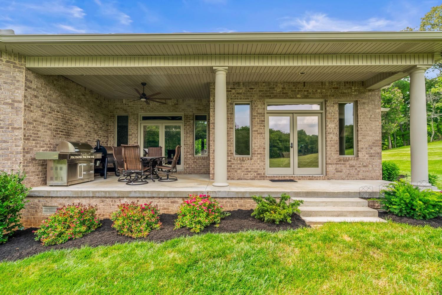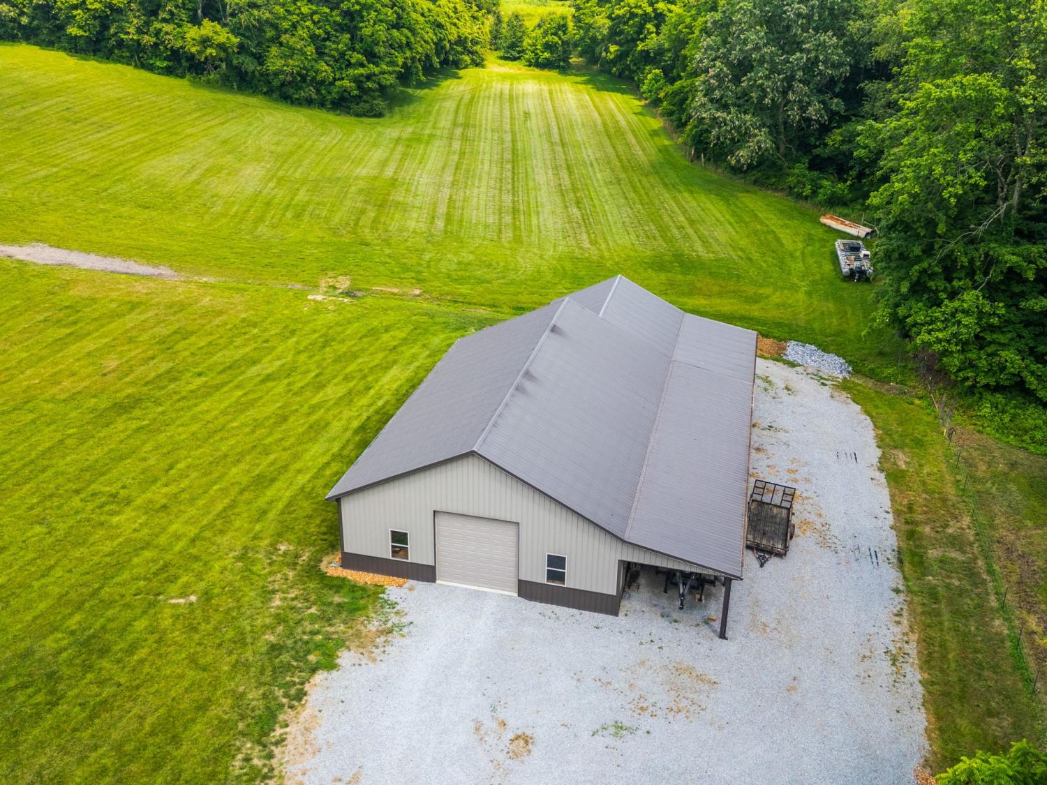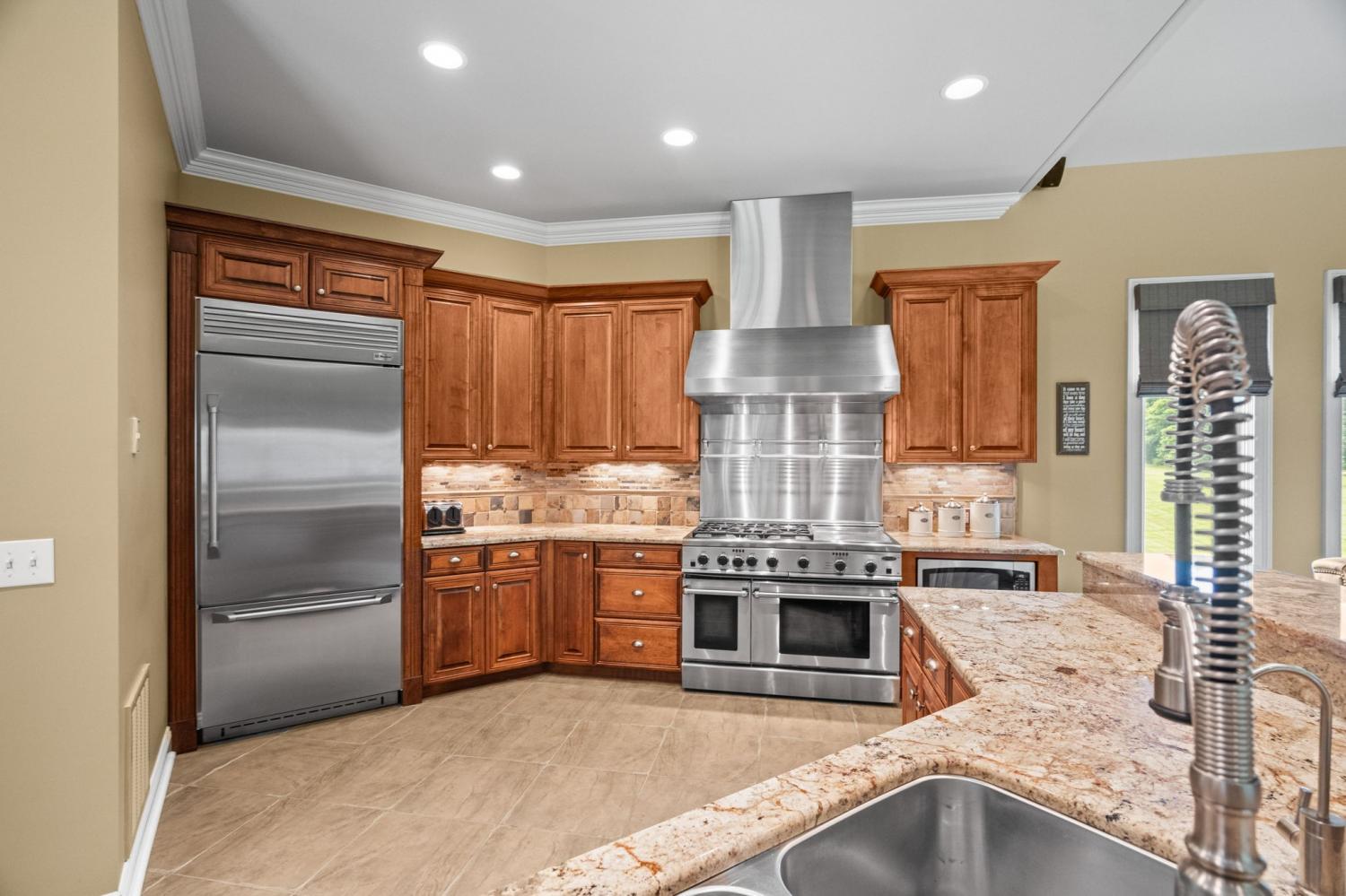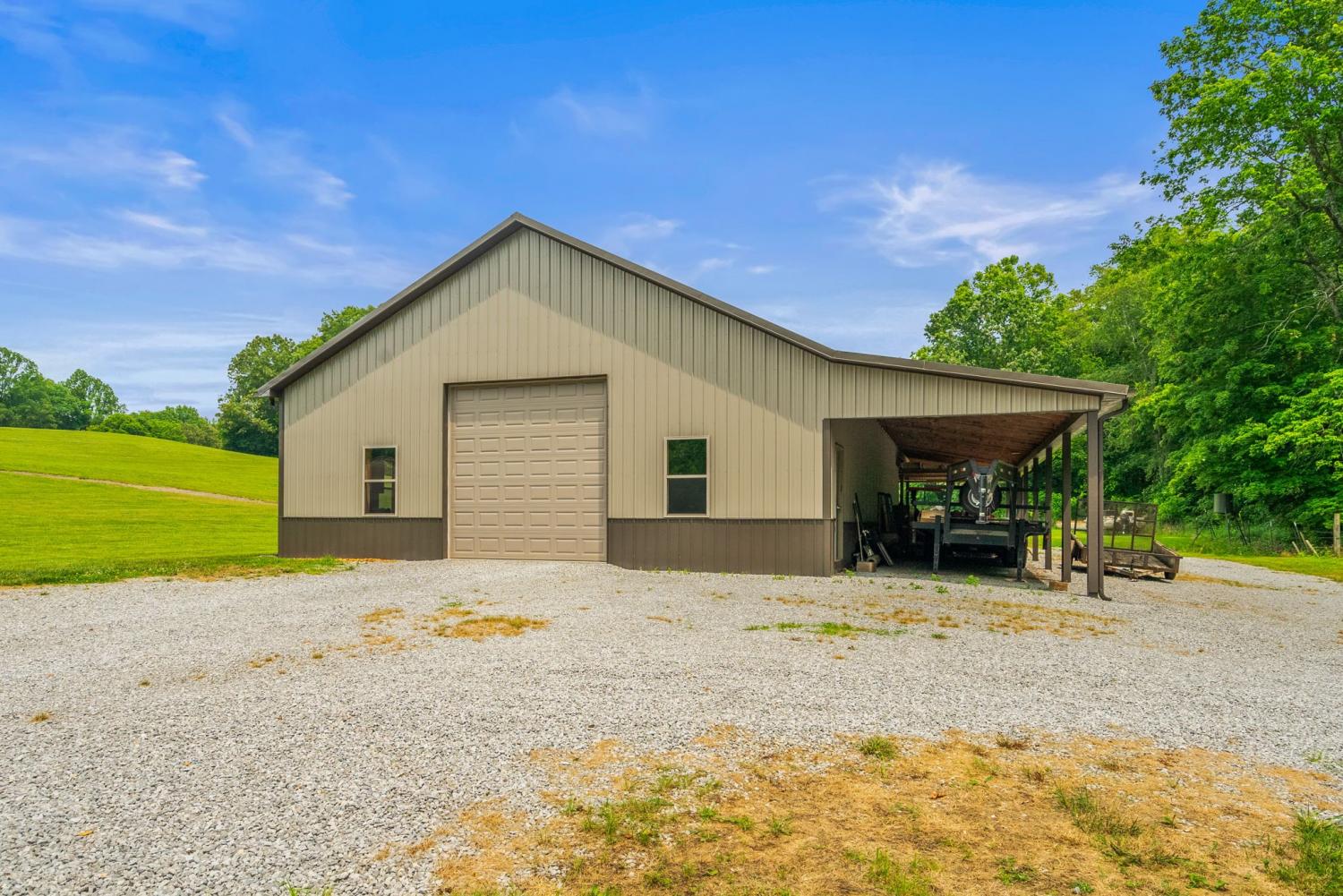 This beautiful custom home with timeless design has 12 acres of manicured privacy. The stunning all-brick estate with wrap around porch, huge columns and a set of solid mahogany front doors lead into an open concept that is warm and inviting. Home features a 9x18 foyer with barrel ceiling, chef's kitchen w/ss appliances, DCS gas range and double ovens, the solid maple cabinetry, granite counter tops w/stone back splash, Bosch dishwasher, walk-in pantry w/extra shelving for storage, great rm with stone fireplace, surround sound and custom built-in cabinets and lighted shelving, crown molding throughout tells you this house was all custom built. Heirloom qualities in this home are on full display, ceilings that are 10, 12 and 15 ft, 6 ft casement windows for natural light, custom black-out shades when needed, handmade white oak flooring, porcelain tile and natural stone tile, french doors leading out to patio from primary and living rms, landscaping 2 yrs old with irrigation. Basement with 10 ft ceilings, a flex room thats 17x27 (3rd bedroom) 2 separate garage doors with workshop between. All attached shelving and cabinets will remain. 56x90 bldg with 40x60 enclosed. This property could easily be converted into a mini farm and the building into a stable. LOCATION, LOCATION, LOCATION. This property is minutes off I-24W, 30 min. from Nashville and 20 min. from Clarksville.