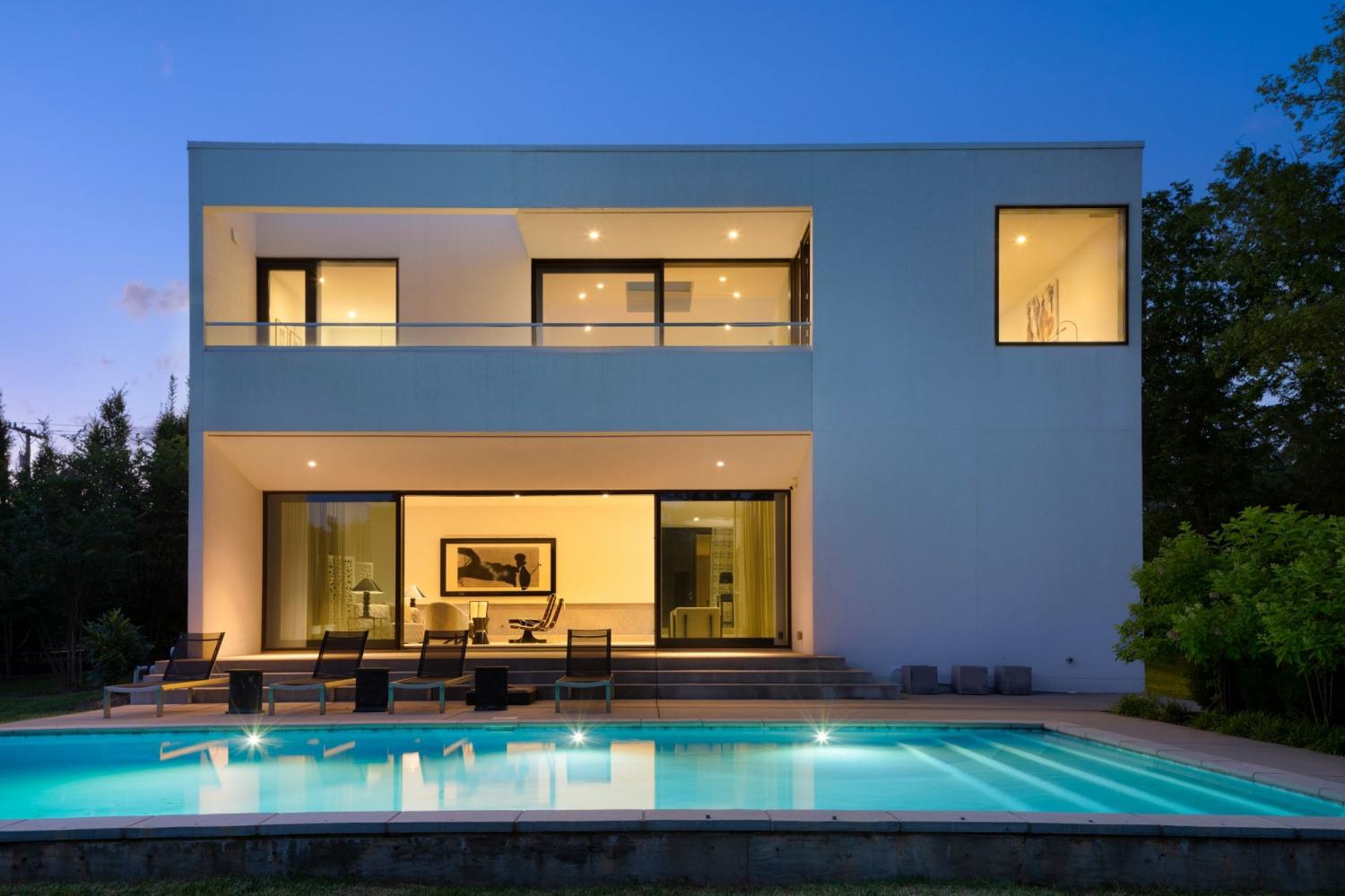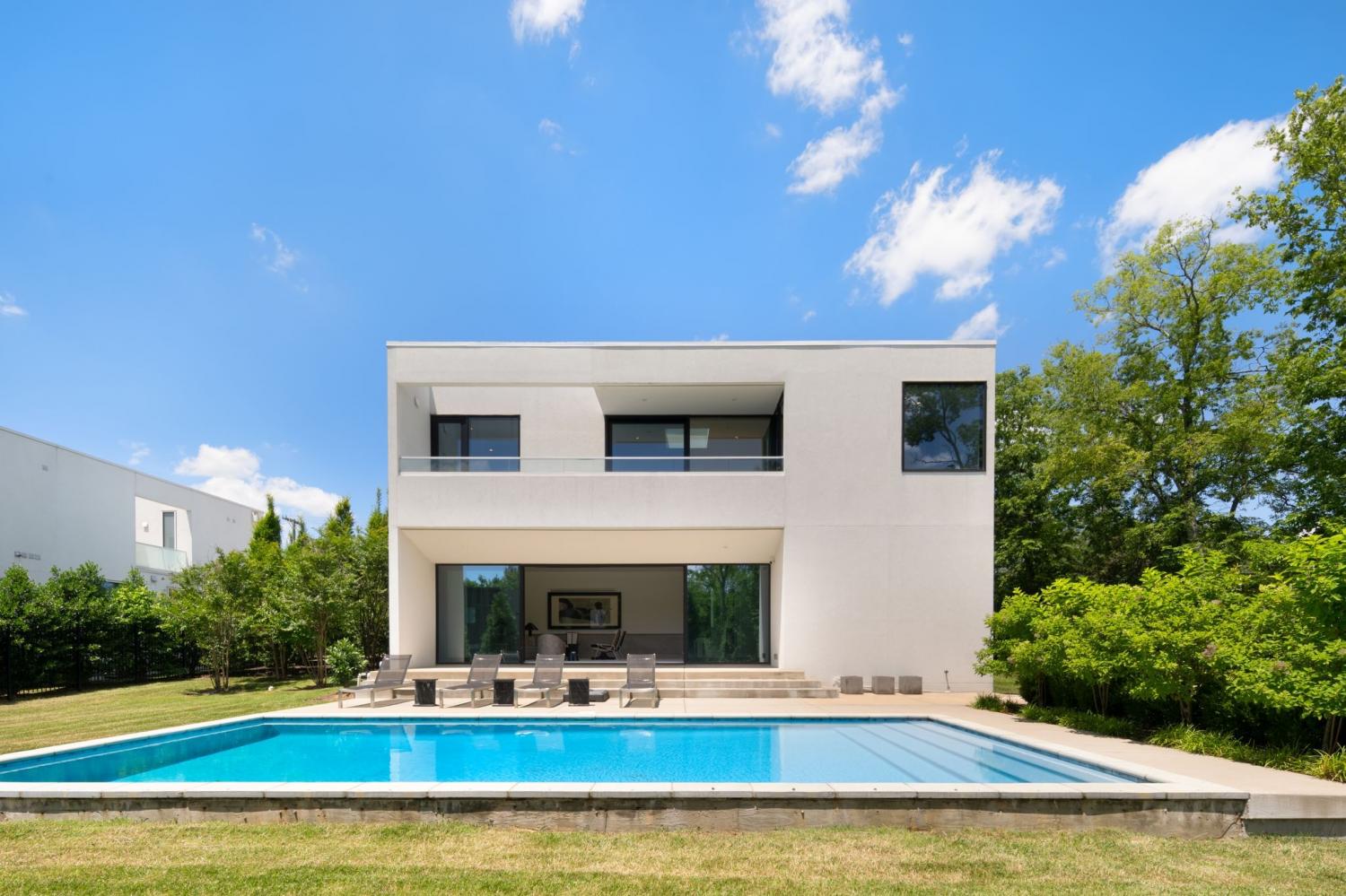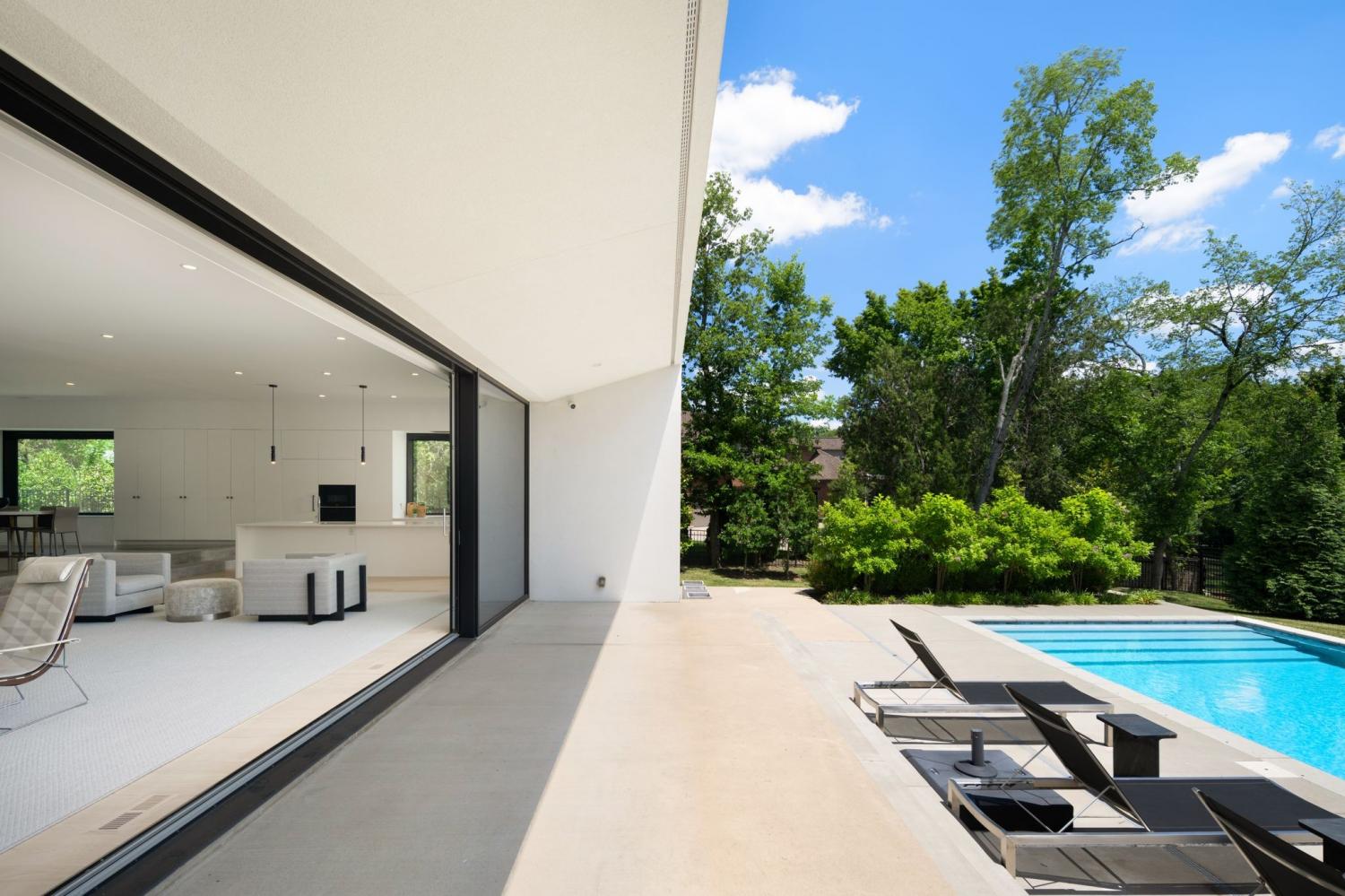 Designed by internationally recognized architect Alexandros Darsinos, this striking residence is a seamless fusion of modern design and natural beauty. Soaring glass walls and expansive picture windows invite sunlight to dance across the interiors, creating a dynamic atmosphere that shifts with the day. Inside, the open-concept floor plan is thoughtfully layered with light, airy tones and warm natural wood—elements that soften and balance the minimalist concrete exterior. The result is a home that feels both refined and welcoming. Upstairs, a dramatic skylight illuminates a serene lounge and three tranquil bedrooms, each designed as a private retreat. Recent upgrades by the homeowner include custom drapery, California Closets in all three bedrooms and the garage, and a reimagined kitchen with upgraded cabinets, pull-out drawers, and built-in organizers—enhancing both form and function. Step outside and discover a private oasis. The pool, framed by lush greenery and mature trees, offers the perfect blend of seclusion and relaxation. A partially covered patio extends the living space outdoors, ideal for hosting gatherings or enjoying quiet moments surrounded by nature. This residence is more than a home—it’s a living work of art, meticulously designed to inspire and crafted to delight.
