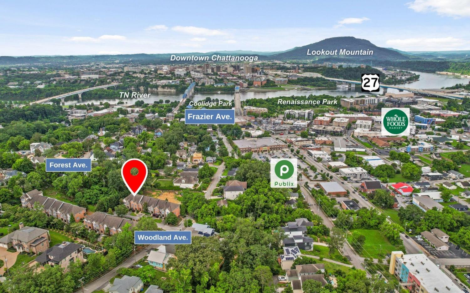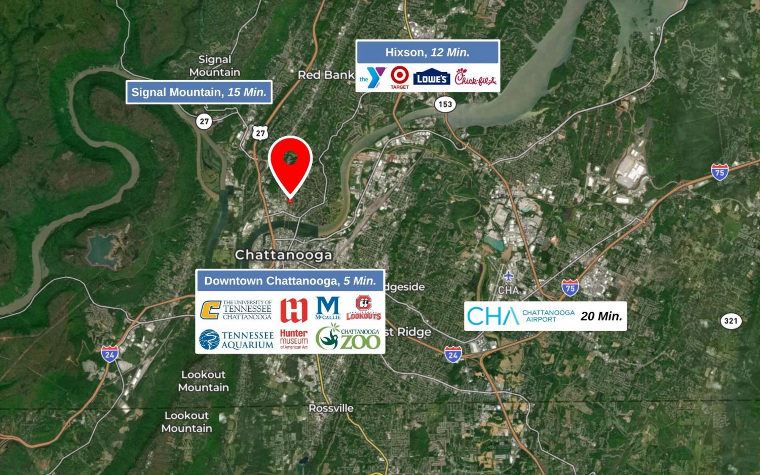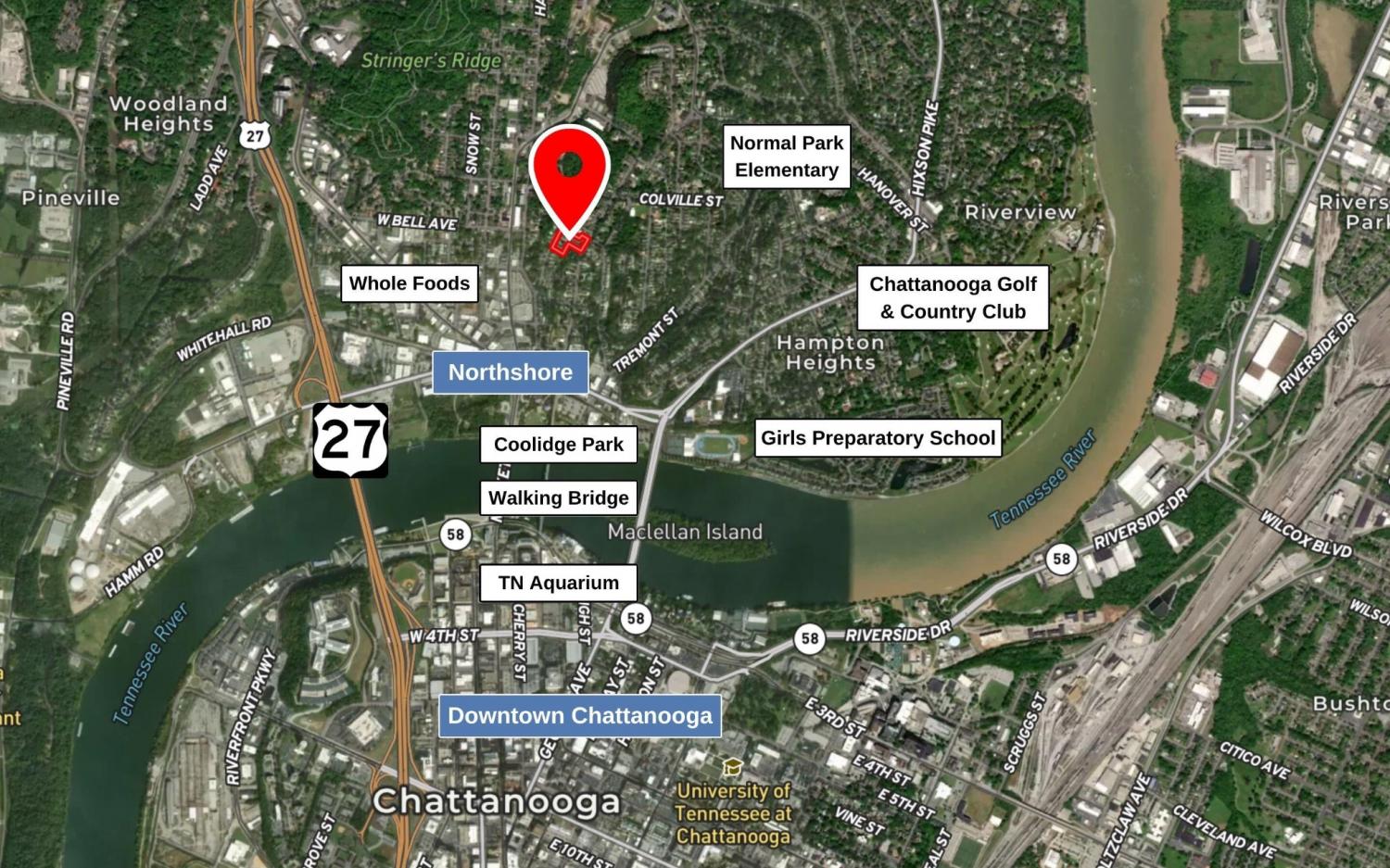 From Downtown Chattanooga: From N Market Street continue across TN River via Market Street Bridge. Turn right onto E Kent St, left onto Woodland Avenue, right onto Shady Ridge Lane. Home will be on the right.