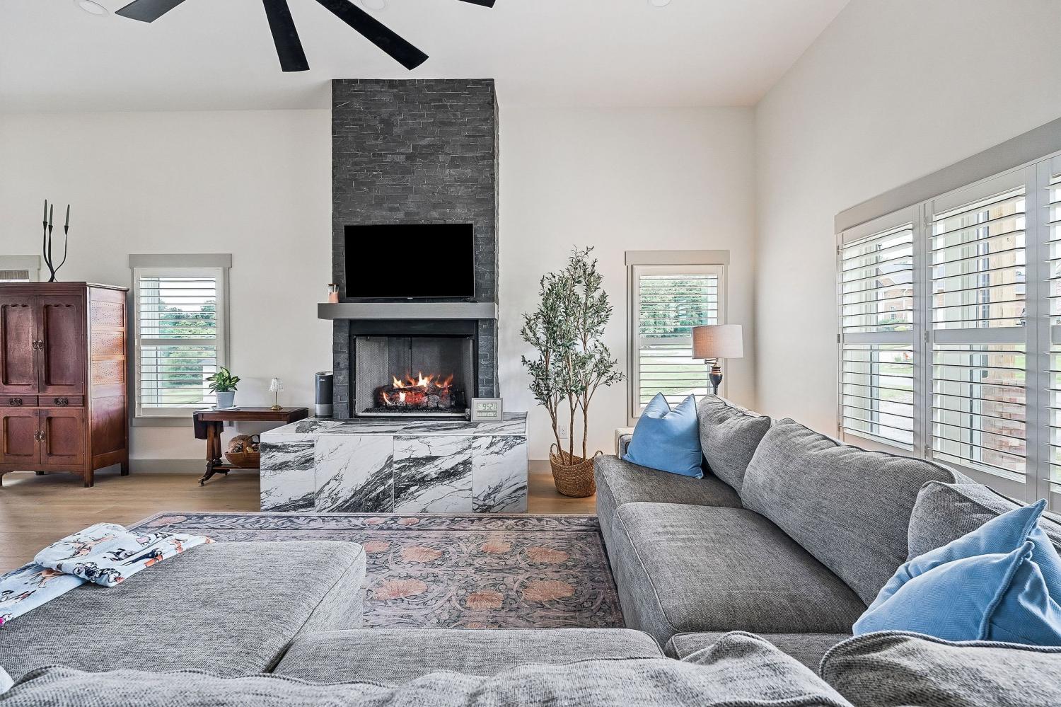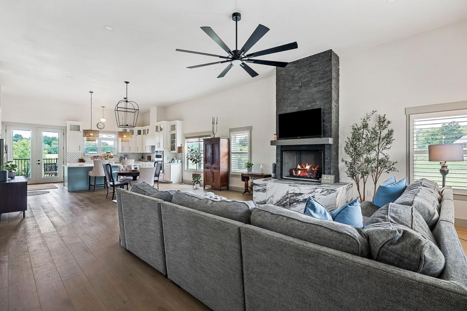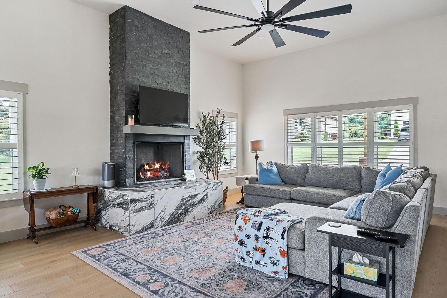 Customed designed and upgraded through out this spacious home was just completed and minimumly lived in! A rare find with over 4,000 finished square feet on the main level. Open floor plan with 12 foot ceilings throughout the main level. Plantation shutters adorn the front windows. A grand modern gas fireplace is floor to ceiling. All Stainless appliances, center island , tiled back splash, gas stove top. Walk in pantry. Main level primary suite is tremendous in space with loads of natural lighting. Covered back deck connecting primary suite and kitchen. A bath with tiled glass incased shower. Plumbed for the bath of your choice tall double vanities , with oversized walk in closet! Second floor offers 2 additional bedrooms and additional unfinished attic space. The basement boast 2900 unfinished space including a mechanical room. 2 car garage. And Additional RV or Boat Storage bay. The walk out basement door is next to the finished private quarters with over 1,100 additional finished square feet 2 rooms , a full bath , and living area plumbed for a kitchenette! Making it the perfect multigenerational living home!