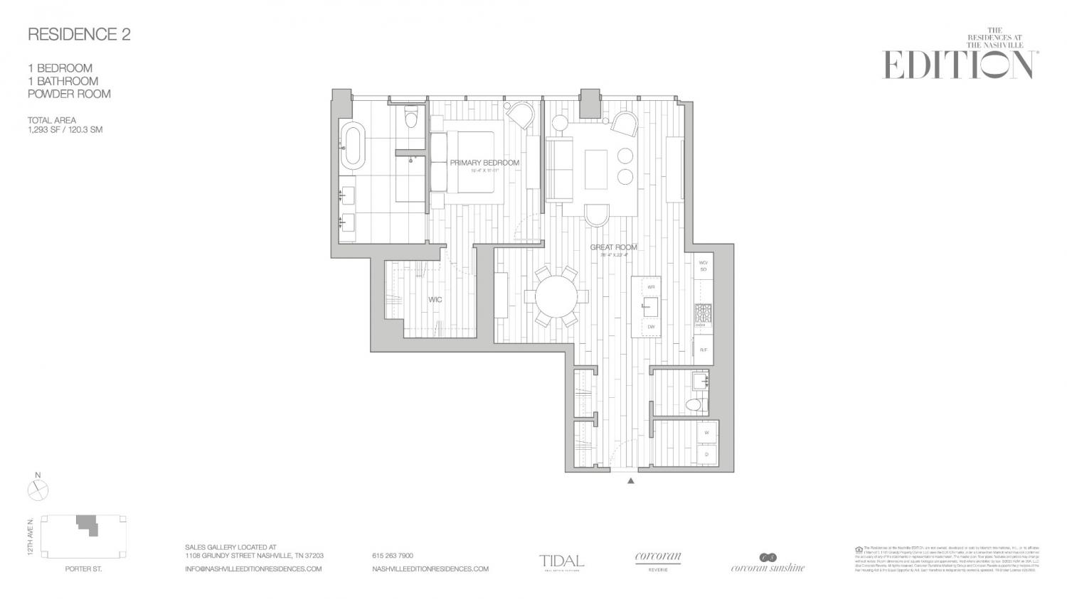 Authentic EDITION style has arrived in Nashville. Legendary service meets sophisticated luxury and seamless urban connectivity in an offering unlike any other in Music City. Perched atop The Nashville EDITION, The Residences at The Nashville EDITION comprise a curated collection of unique homes and restorative amenities. Residence 1602 is a one-bedroom, one-and-a-half-bathroom home with 1,293 SF of interior space and a private terrace framing sweeping north- and east-facing views of Nashville, featuring soaring 10'+ ceilings, wide-plank white oak floors, and floor-to-ceiling windows. An entry gallery leads to an expansive living and dining area. The chef’s kitchen, with views over Downtown & Nashville Yards, showcasing custom white oak cabinetry, Oroluce slab countertops and backsplash, a Miele appliance suite, and a wine refrigerator. The primary suite features an ensuite bathroom with a freestanding soaking tub, Porcelanosa tile, a travertine vanity, and brushed bronze fixtures. The secondary bedroom includes an en-suite bathroom with refined finishes. Residence owners enjoy a suite of resident-only private amenities, including a fitness center, sports simulator, terrace with grill and dining stations, lounges, a game/screening room, a private dining room with catering kitchen, and valet parking. Owners benefit from premium services and priority access to EDITION Hotel’s amenities including the open-air 50’ heated saltwater pool with cabanas, bar and restaurant service, and sweeping views of Music City. Inside, the EDITION’s signature stair, double-height restaurant and bar, spa, lounges, and private event spaces are perfect for intimate or grand gatherings. Residents have access to EDITION Hotel services including 24-hour concierge & security, personal training, and event planning – all designed to deliver EDITION’s signature blend of boutique intimacy and world-class service. Illustrations are artist’s depictions only and may differ from completed work.