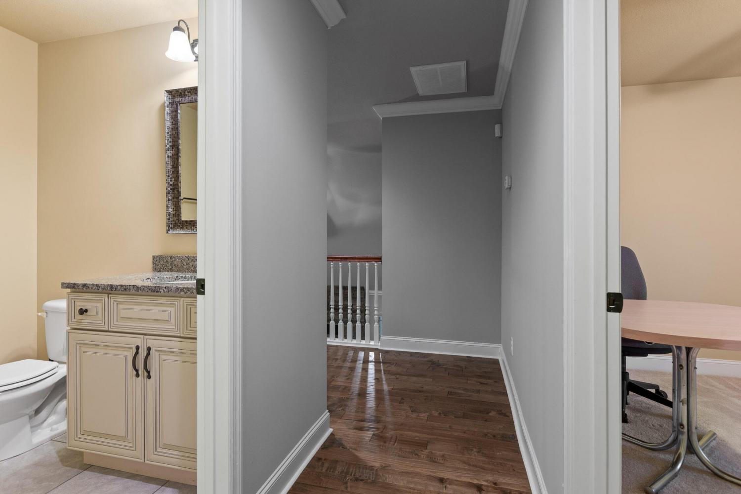 Discover refined living in this beautifully crafted custom 4-bedroom, 2.5-bath home located in one of the most desirable neighborhoods in the Ooltewah area, served by top-rated schools. From the moment you arrive, the upgraded solid wood front door and brick-and-stone front elevation set the tone for the quality and charm found throughout the property. Inside, hand-scraped hardwood floors flow throughout the main level and upstairs hallway, adding warmth and elegance. The formal dining room features classic wainscoting, creating a perfect setting for family meals and entertaining. The heart of the home is the spacious kitchen, where custom cabinetry, granite countertops, and stainless steel appliances come together to form a chef's dream. The kitchen opens to a dramatic two-story living room with a striking stone fireplace that's pre-wired for your entertainment system—ideal for cozy nights or lively gatherings. Just off the living area, a covered patio offers peaceful views of the private wooded backyard, perfect for morning coffee or evening relaxation. The main-level primary suite is a true retreat, boasting a large walk-in closet, a luxurious floor-to-ceiling tiled shower, and a separate jetted tub for ultimate relaxation. Upstairs, you'll find three additional bedrooms filled with natural light. One of these bedrooms includes a unique bonus space, perfect as a sitting area, reading nook, or playroom. Throughout the home, designer lighting and thoughtful upgrades create a sense of comfort and sophistication. For year-round climate control and efficiency, the home is equipped with two separate AC units, one of which is brand new. A community pool membership is also available, enhancing the lifestyle offered by this exceptional property. With its perfect blend of style, space, and location, this is a home you won't want to miss.