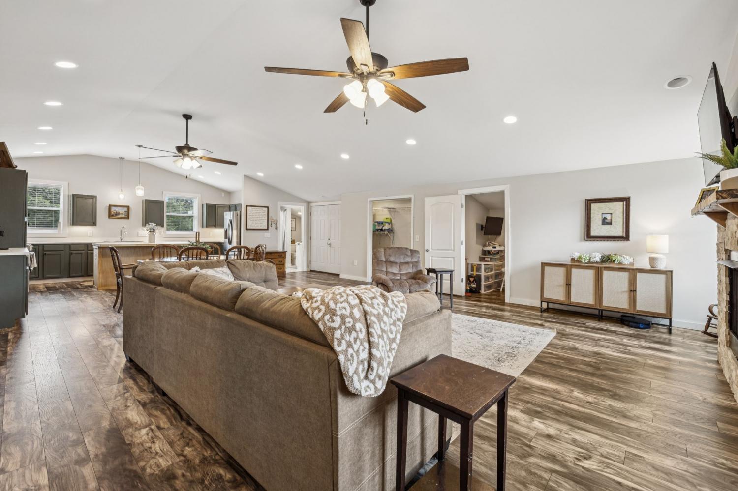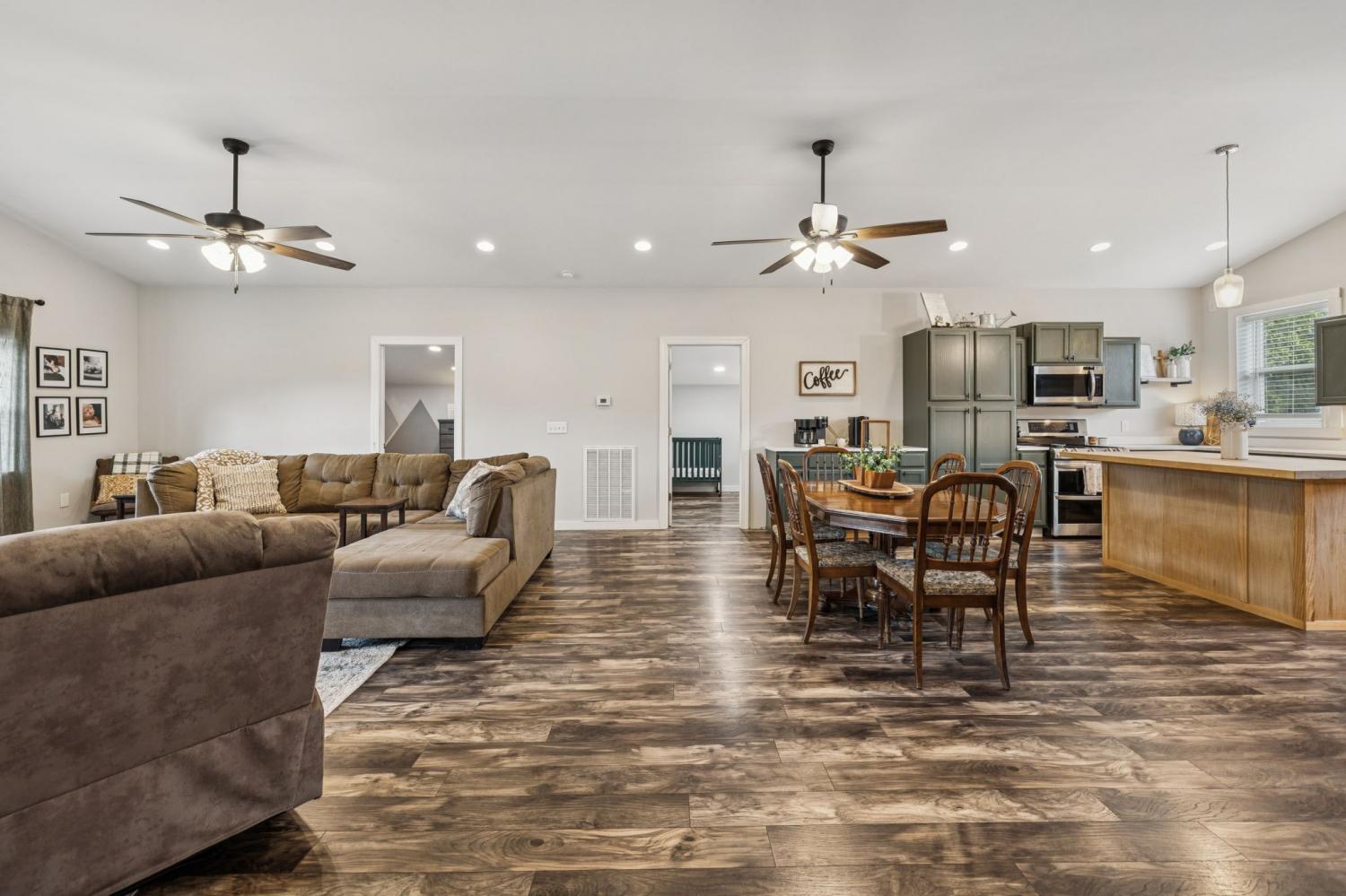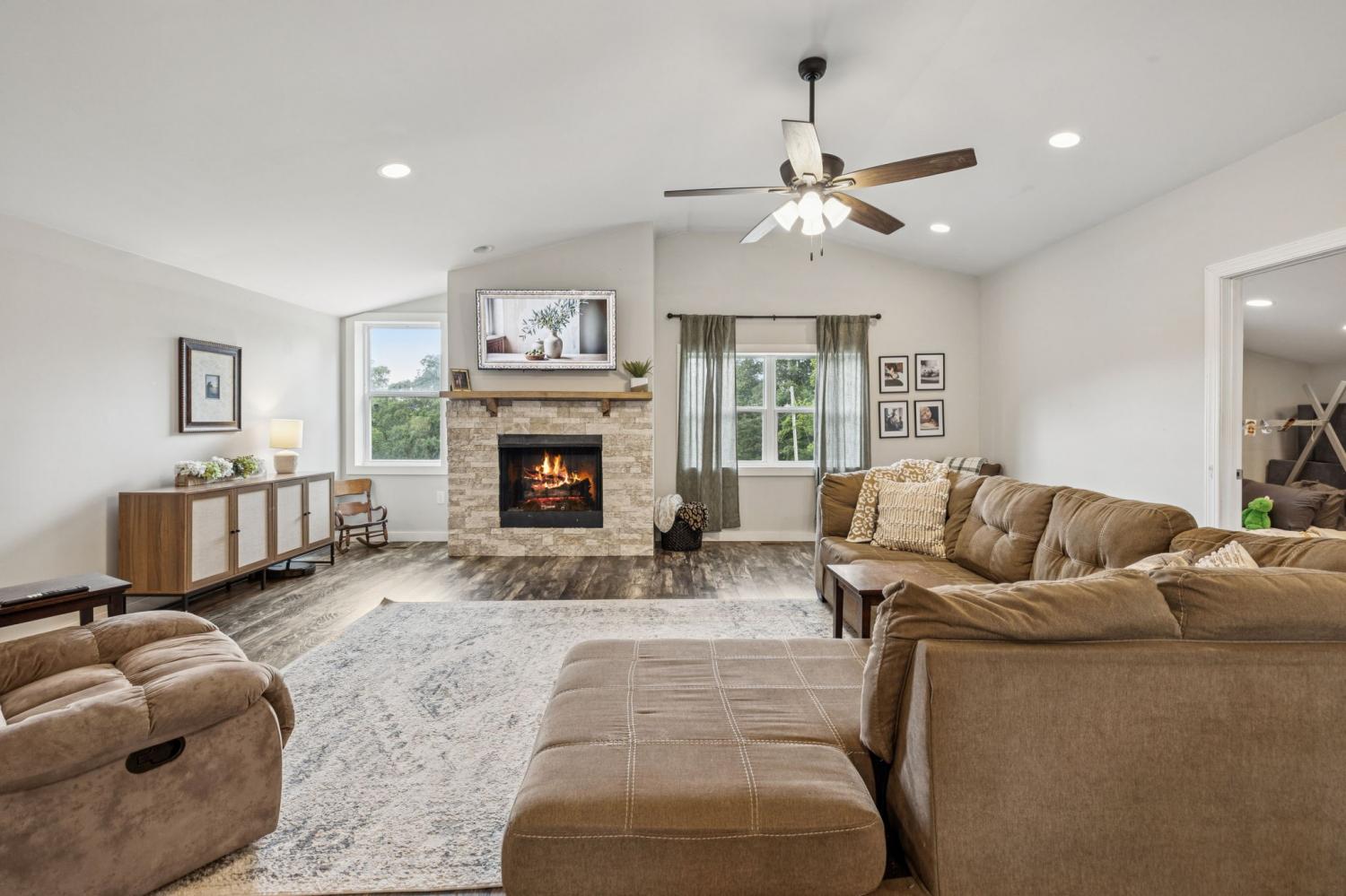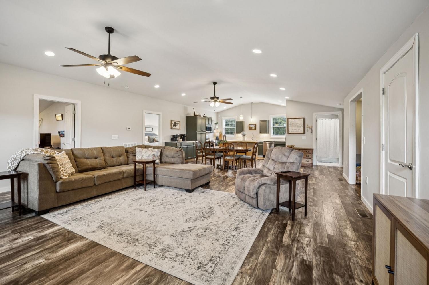 BACK ON THE MARKET due to the Buyers home did not sell. Private home on 17.59 acres - Perfect getaway for the family! Enjoy the private drive as you pass the Cumberland River, go past the old barn (old home torn down) and as you turn the corner - you see this 1600sf home with a 3 car garage (also 1600sf) ready for your fishing boat and RVs. Built in 2020, this open concept is beautifully laid out with a gas fireplace. The room marked as an office space is currently being used as a 3rd bedroom. One bathroom and laundry room are in the garage. Enjoy grilling out on the covered porch then move on to the screened in area to enjoy the evening (added on in 2023). The siding and the roof are tin material. This truly is a beautiful setting and less than an hour from Nashville airport. You have to see this one! Perfect place for a B&B.