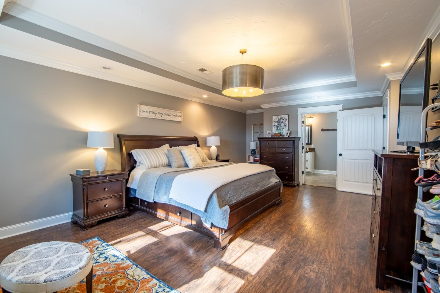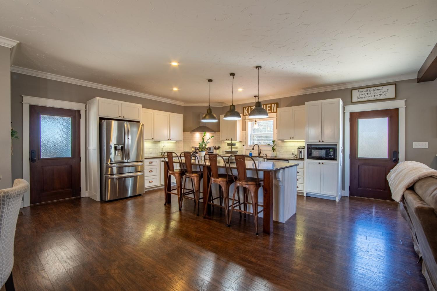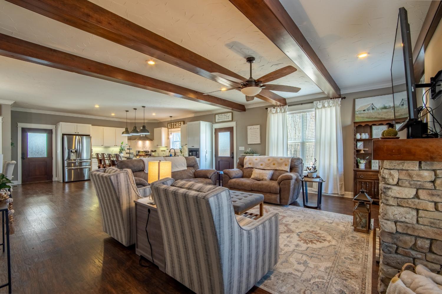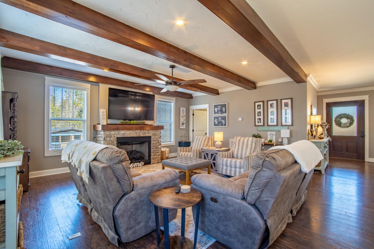 Craftsman-style home, just minutes from beautiful Pickwick Lake! Privately nestled down a long drive on 4.97 acres+/-, this home combines luxurious living w/the charm of the countryside. Inside, the open-concept design is an entertainer’s dream. The kitchen is a showstopper, featuring gas cooking, sleek stainless-steel appliances, stunning quartz countertops, plus a walk-in pantry! The family room is the heart of the home, complete w/wood beams & a cozy fireplace, perfect for chilly nights. Downstairs, you'll find a dedicated office & half bath, making it easy to work from home. Upstairs, all the bedrooms are spacious, the large laundry room is nearby to make laundry day a breeze, & the guest bath offers double sinks! The primary suite is your personal retreat, with a trayed ceiling, wic, & a luxurious bath w/walk-in tile shower! Relax on your large front porch or rear patio & enjoy serenity & nature! As a bonus there's a barn for your animals or storage! Don't miss out on your new home!