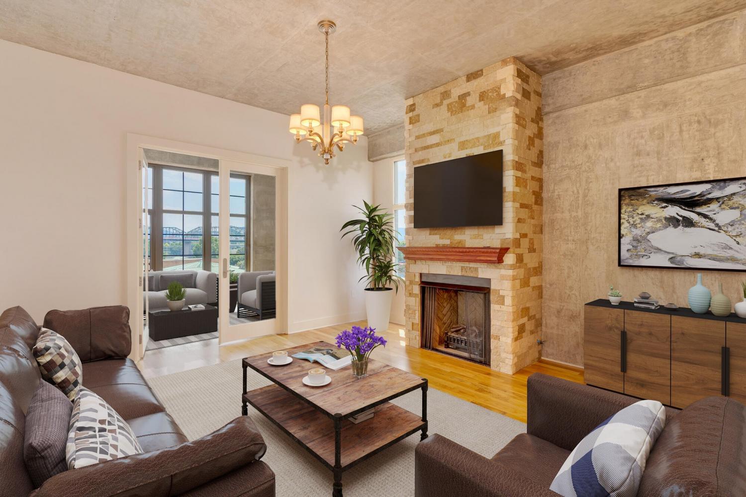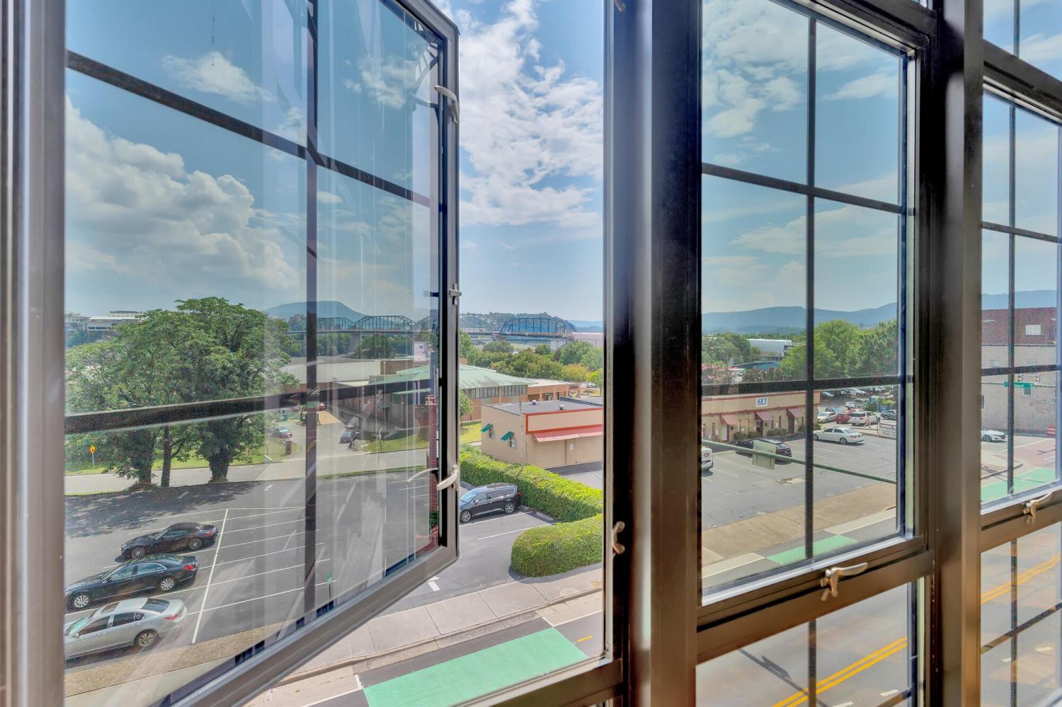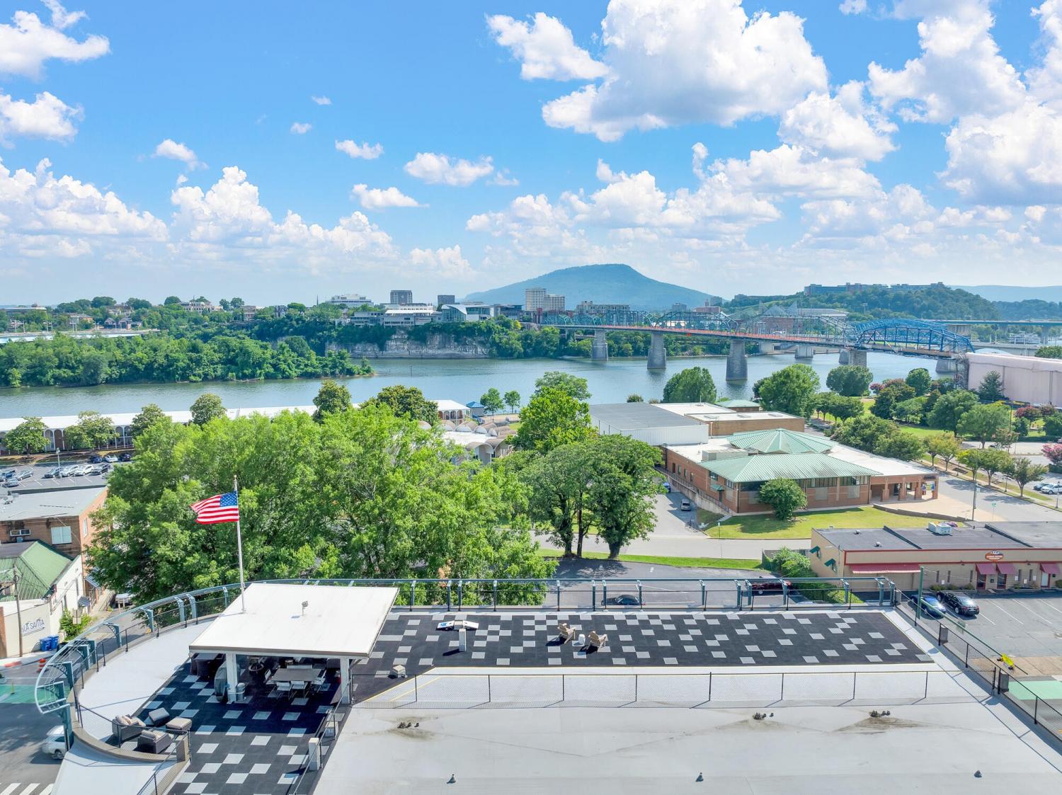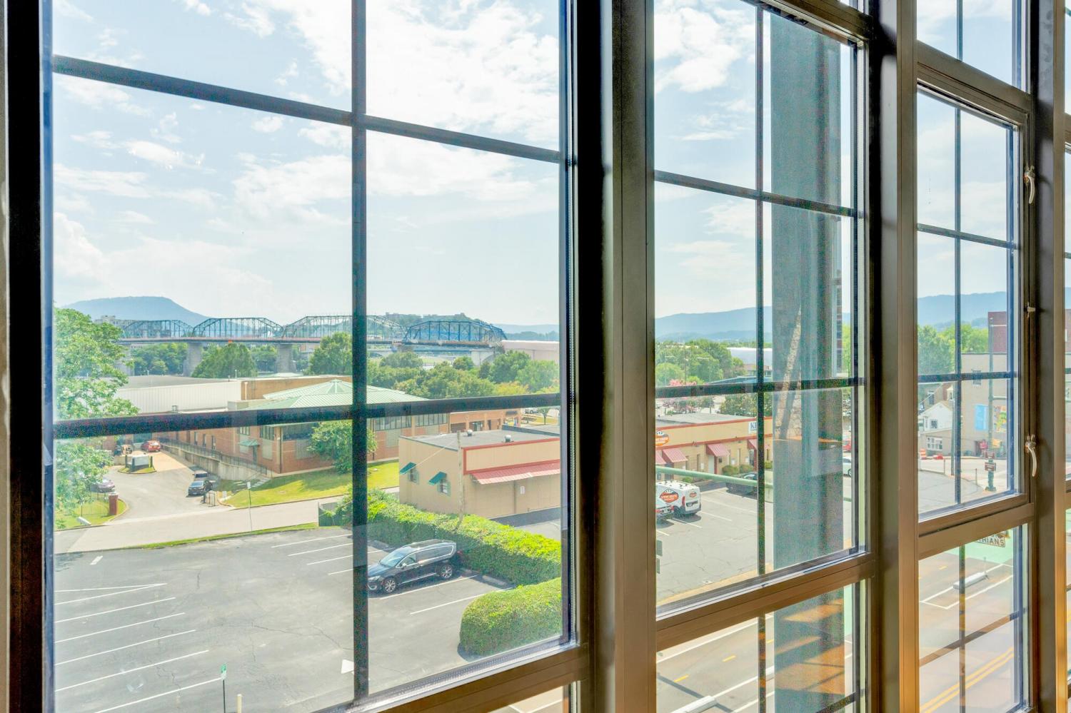 Live in the heart of Chattanooga in this luxury 2-bedroom, 2.5-bath condo on iconic Frazier Avenue. With stunning skyline views stretching from the Hunter Museum and the Tennessee Aquarium to the Walnut Street Pedestrian Bridge and Signal Mountain, this home offers front-row access to everything that makes Chattanooga unforgettable. And who needs to get into a car when you have shops, restaurants, grocery stores, and parks just right outside your door? Inside, you'll find refinished hardwood floors, high concrete ceilings, and a fireplace that can be used as gas or electric. The sunroom overlooks vibrant Frazier Ave and connects directly to both the living room and the spacious primary suite—so you can wake up to scenic city views every morning. The upgraded kitchen includes a recently replaced refrigerator and dishwasher for modern convenience. Head upstairs to the rooftop patio, complete with a covered lounge area, grill, and panoramic views—perfect for entertaining or enjoying fireworks without leaving home. The building has great security with a secure parking garage and a fob needed for any entry. The HOA takes care of common area maintenance, water, gas, sewer, and even trash pick-up twice a week, making day-to-day living effortless. The unit includes two storage spaces—one just steps from your door and another on the ground level—as well as two oversized parking spaces in the secure garage, with additional guest parking available in the lot. And who needs a backyard when Coolidge Park is your front yard? This is truly low-maintenance, luxury living at its best in the heart of Chattanooga.