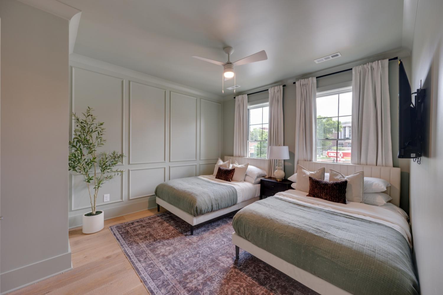 Harmony Strum is a modern three-bedroom, two-bath residence located in the Hyve building, offering stylish design and city views just a short walk to Broadway, the Gulch, and Nashville’s vibrant downtown attractions. With an open-concept layout, designer finishes, and access to full community amenities, this home presents an exceptional long-term rental opportunity in the heart of Music City. The main living area blends comfort and style, with contemporary furnishings, Smart TV, and direct access to a private patio overlooking the pool and skyline. The adjoining kitchen features stainless steel appliances, ample counter space, and bar seating, flowing seamlessly into the dining area to create a functional space for daily living and entertaining. The primary suite offers a king bed, ensuite bath, walk-in closet, and private patio access, along with a dedicated vanity area. A second bedroom includes a king bed and generous storage, while the third bedroom provides two queen beds with a trundle for flexible living arrangements. Two full bathrooms with modern fixtures serve the residence. As part of the Hyve community, residents enjoy exclusive amenities including a resort-style pool, fitness center, rooftop lounge, BBQ grills, fire pits, outdoor ping pong, and stylish shared lounge areas. Parking is available in the covered garage on a first-come basis, with additional street parking nearby. With its private patio, modern design, and prime SoBro location, Harmony Strum offers the perfect balance of comfort and convenience for long-term Nashville living.