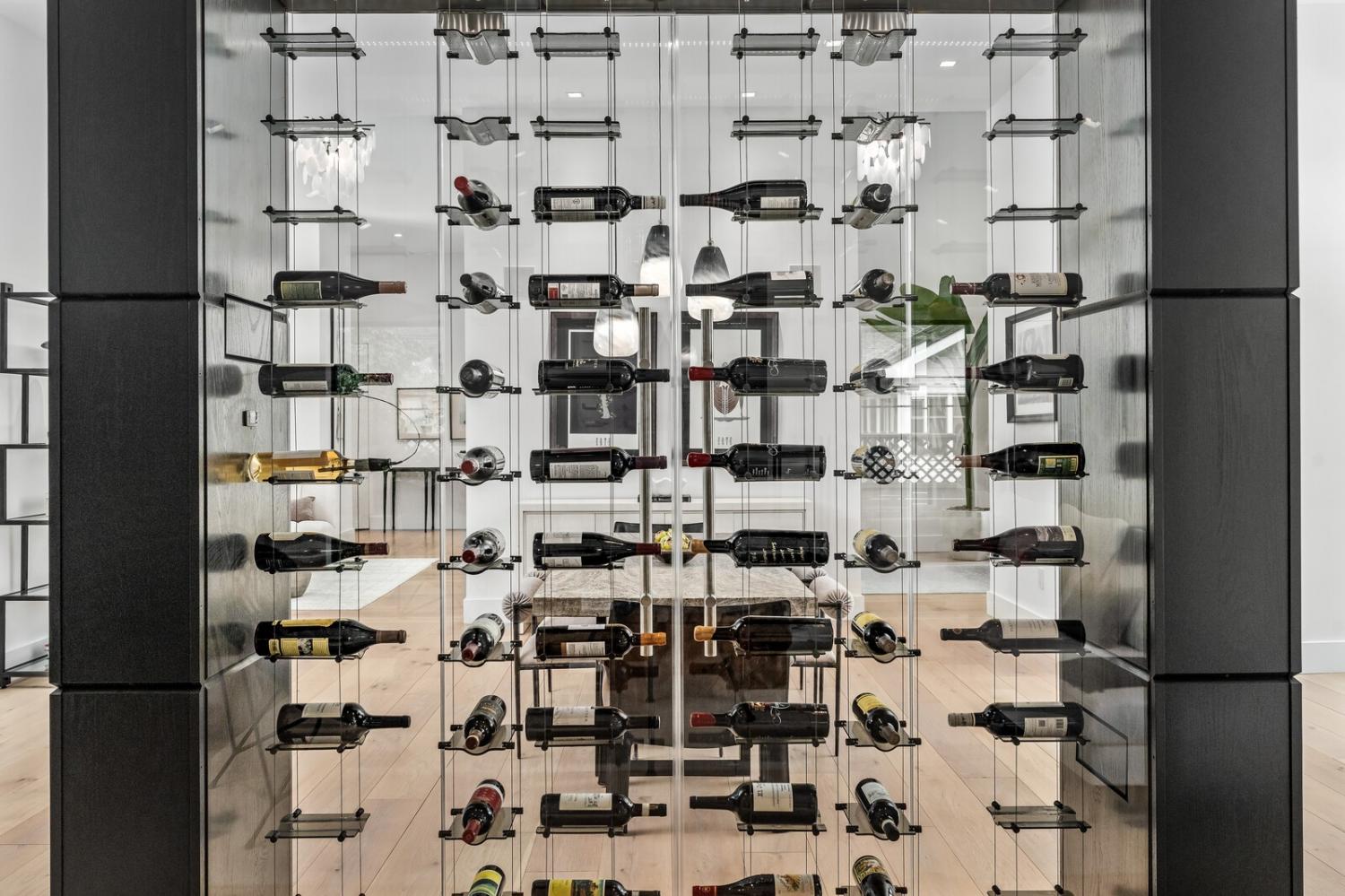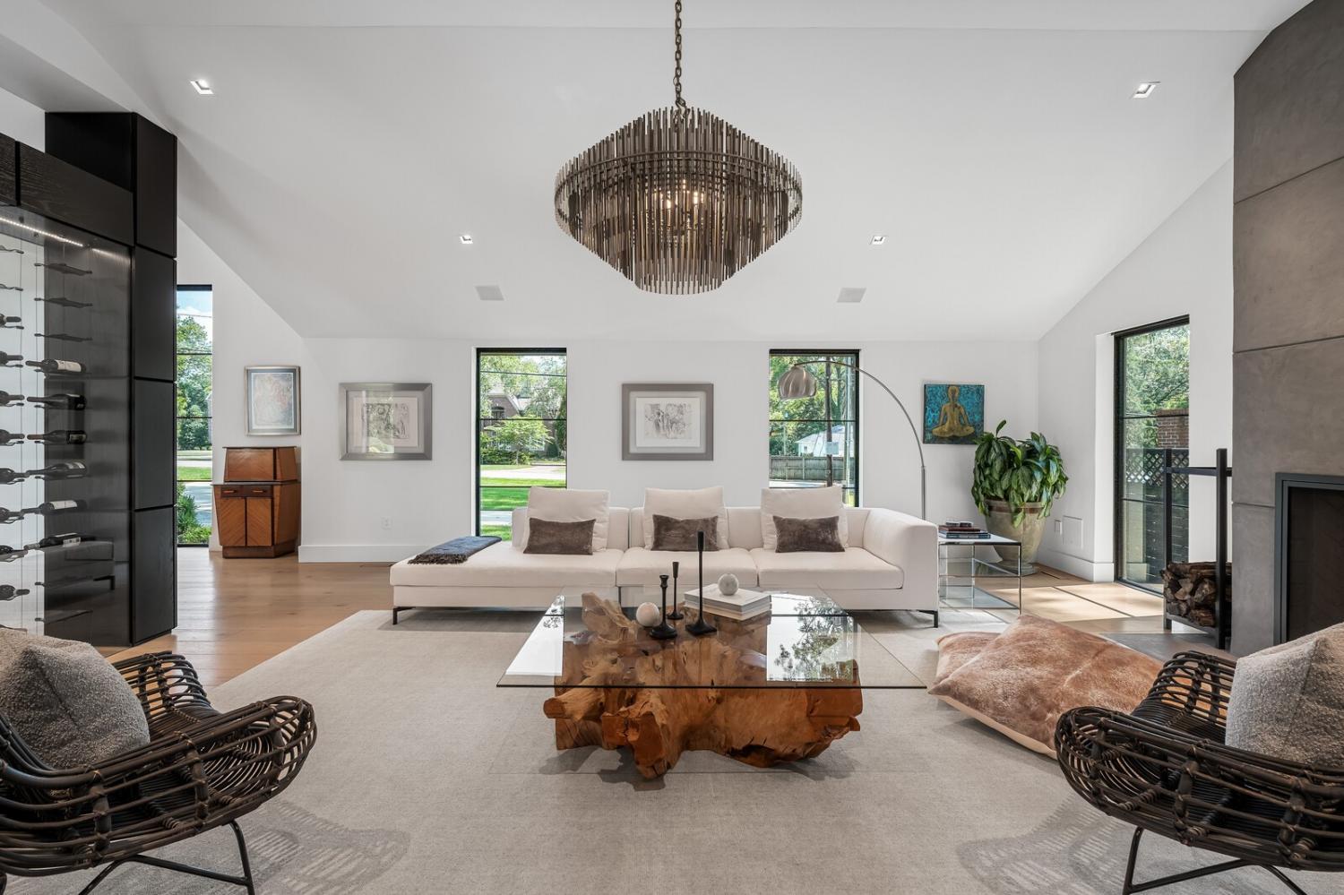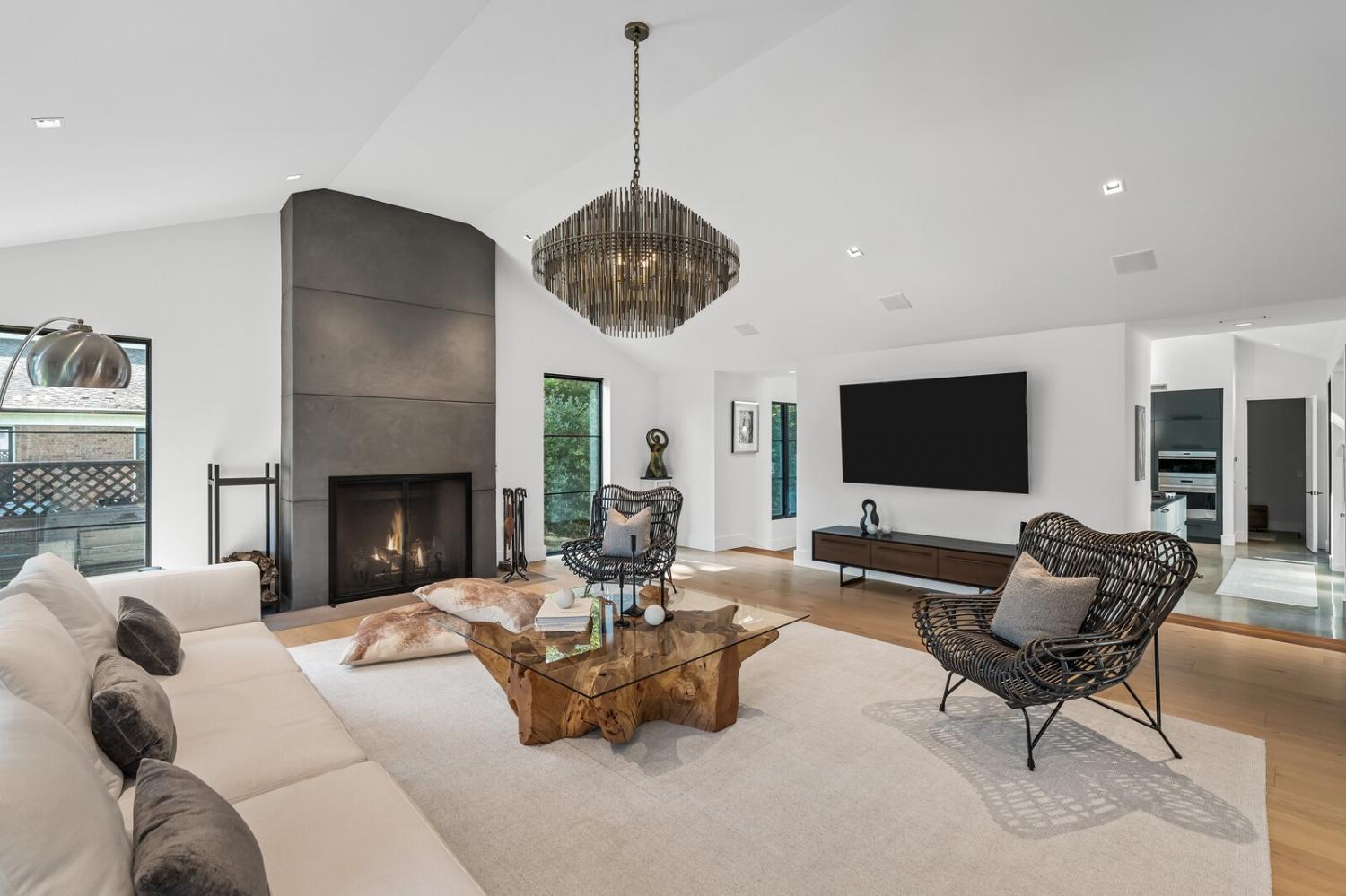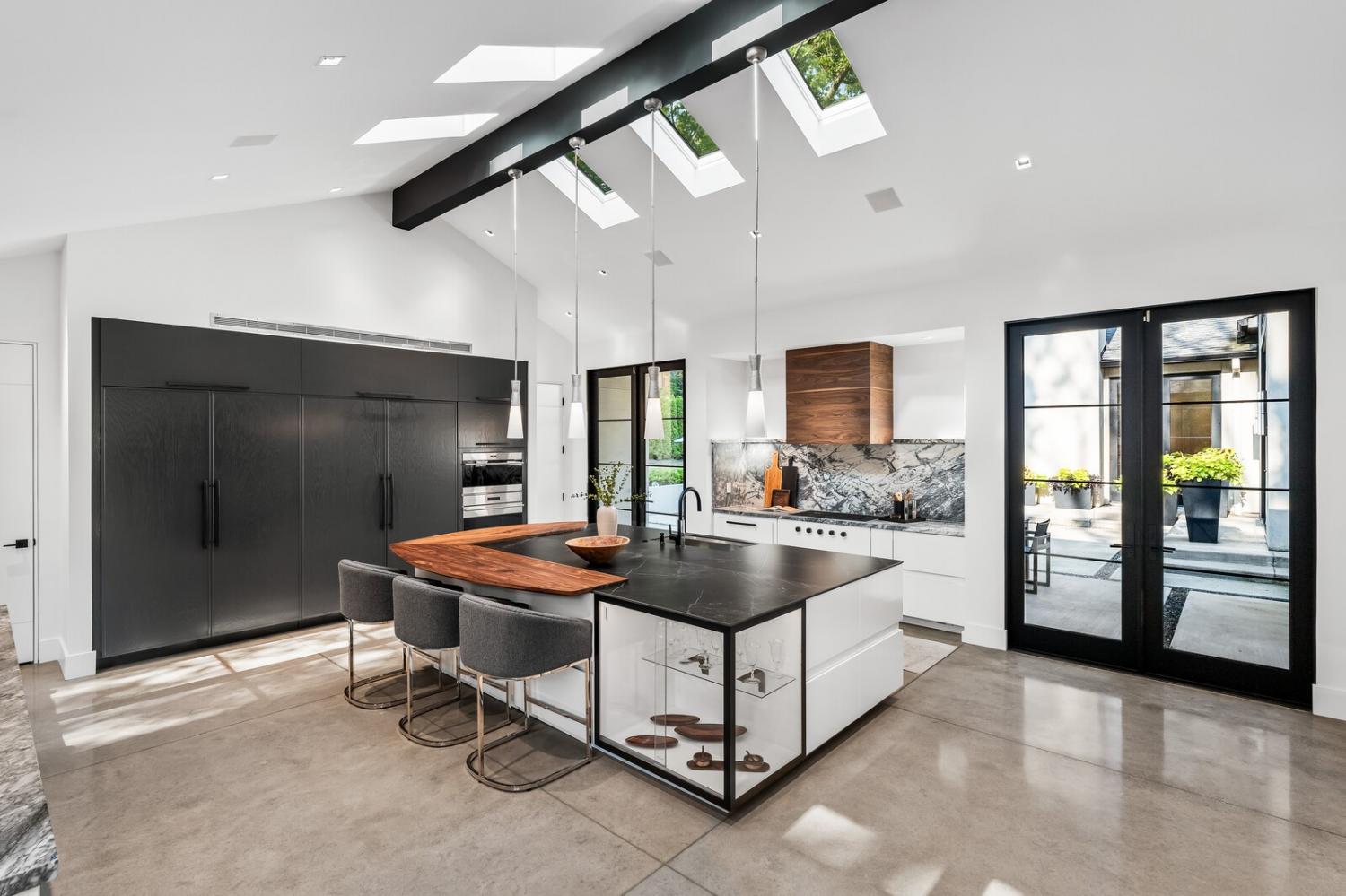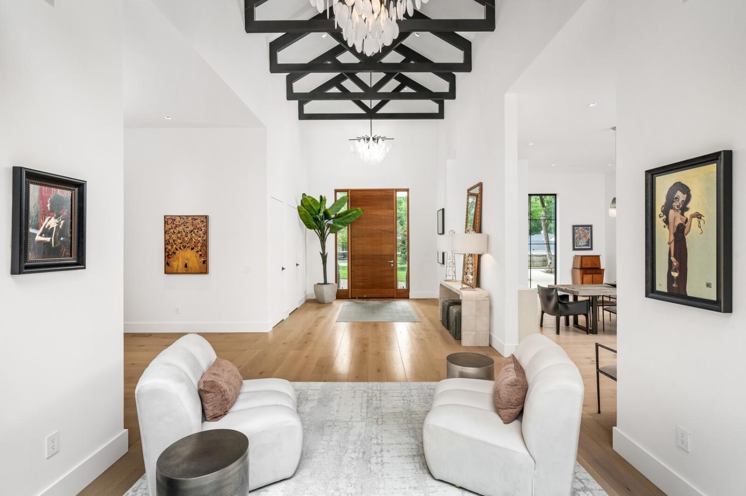 Welcome to a custom-designed contemporary real stucco masterpiece that offers an exquisite blend of luxury and modern elegance. As you enter through the impressive custom-designed walnut 10-foot pivot door, you are greeted by a breathtaking foyer with 18-foot high ceilings adorned with custom-designed decorative trusses. This grand entrance sets the stage for an open and inviting atmosphere. Architectural lighting and black steel-look Marvin windows and doors accentuate the modern aesthetic. The gourmet kitchen is a chef's delight, featuring Wolf appliances and a Fisher Paykel refrigerator/freezer combo. The centerpiece of the kitchen has Italian porcelain countertops on the island, complemented by leathered marble countertops around the periphery, featuring a 3-foot high backsplash with ledges in the style of Joseph Dirand. The kitchen's separate bar area, complete with a bar sink, wine refrigerator, and ice maker, is adorned with Scalamandre accent wallpaper. A custom walnut vent hood and integrated countertop on the island complete this culinary space. In the family room, enjoy the warmth and ambiance of a wood-burning fireplace with a convenient gas starter, illuminated by the elegant RH Emile chandelier. This space is perfect for movie nights, featuring built-in surround sound for an immersive experience by the fire. The temperature-controlled wine wall with seeded glass shelves adds a touch of sophistication, perfect for the discerning connoisseur. Retreat to the primary suite with its vaulted ceilings, decorative beams, and a gas fireplace. Enjoy the tranquility of a private built-in coffee bar, and luxuriate in the primary bath's huge walk-in shower with double rain heads and a two-person soaking tub overlooking a private zen garden. All guest bedrooms are thoughtfully designed, each featuring en suite bathrooms and large walk-in closets. Outside, enjoy seamless indoor-outdoor living with 13-foot accordion doors opening onto the courtyard.