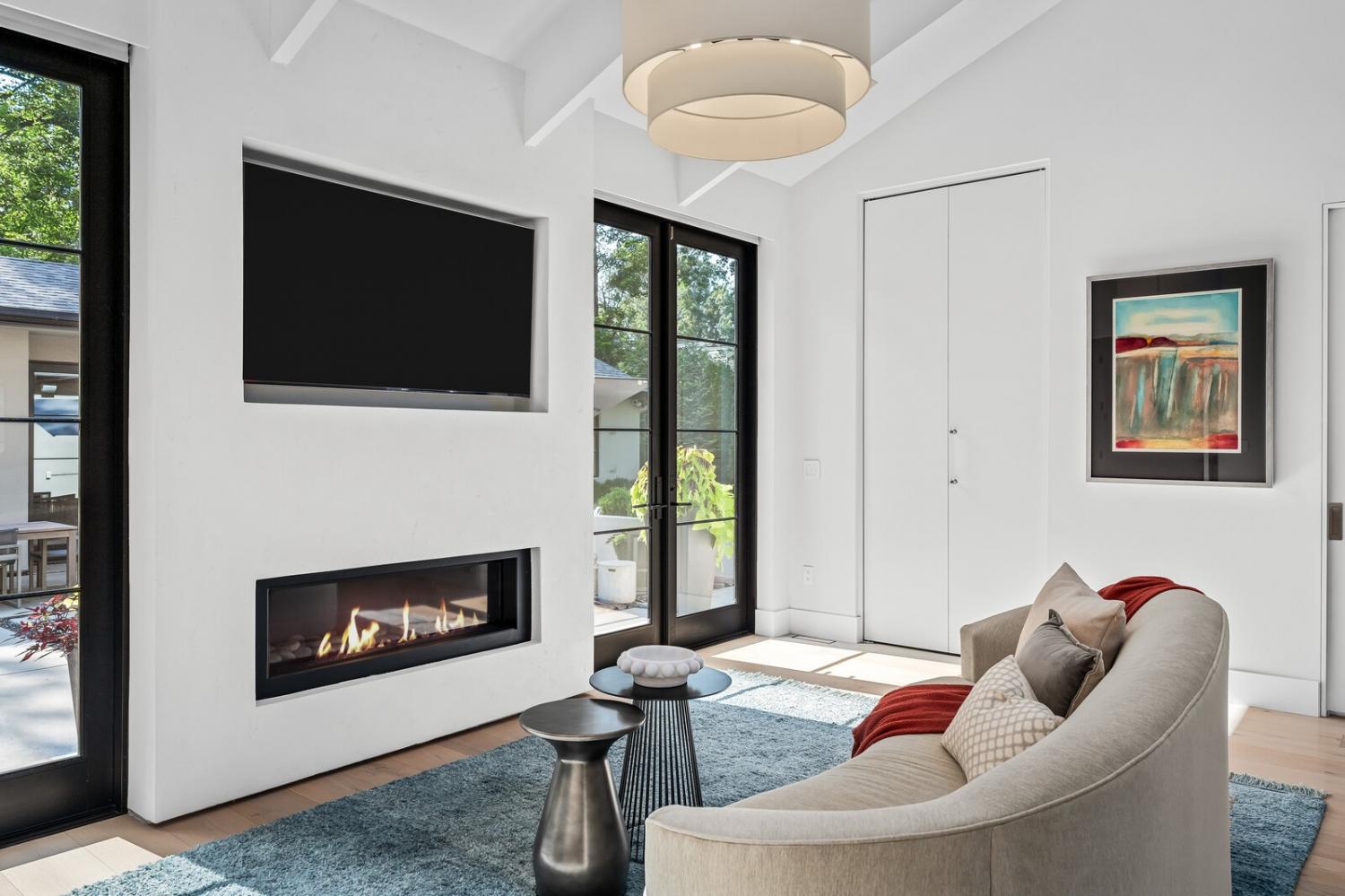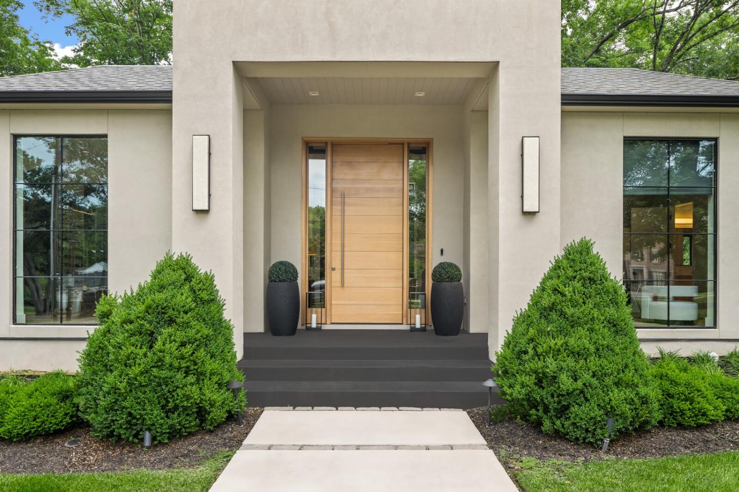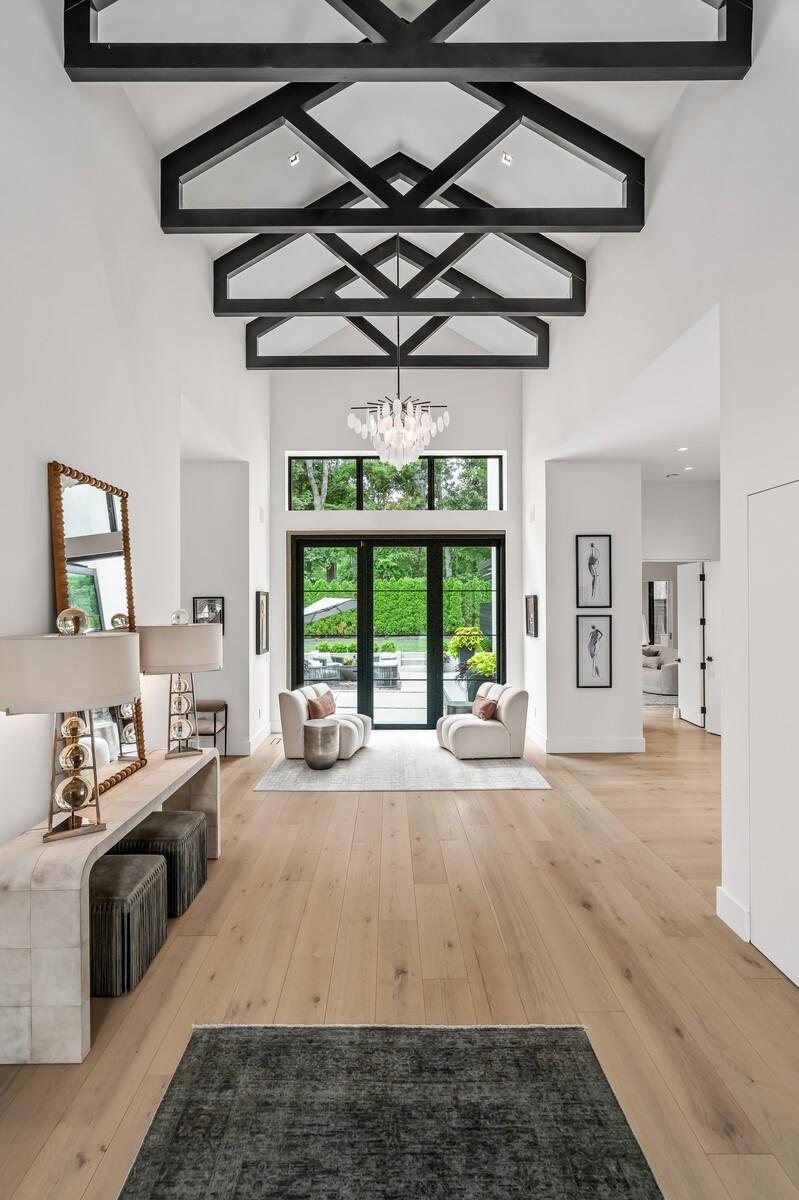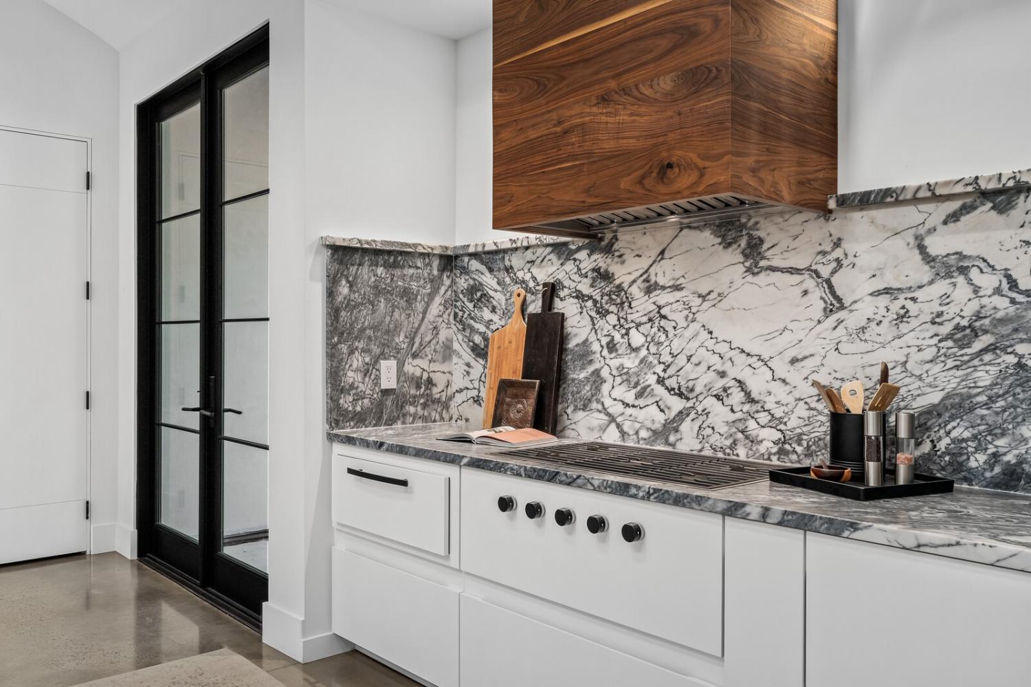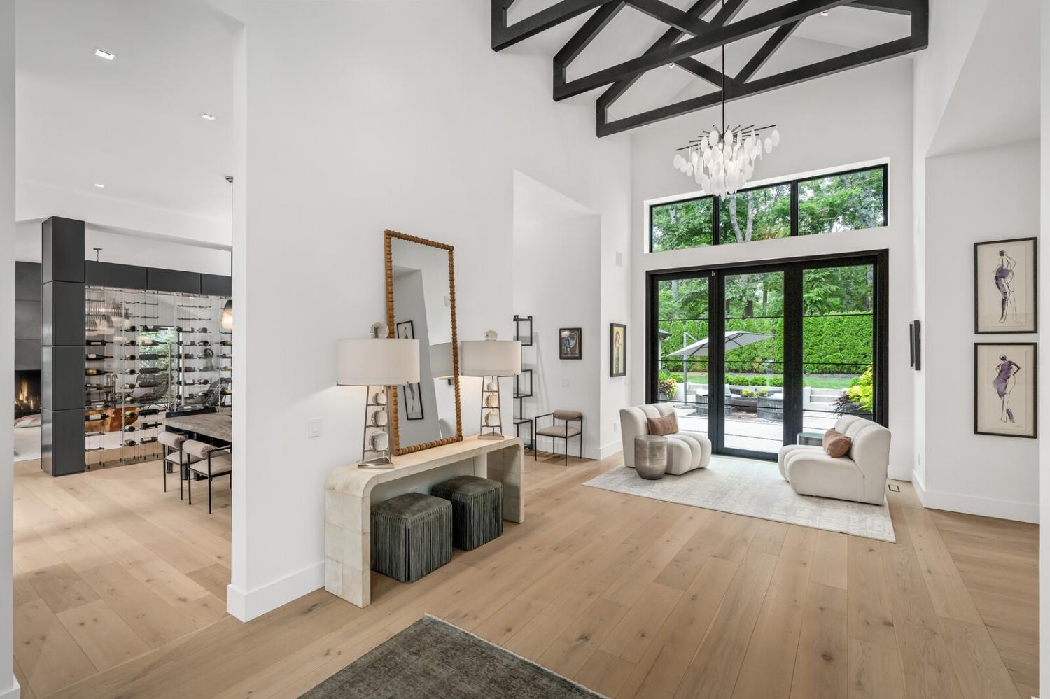 Welcome to a custom-designed contemporary real stucco masterpiece that offers an exquisite blend of luxury and modern elegance. As you enter through the impressive custom-designed walnut 10-foot pivot door, you are greeted by a breathtaking foyer with 18-foot high ceilings adorned with custom-designed decorative trusses. This grand entrance sets the stage for an open and inviting atmosphere. Architectural lighting and black steel-look Marvin windows and doors accentuate the modern aesthetic. The gourmet kitchen is a chef's delight, featuring Wolf appliances and a Fisher Paykel refrigerator/freezer combo. The centerpiece of the kitchen has Italian porcelain countertops on the island, complemented by leathered marble countertops around the periphery, featuring a 3-foot high backsplash with ledges in the style of Joseph Dirand. The kitchen's separate bar area, complete with a bar sink, wine refrigerator, and ice maker, is adorned with Scalamandre accent wallpaper. A custom walnut vent hood and integrated countertop on the island complete this culinary space. In the family room, enjoy the warmth and ambiance of a wood-burning fireplace with a convenient gas starter, illuminated by the elegant RH Emile chandelier. This space is perfect for movie nights, featuring built-in surround sound for an immersive experience by the fire. The temperature-controlled wine wall with seeded glass shelves adds a touch of sophistication, perfect for the discerning connoisseur. Retreat to the primary suite with its vaulted ceilings, decorative beams, and a gas fireplace. Enjoy the tranquility of a private built-in coffee bar, and luxuriate in the primary bath's huge walk-in shower with double rain heads and a two-person soaking tub overlooking a private zen garden. All guest bedrooms are thoughtfully designed, each featuring en suite bathrooms and large walk-in closets. Outside, enjoy seamless indoor-outdoor living with 13-foot accordion doors opening onto the courtyard.