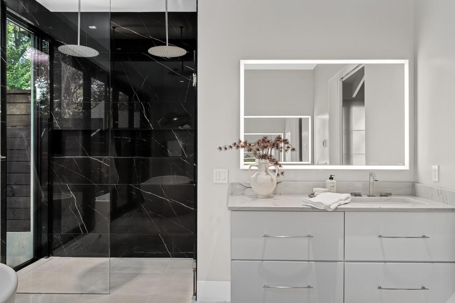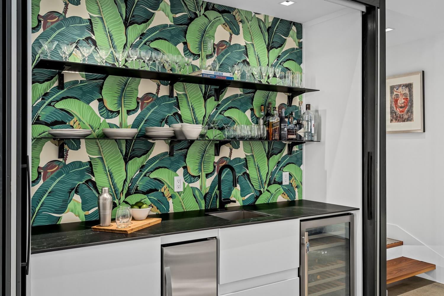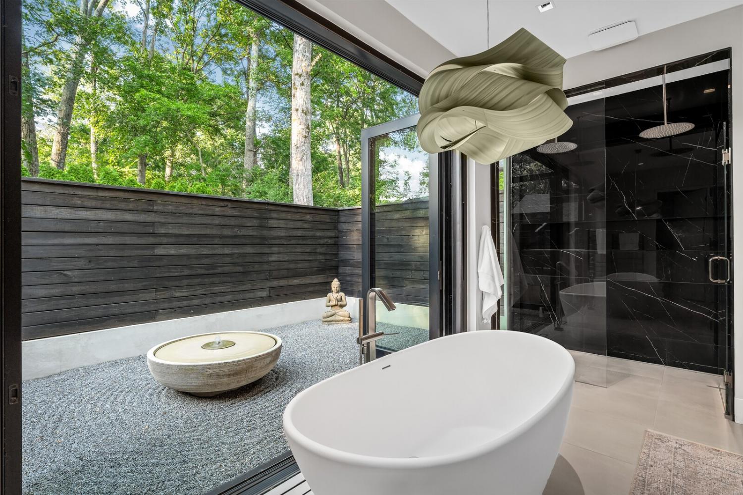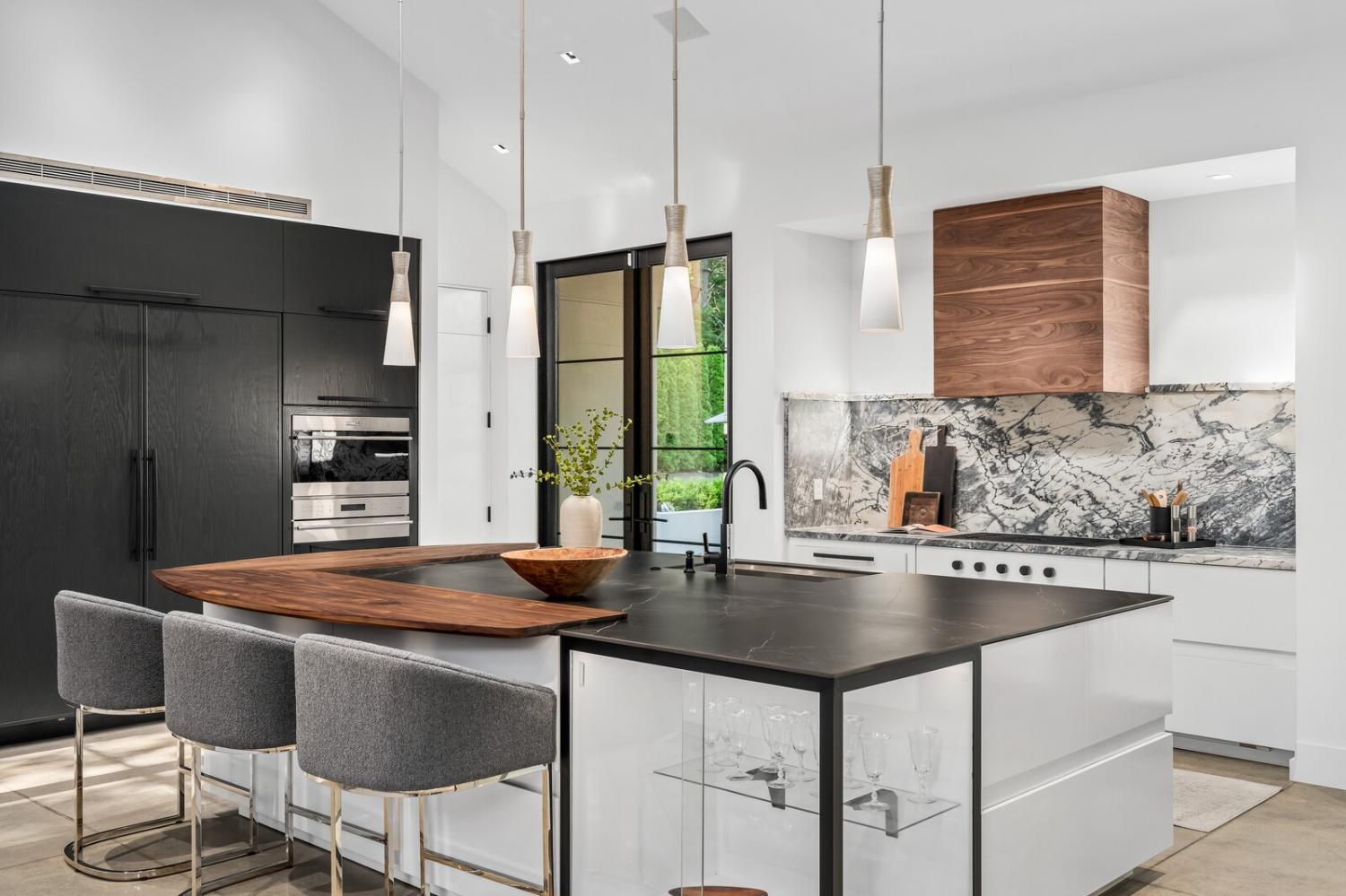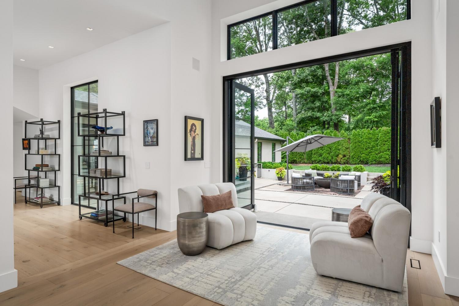 Welcome to a custom-designed contemporary real stucco masterpiece that offers an exquisite blend of luxury and modern elegance. As you enter through the impressive custom-designed walnut 10-foot pivot door, you are greeted by a breathtaking foyer with 18-foot high ceilings adorned with custom-designed decorative trusses. This grand entrance sets the stage for an open and inviting atmosphere. Architectural lighting and black steel-look Marvin windows and doors accentuate the modern aesthetic. The gourmet kitchen is a chef's delight, featuring Wolf appliances and a Fisher Paykel refrigerator/freezer combo. The centerpiece of the kitchen has Italian porcelain countertops on the island, complemented by leathered marble countertops around the periphery, featuring a 3-foot high backsplash with ledges in the style of Joseph Dirand. The kitchen's separate bar area, complete with a bar sink, wine refrigerator, and ice maker, is adorned with Scalamandre accent wallpaper. A custom walnut vent hood and integrated countertop on the island complete this culinary space. In the family room, enjoy the warmth and ambiance of a wood-burning fireplace with a convenient gas starter, illuminated by the elegant RH Emile chandelier. This space is perfect for movie nights, featuring built-in surround sound for an immersive experience by the fire. The temperature-controlled wine wall with seeded glass shelves adds a touch of sophistication, perfect for the discerning connoisseur. Retreat to the primary suite with its vaulted ceilings, decorative beams, and a gas fireplace. Enjoy the tranquility of a private built-in coffee bar, and luxuriate in the primary bath's huge walk-in shower with double rain heads and a two-person soaking tub overlooking a private zen garden. All guest bedrooms are thoughtfully designed, each featuring en suite bathrooms and large walk-in closets. Outside, enjoy seamless indoor-outdoor living with 13-foot accordion doors opening onto the courtyard.