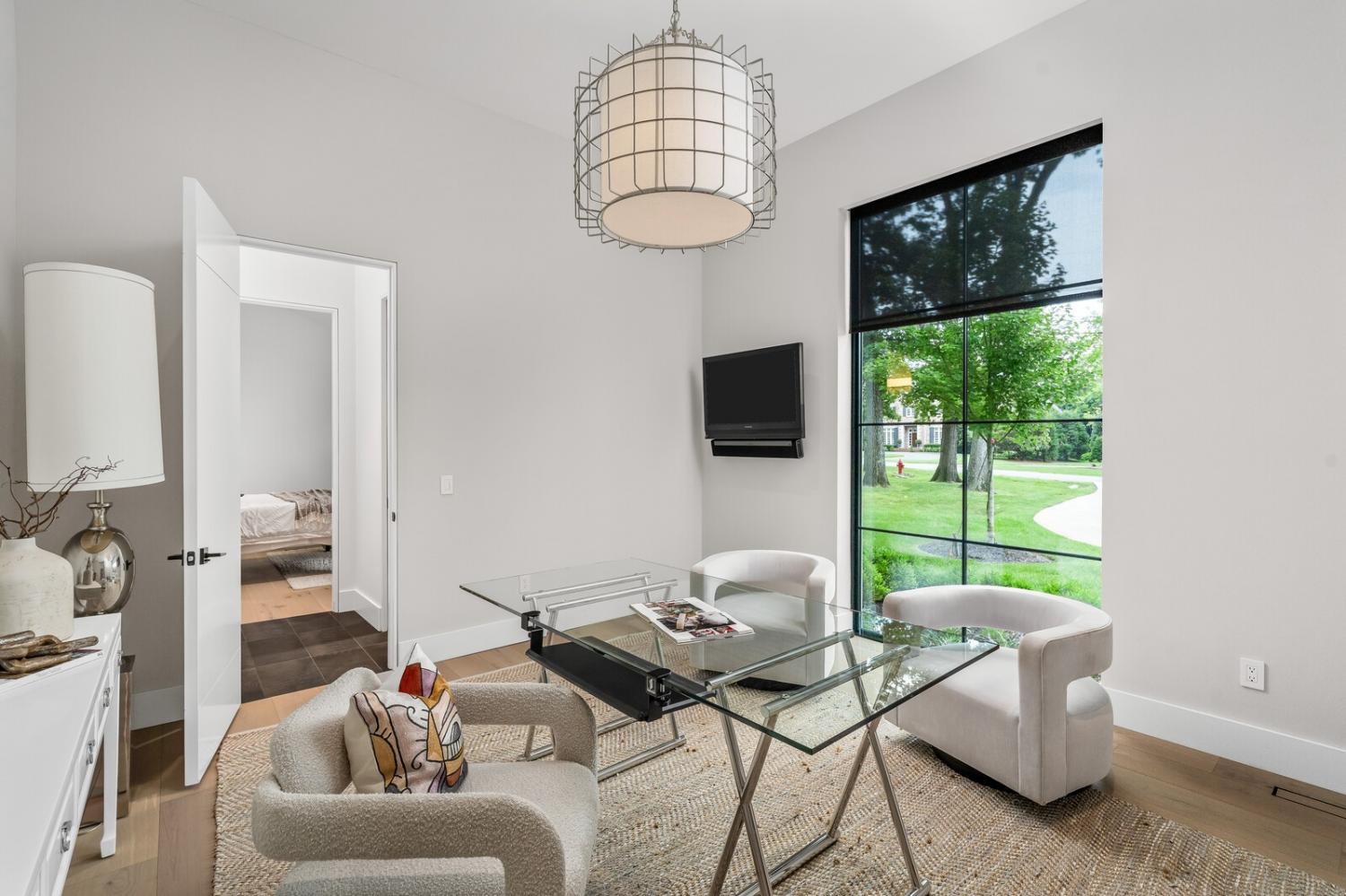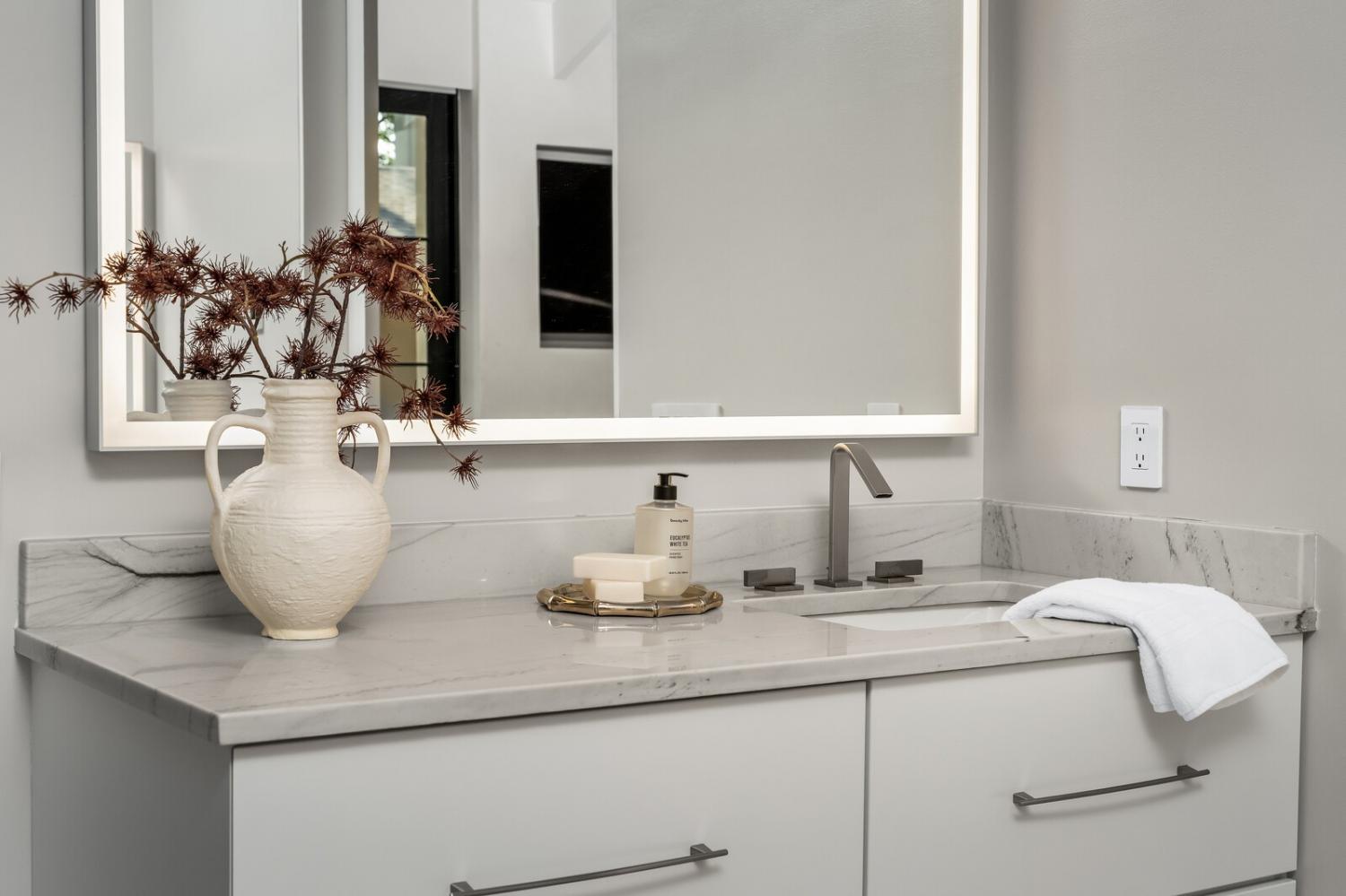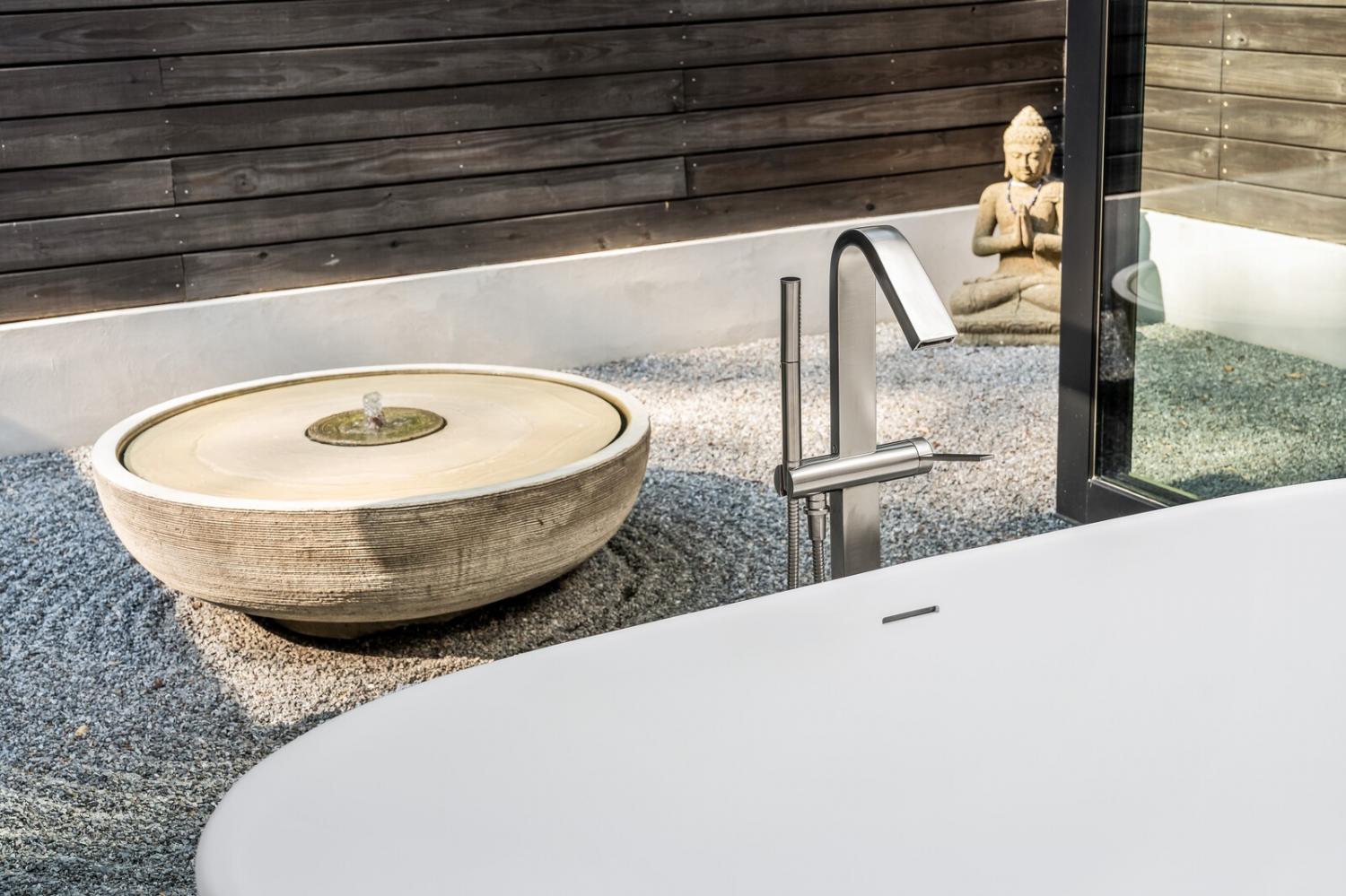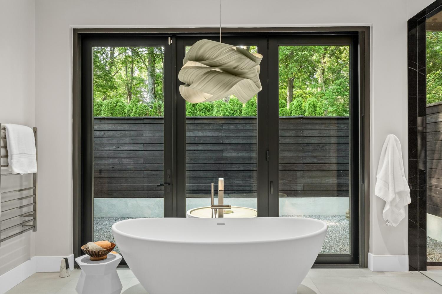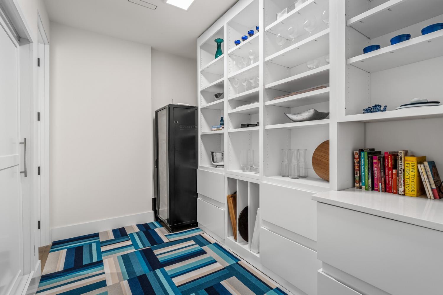 Welcome to a custom-designed contemporary real stucco masterpiece that offers an exquisite blend of luxury and modern elegance. As you enter through the impressive custom-designed walnut 10-foot pivot door, you are greeted by a breathtaking foyer with 18-foot high ceilings adorned with custom-designed decorative trusses. This grand entrance sets the stage for an open and inviting atmosphere. Architectural lighting and black steel-look Marvin windows and doors accentuate the modern aesthetic. The gourmet kitchen is a chef's delight, featuring Wolf appliances and a Fisher Paykel refrigerator/freezer combo. The centerpiece of the kitchen has Italian porcelain countertops on the island, complemented by leathered marble countertops around the periphery, featuring a 3-foot high backsplash with ledges in the style of Joseph Dirand. The kitchen's separate bar area, complete with a bar sink, wine refrigerator, and ice maker, is adorned with Scalamandre accent wallpaper. A custom walnut vent hood and integrated countertop on the island complete this culinary space. In the family room, enjoy the warmth and ambiance of a wood-burning fireplace with a convenient gas starter, illuminated by the elegant RH Emile chandelier. This space is perfect for movie nights, featuring built-in surround sound for an immersive experience by the fire. The temperature-controlled wine wall with seeded glass shelves adds a touch of sophistication, perfect for the discerning connoisseur. Retreat to the primary suite with its vaulted ceilings, decorative beams, and a gas fireplace. Enjoy the tranquility of a private built-in coffee bar, and luxuriate in the primary bath's huge walk-in shower with double rain heads and a two-person soaking tub overlooking a private zen garden. All guest bedrooms are thoughtfully designed, each featuring en suite bathrooms and large walk-in closets. Outside, enjoy seamless indoor-outdoor living with 13-foot accordion doors opening onto the courtyard.
