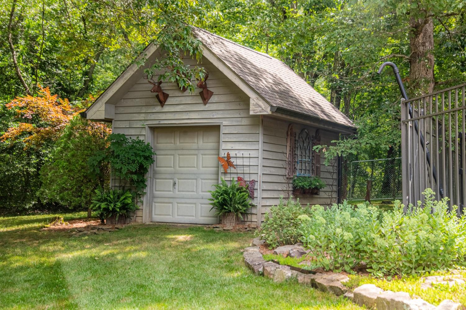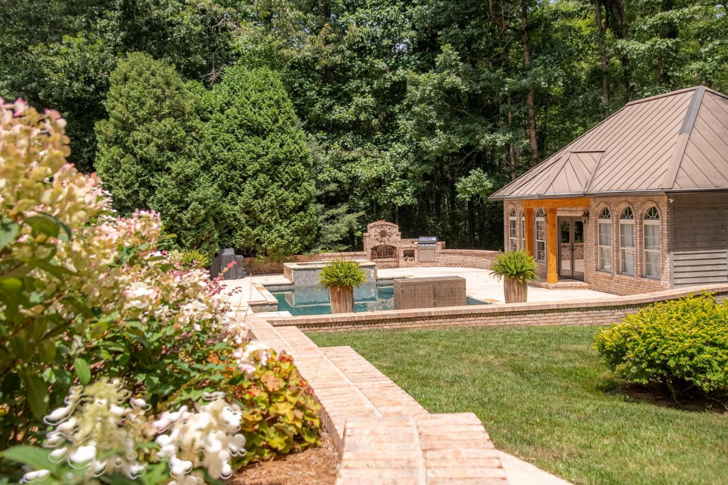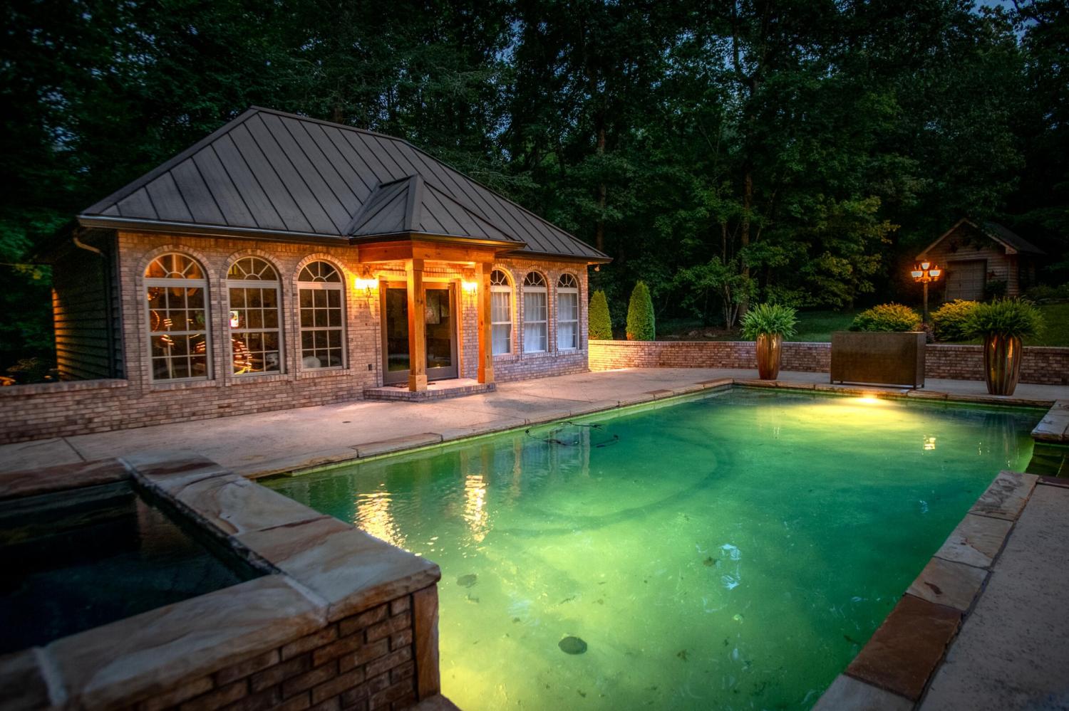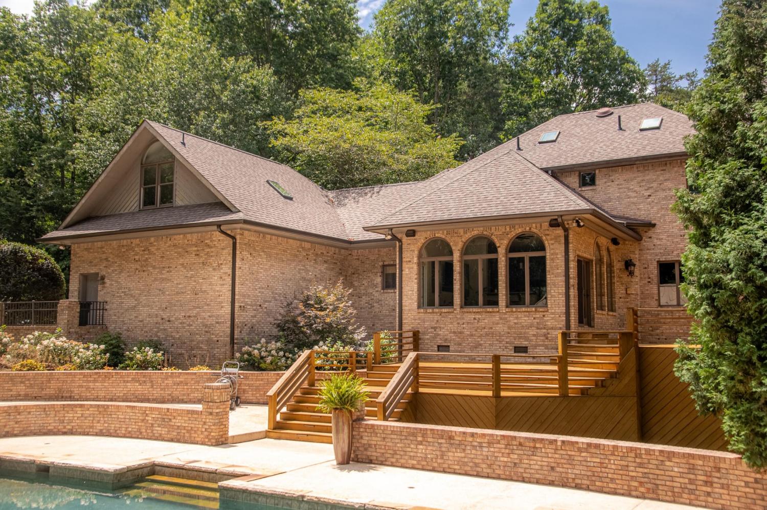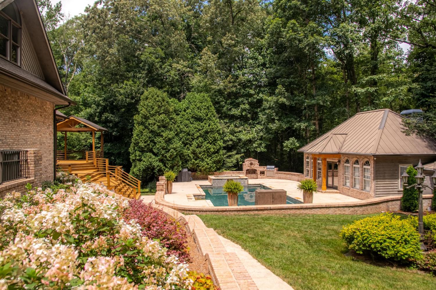Fabulous estate property on 3.3 acres in the heart of Signal Mountain, offers both privacy and luxurious resort style living. A long driveway through lush grounds leads you to the home. The all brick home features 10 foot ceilings, hardwood flooring, fireside den and living room, dining room, kitchen, office with built-ins, powder room, spacious primary bedroom on the main level with new Calacatta tile shower, chef's kitchen with Viking, Wolf and Kitchen Aid appliances, custom cabinetry and granite countertops. A most inviting sunrom overlooks the salt water pool, spa, 3 tiered decking with Pergola, outdoor fireplace, gathering and grilling area and pool/guest house - a true oasis to come home to! Upstairs are 2 additonal bedrooms each with ensuite bath. A separate stairway leads to the light filled 4th bedroom/bonus room and bath. There is a main level 3 car garage and a lower level gym/workshop. The main house has 3,989 square feet with an additional 584 square feet in the lower level gym space. The 710 square foot poolside studio guest house offers a fireside living area, kitchen with all Kitchen Aid Appliances and Laundry and 5th bedroom and bath. The grounds are truly stunning - and so very private. a year round spring runs parallel to the back yard for added privacy. Beautiful hardwood trees and native plants provide a lush setting. There is a charming garden shed in the backyard and an additonal building with garage door that has a car lift for working on cars/storage and workshop. The entire backyard is fenced and there is a separate fenced area for dogs. Zoned for top rated Signal Mountain schools, 72 Cool Springs is more than a home, it is a lifestyle!