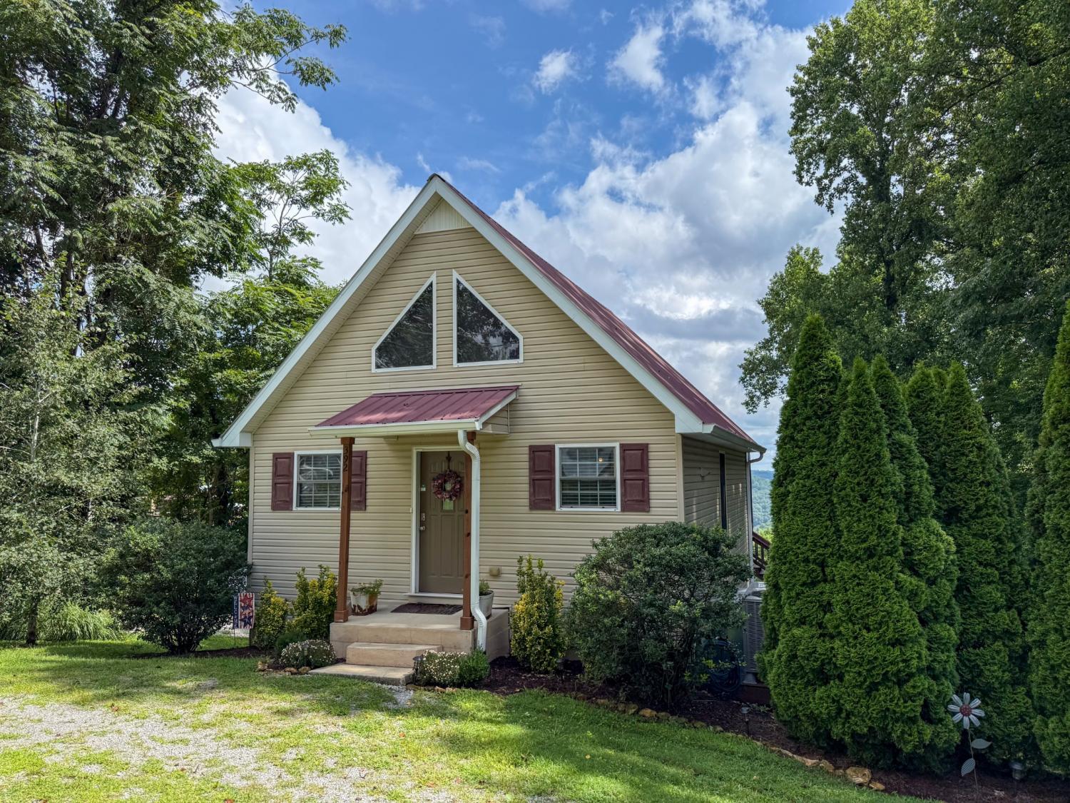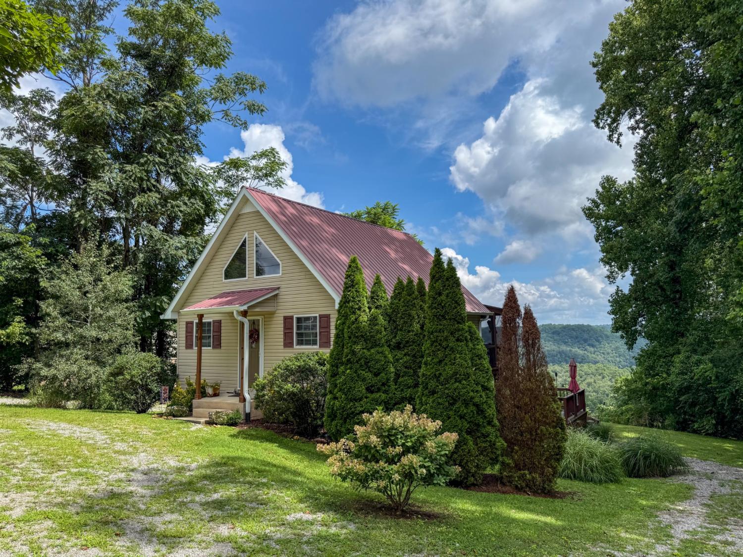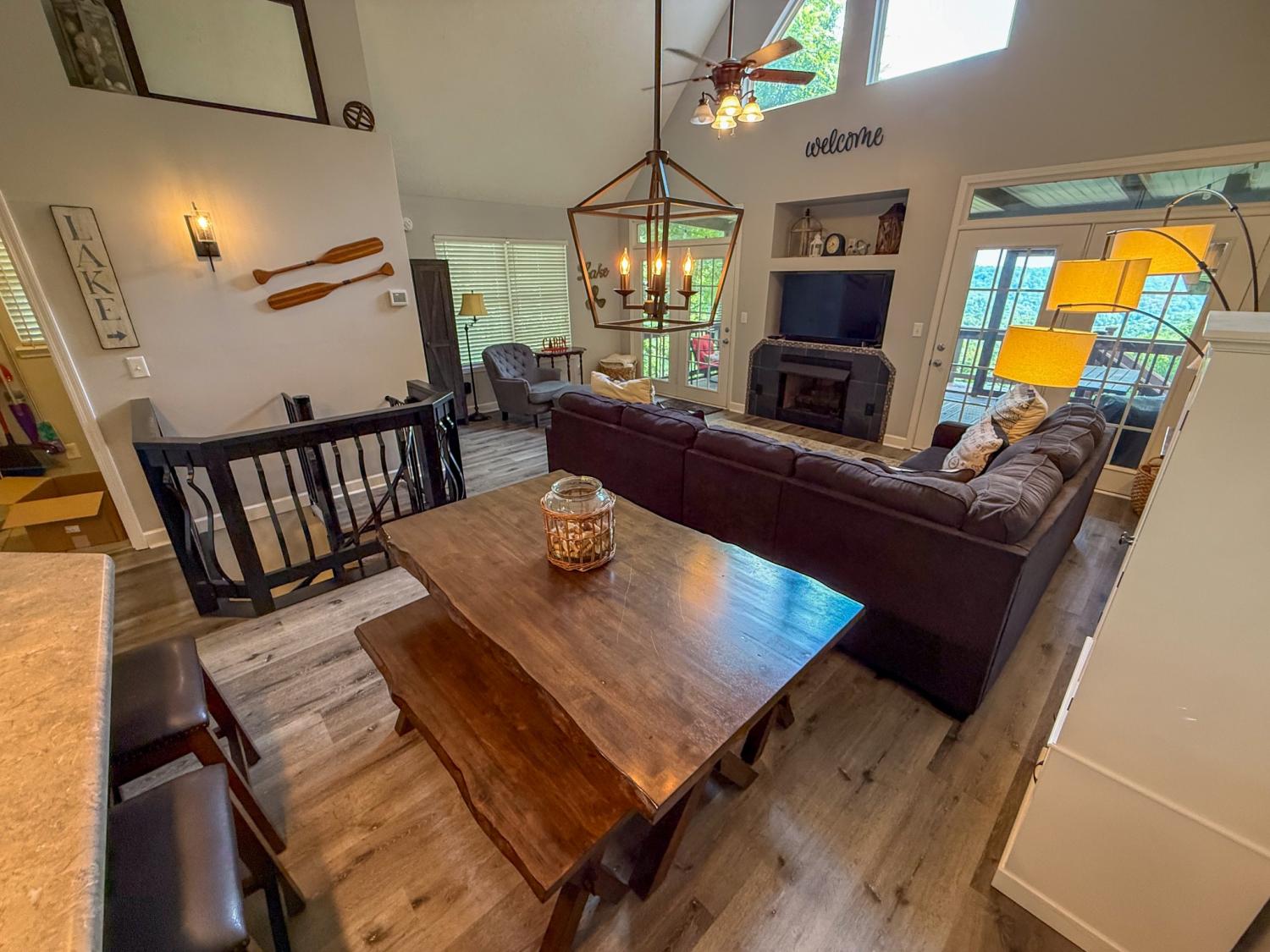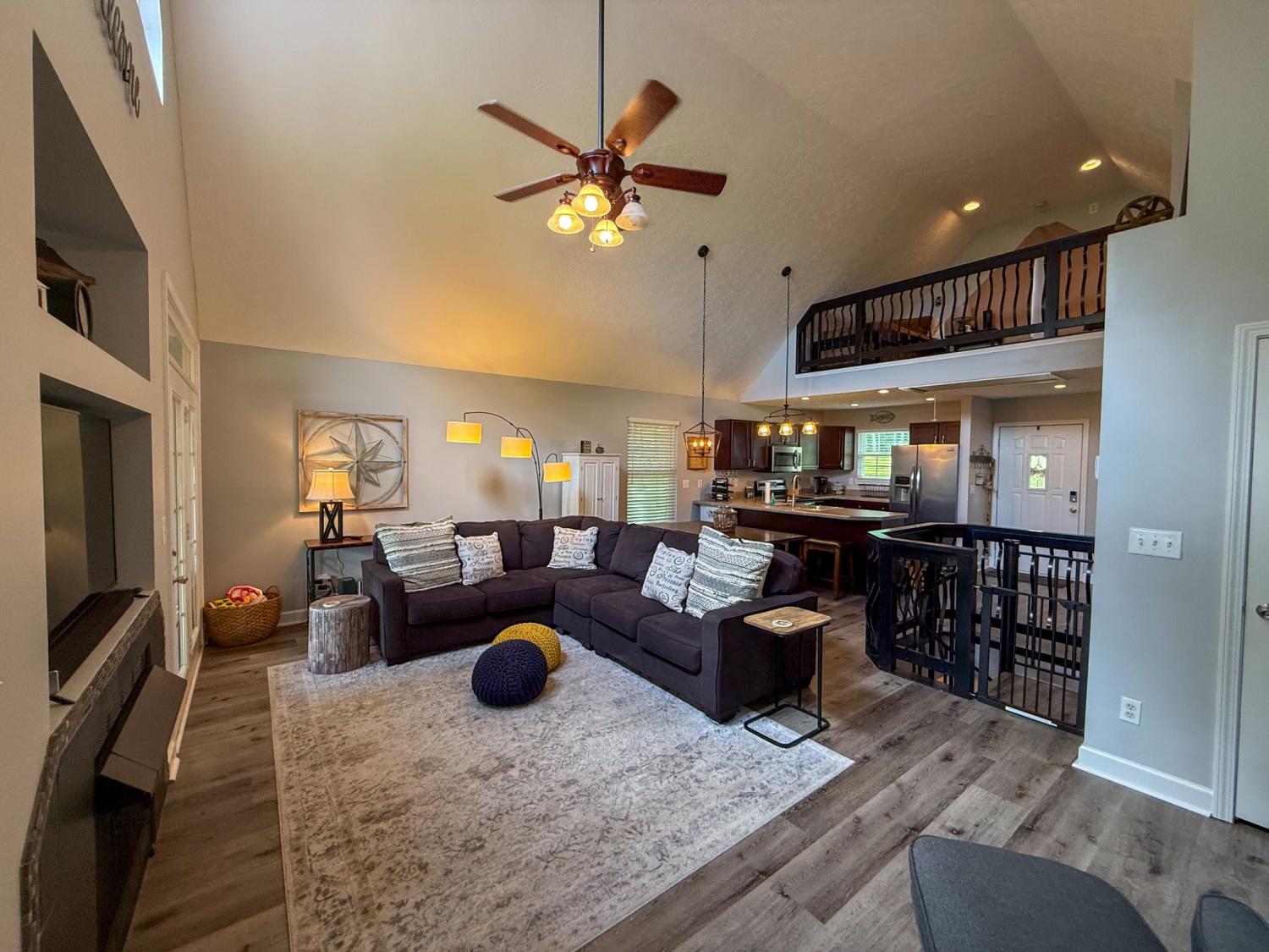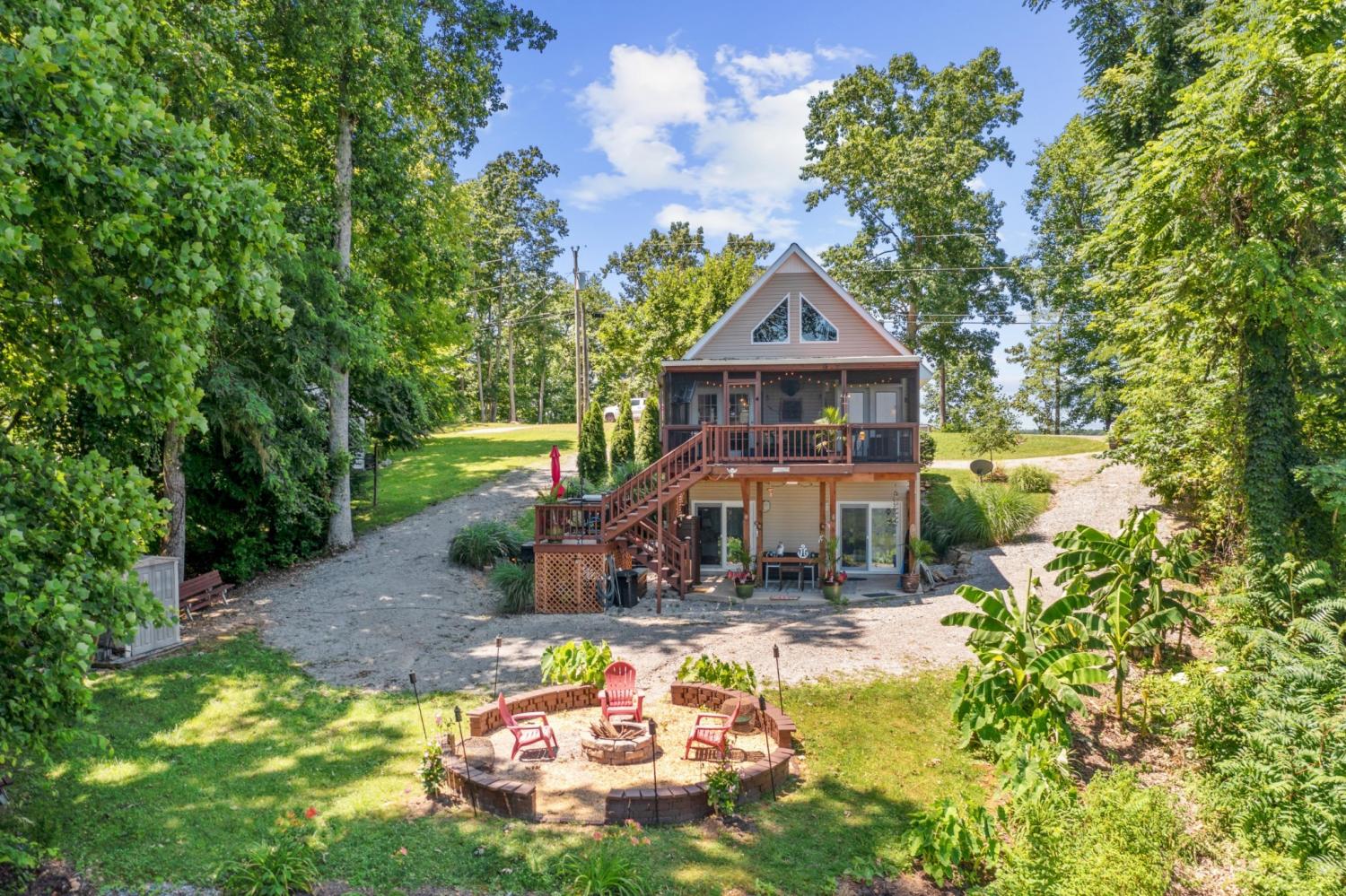 Outstanding Center Hill Lake home with year-round water views! This beautifully furnished 3-bedroom, 2.5-bath home features a spacious sleeping loft, an open-concept living area with a cozy fireplace, and stainless steel appliances. Enjoy peace of mind with a brand new HVAC unit, new gutters, and updated deck boards — perfect for relaxing or entertaining. The home also includes a newly installed SONOS sound system, creating the ideal atmosphere for hosting guests on the large covered porches with sweeping mountain and lake views. Unwind by the backyard fire pit or take advantage of two expansive circular driveways offering plenty of space for guest and boat parking. Located just 5 minutes from the neighborhood boat launch and 15 minutes from Hurricane Marina, this home offers the perfect balance of comfort, convenience, and lake life living. It also has great potential as a turn-key STR. All furnishings and items convey with the home.