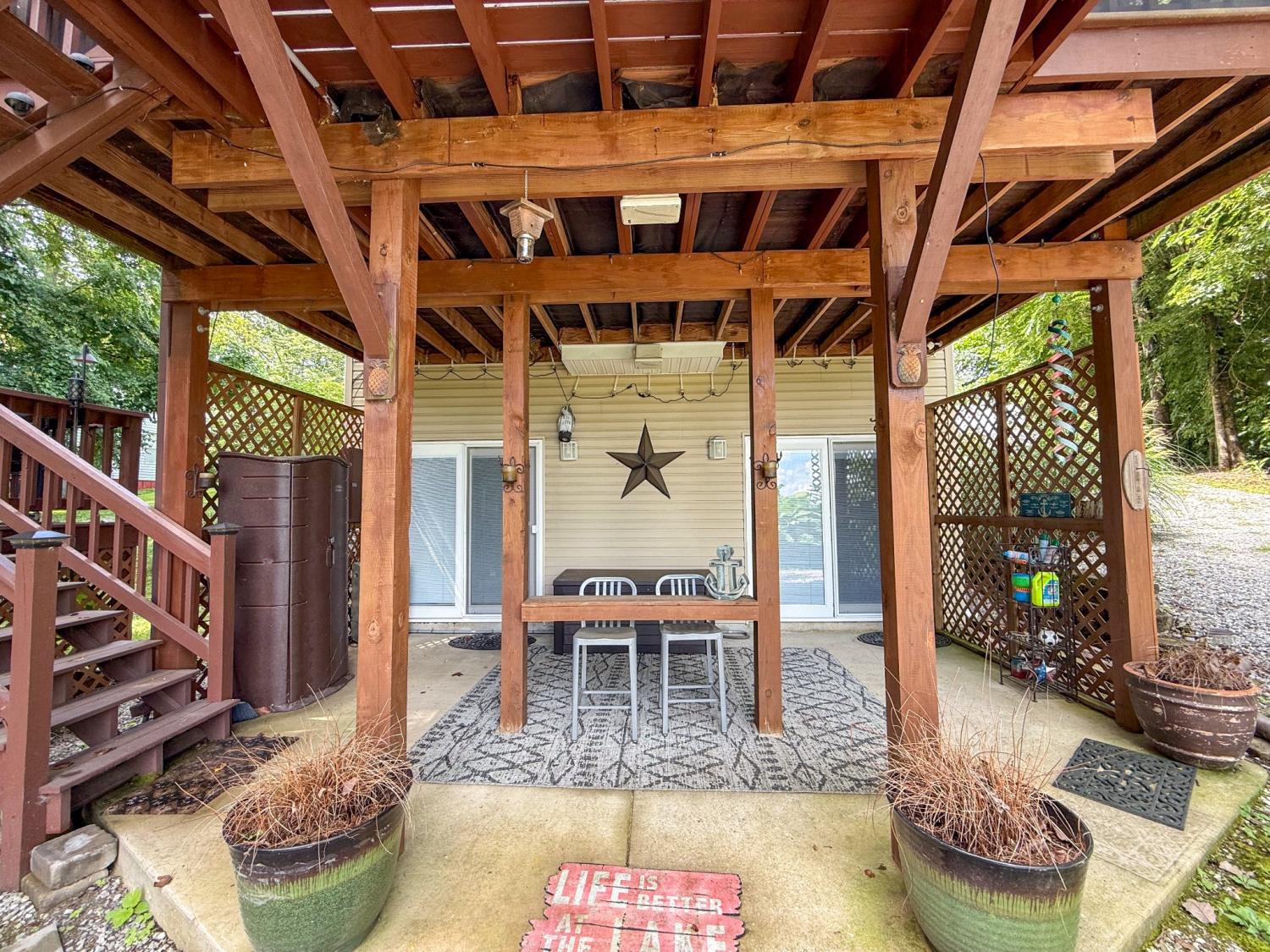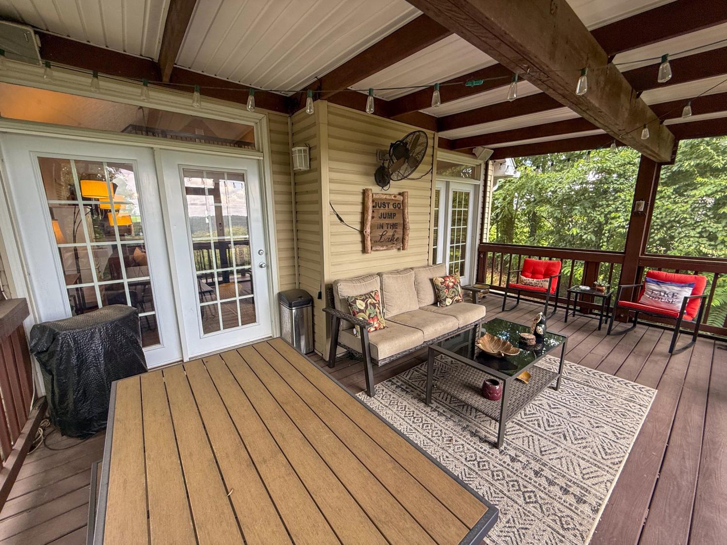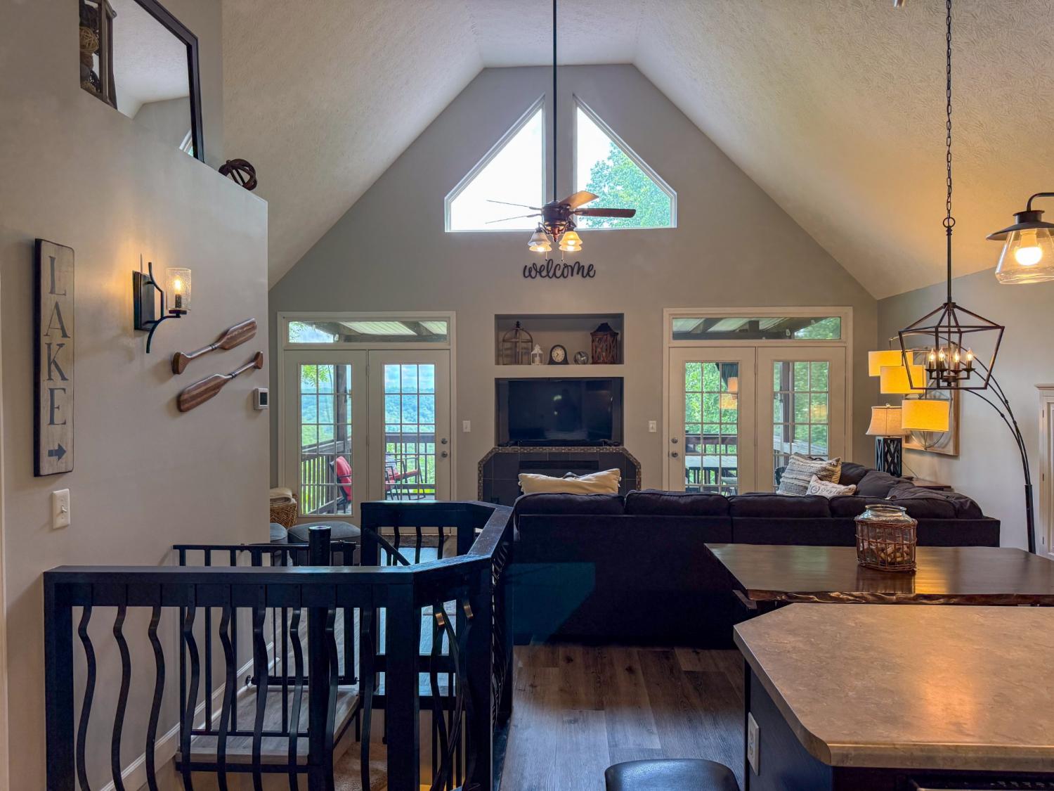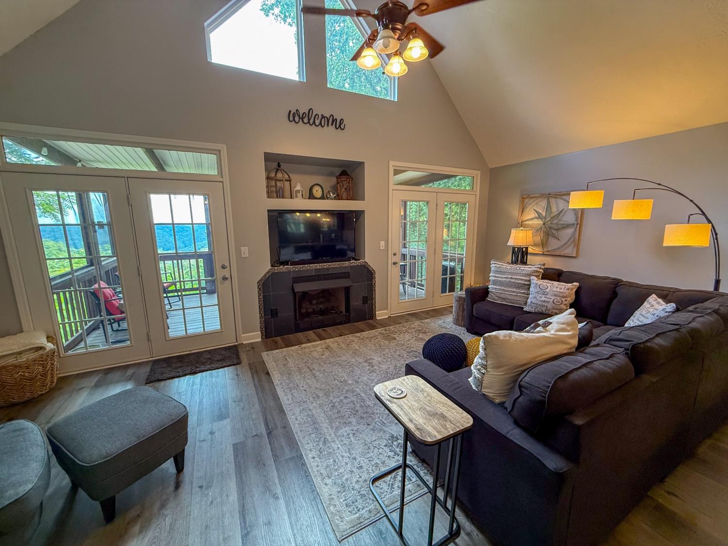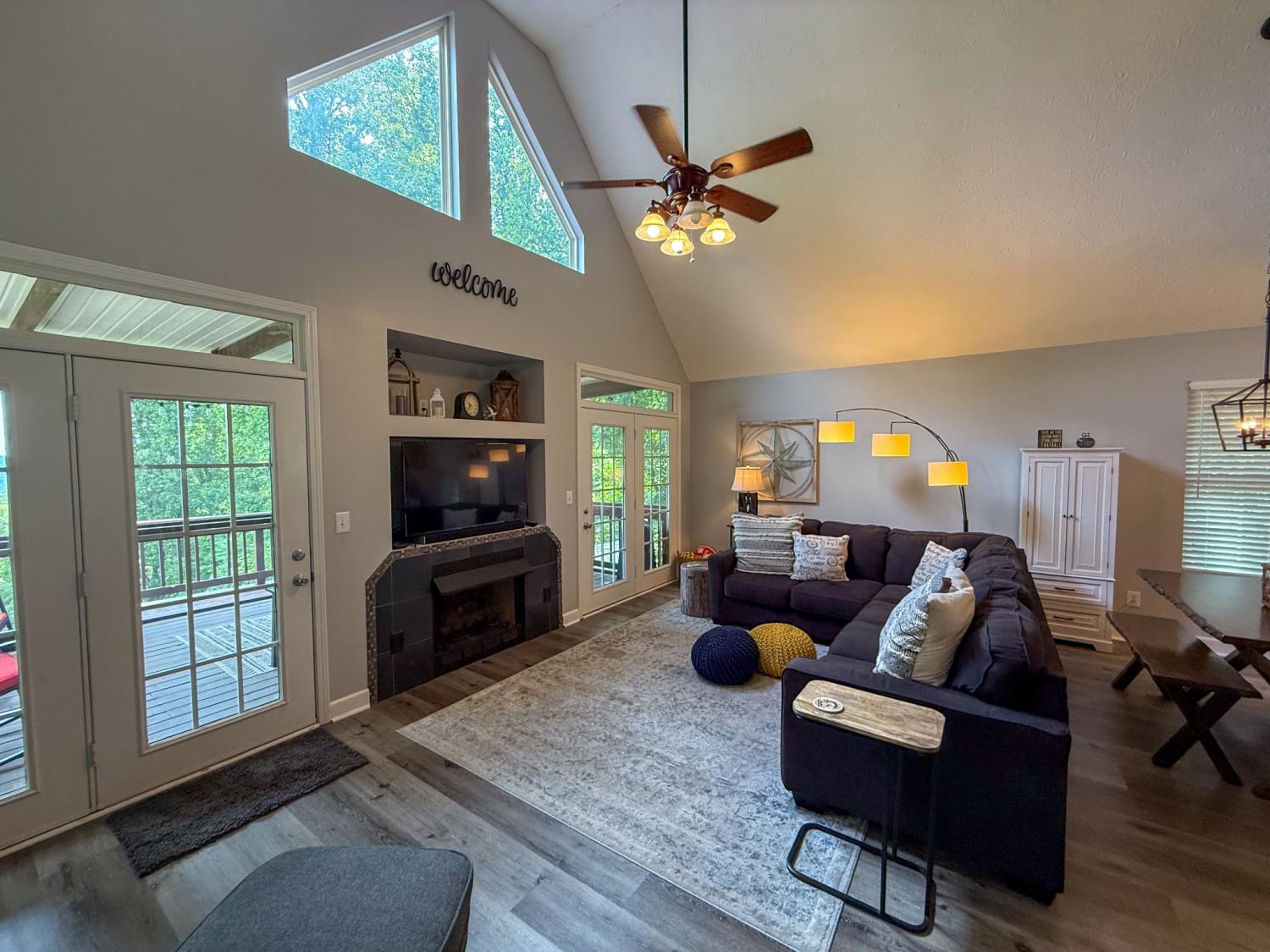 Outstanding Center Hill Lake home with year-round water views! This beautifully furnished 3-bedroom, 2.5-bath home features a spacious sleeping loft, an open-concept living area with a cozy fireplace, and stainless steel appliances. Enjoy peace of mind with a brand new HVAC unit, new gutters, and updated deck boards — perfect for relaxing or entertaining. The home also includes a newly installed SONOS sound system, creating the ideal atmosphere for hosting guests on the large covered porches with sweeping mountain and lake views. Unwind by the backyard fire pit or take advantage of two expansive circular driveways offering plenty of space for guest and boat parking. Located just 5 minutes from the neighborhood boat launch and 15 minutes from Hurricane Marina, this home offers the perfect balance of comfort, convenience, and lake life living. It also has great potential as a turn-key STR. All furnishings and items convey with the home.